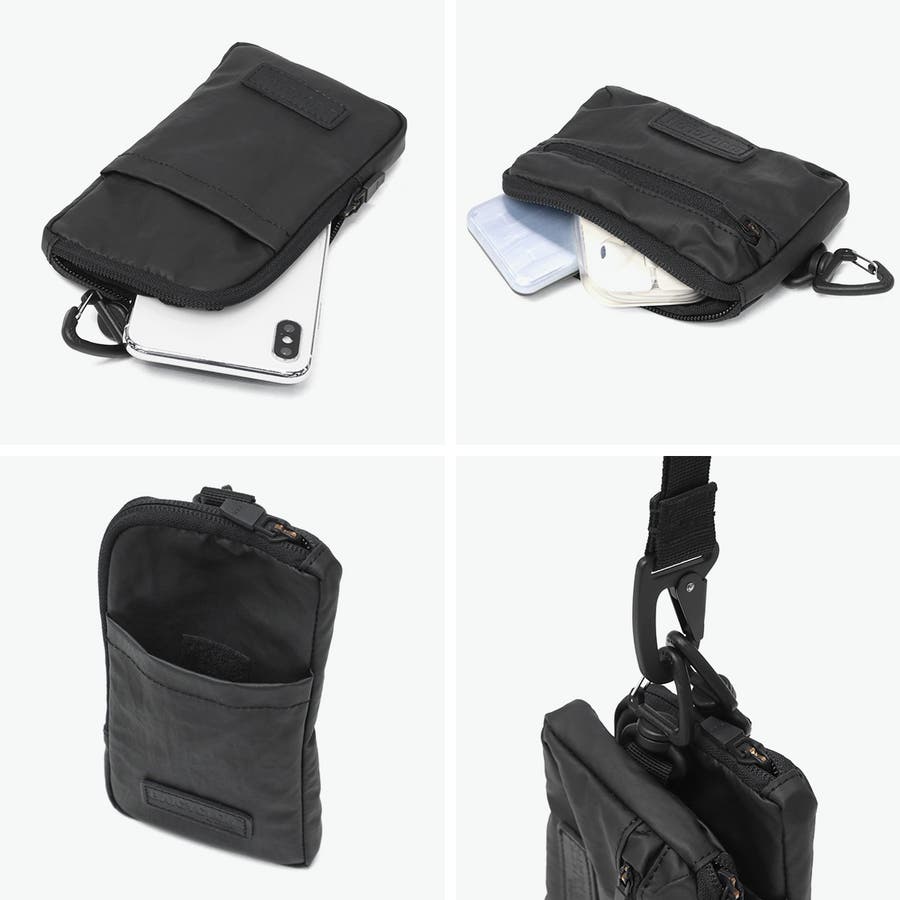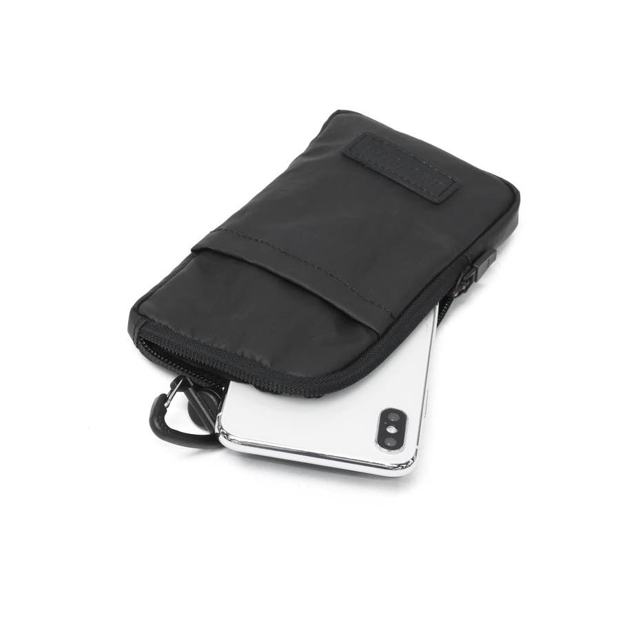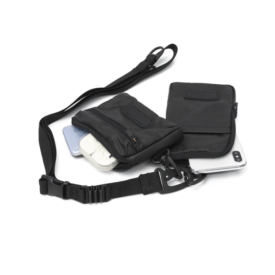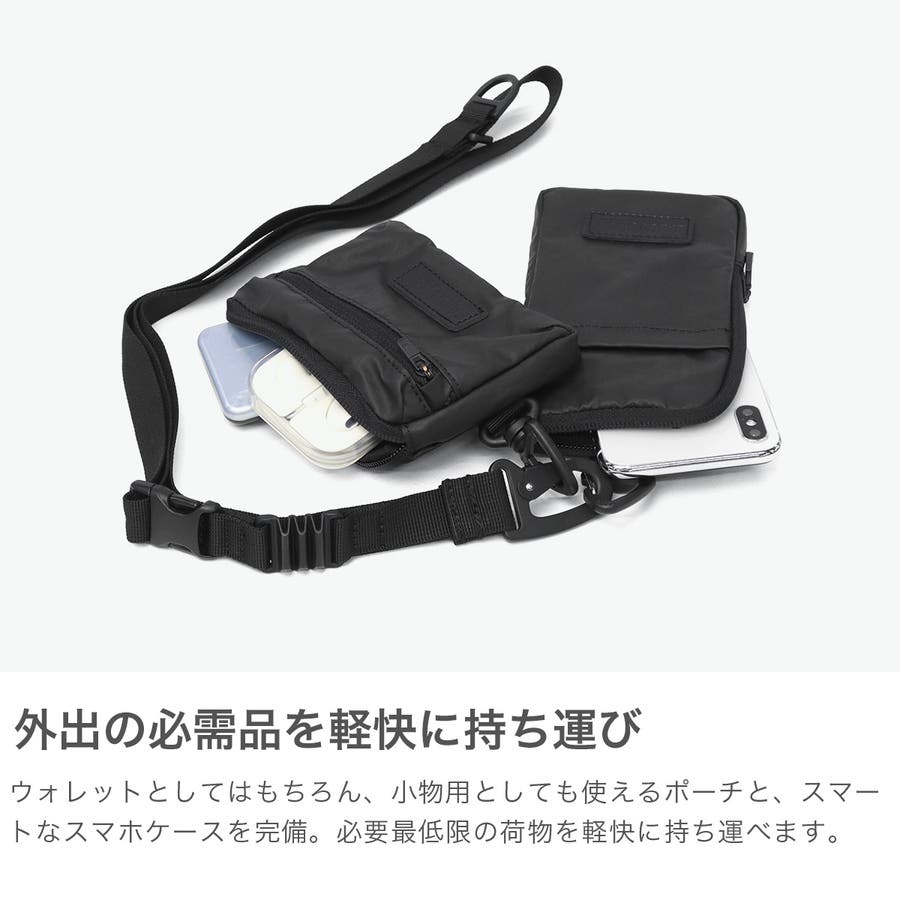 小銭や小物が収納できるポーチと、スマートフォンケースを組み合わせたショルダーポーチ。ポーチは、フックパーツを内側に隠すことで、単体でも使用可能。スマートフォンケースの裏地にはクッション性のある素材を使用し、衝撃からしっかり保護します。