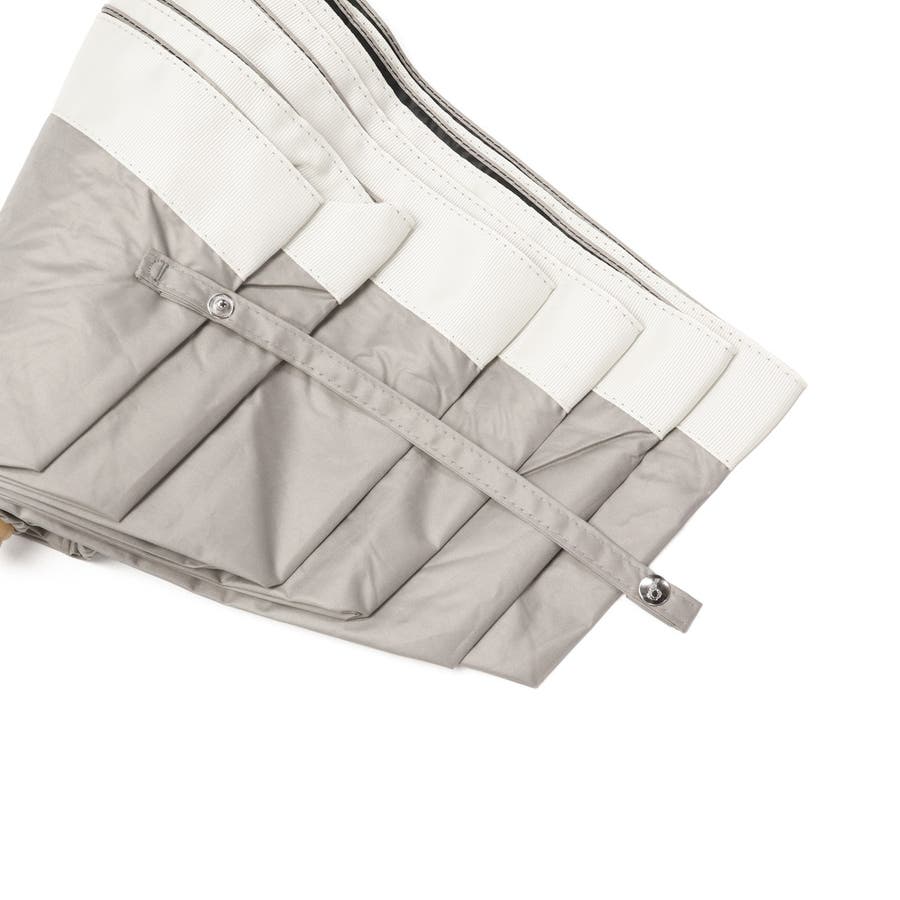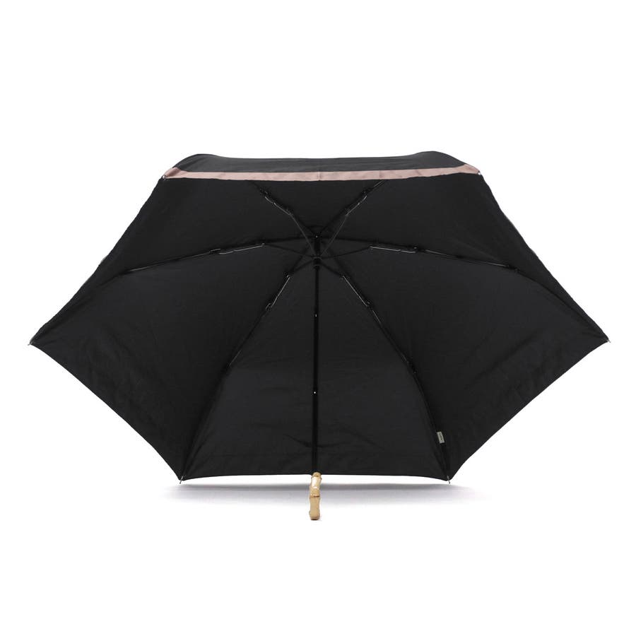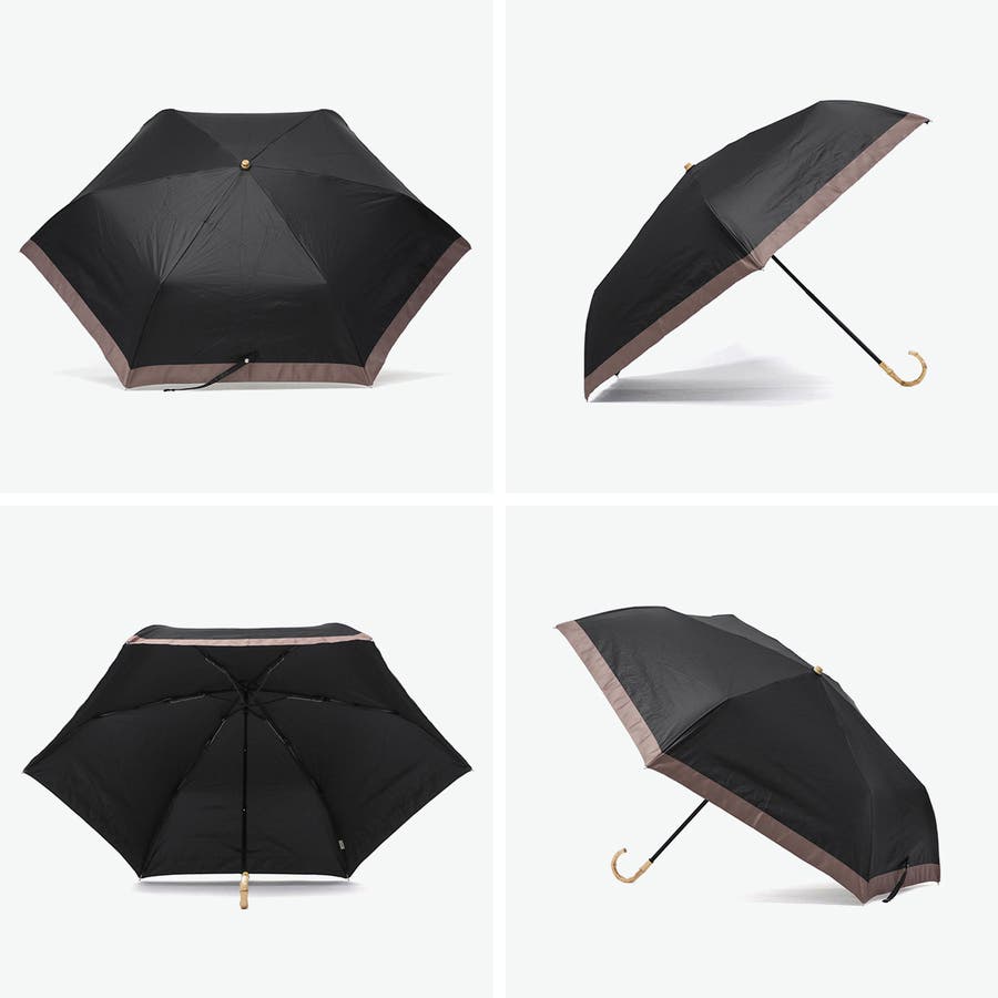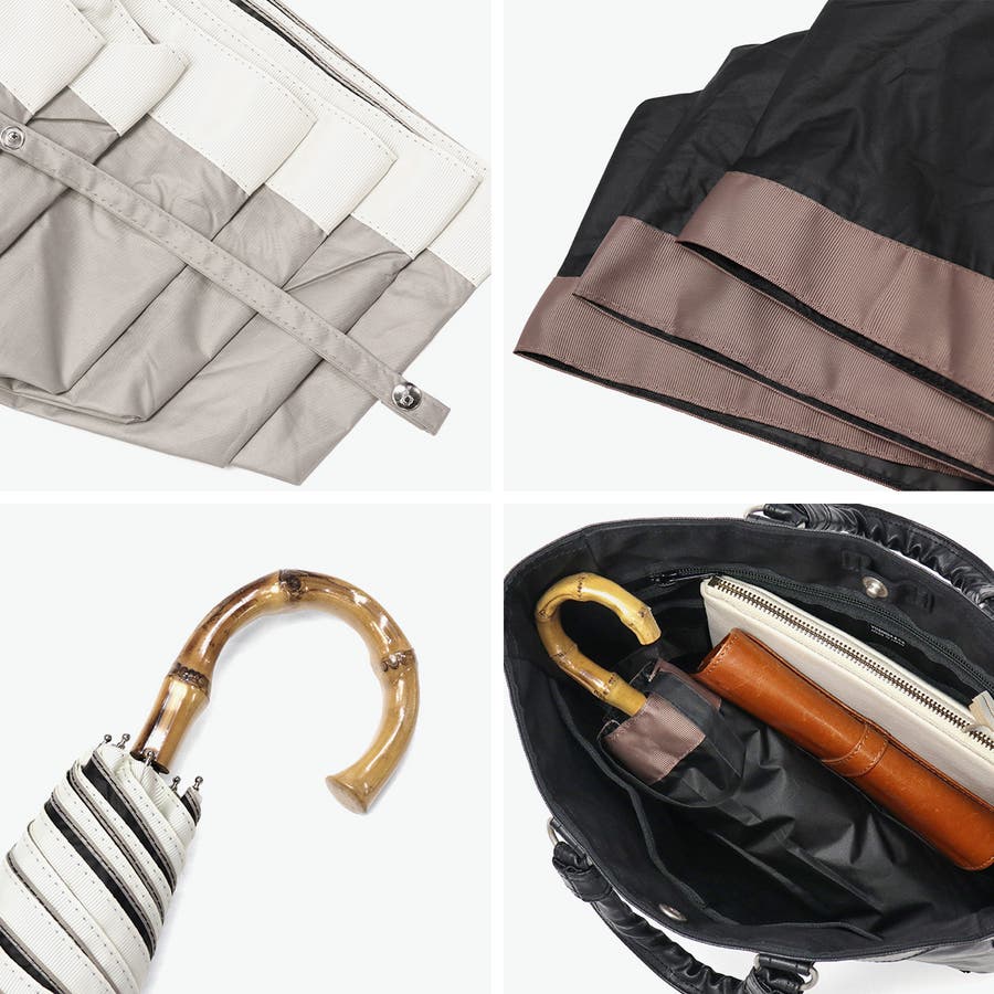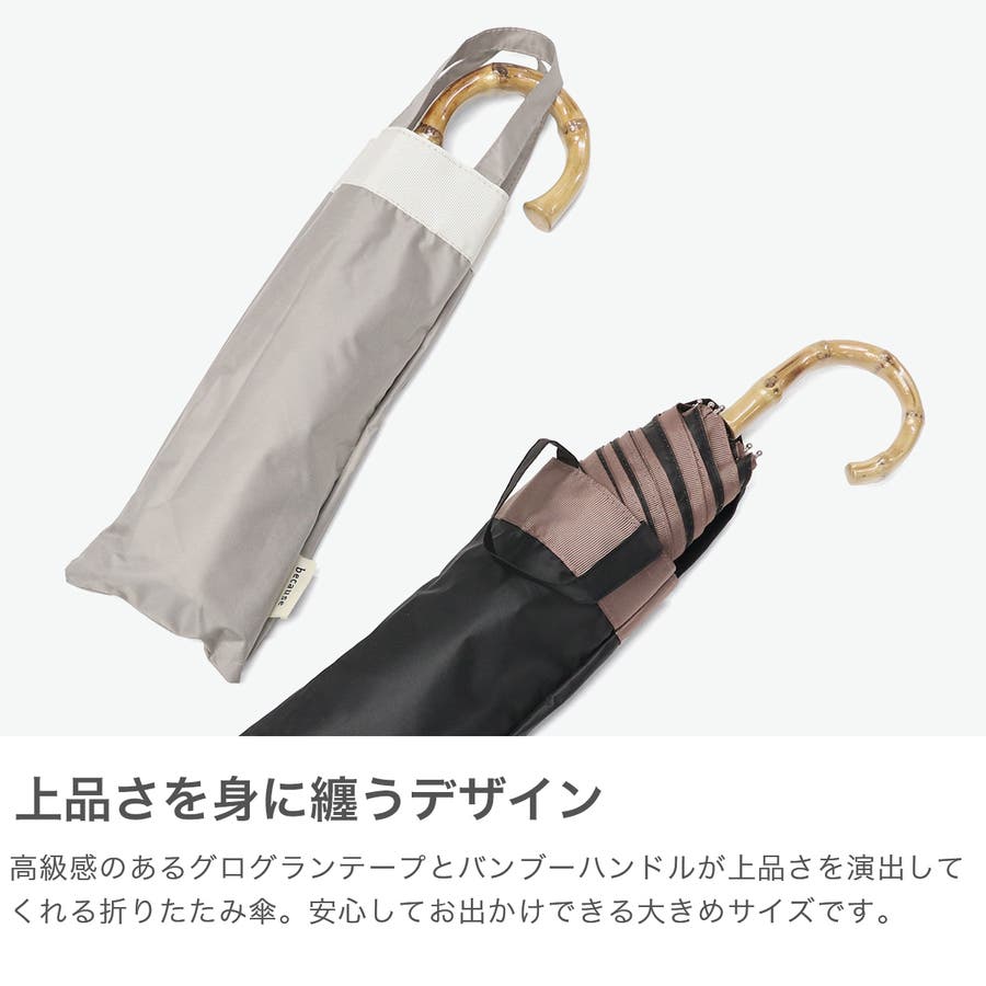 グログランテープと高級感のあるバンブーハンドルが上品さを演出してくれる晴雨兼用の折りたたみ傘です。UVカット率100%の完全遮光生地を使用し、裏面にはPUコーティング加工を施す事で100%の遮光率を実現。デザインと機能性を兼ね備えた1本で、晴れの日も雨の日もエレガントに彩ります。