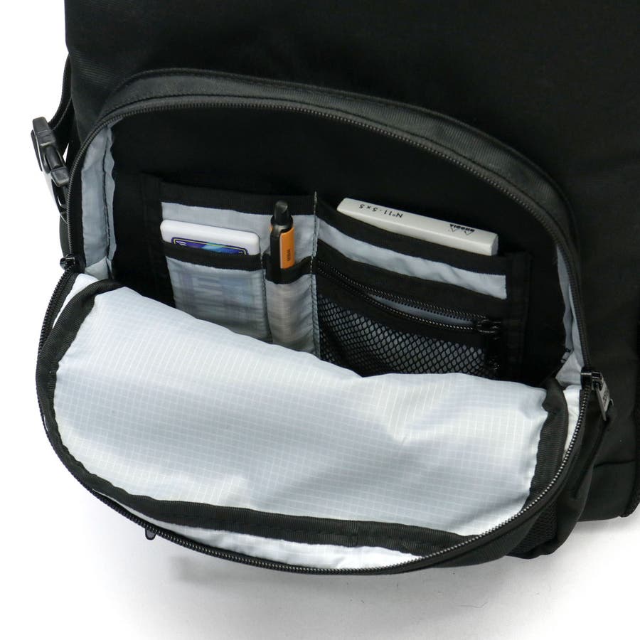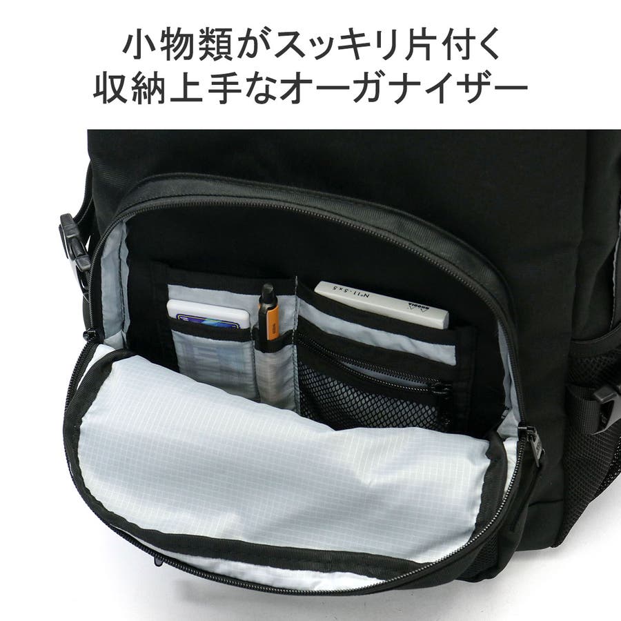 本体はB4サイズが収まるサイズ感で、15inchまでのPCに対応したスリーブ付き。フロントのオーガナイザーポケットには小物類を仕分けて収納でき、荷物がスッキリと片付きます。メッシュポケットで見せる収納を楽しめるところもポイント。さらに、背面にはセキュリティ性の高いシークレットポケットを装備し、お財布などの貴重品管理も安心なつくりになっています。