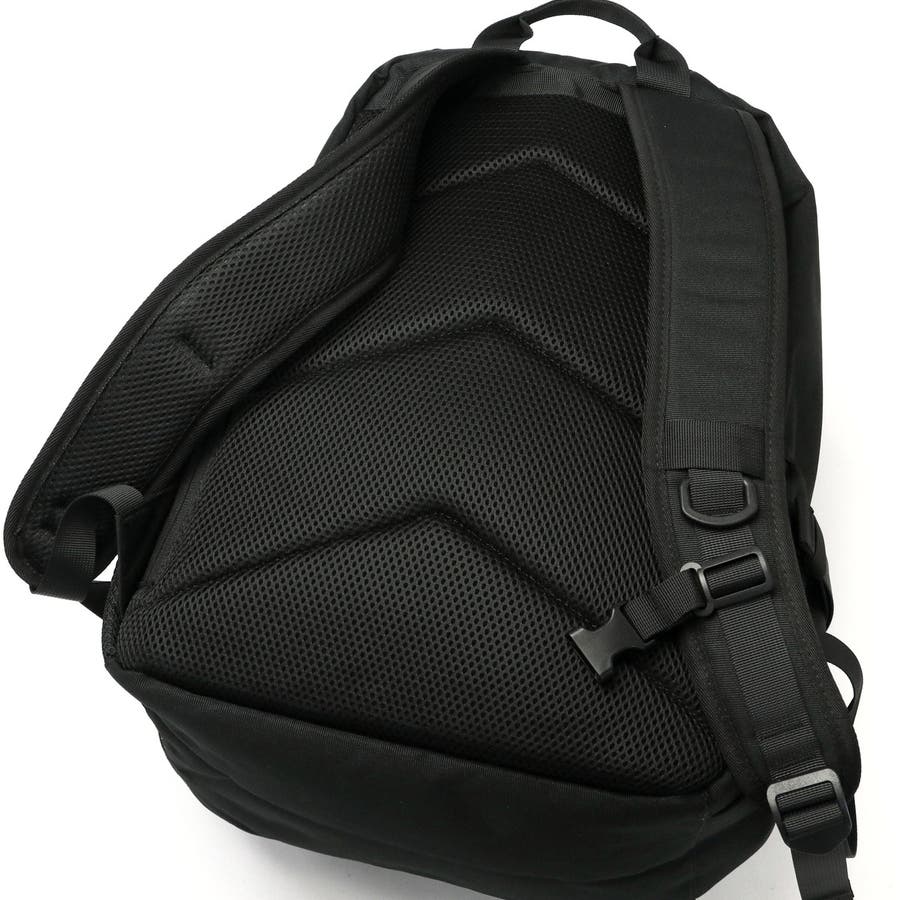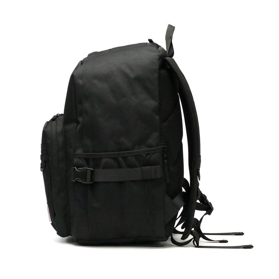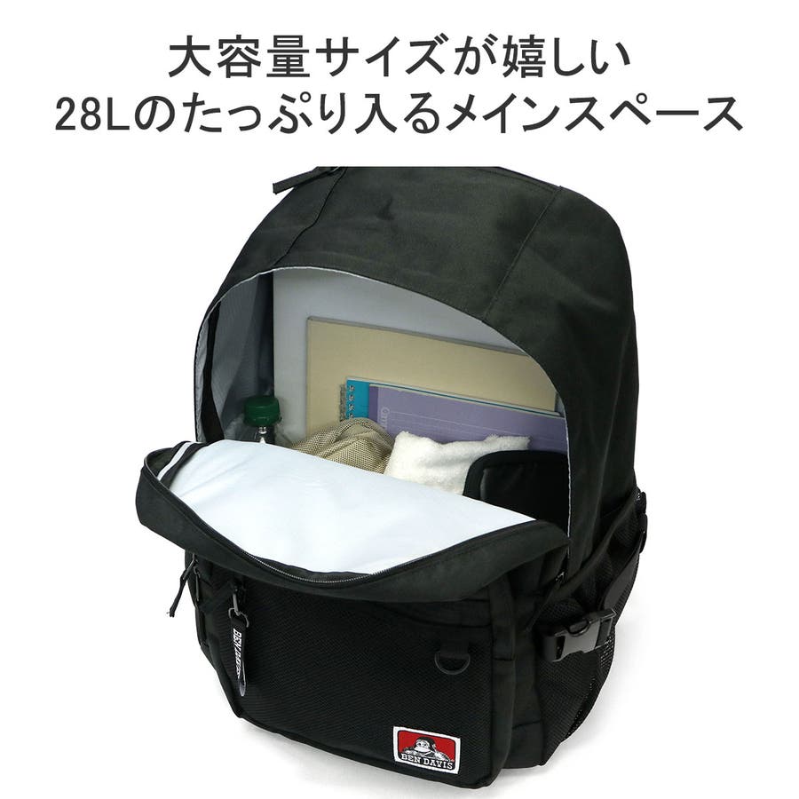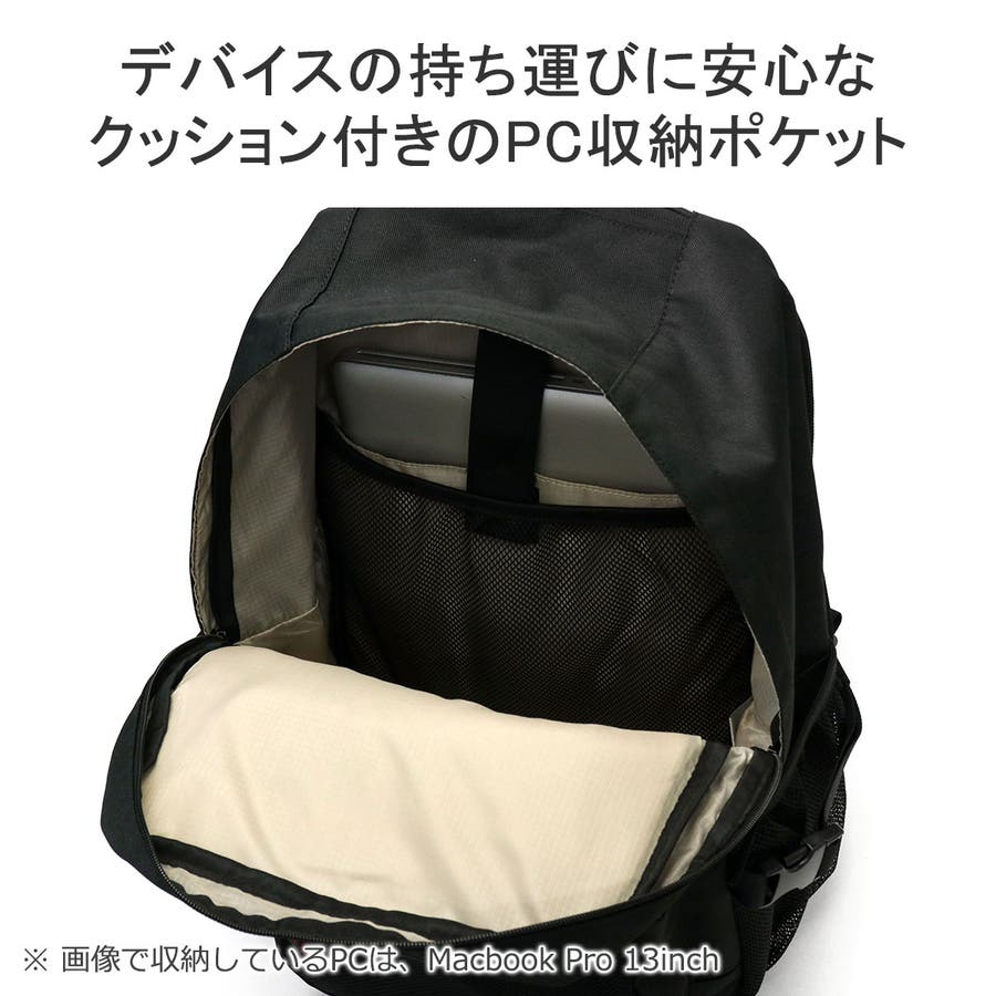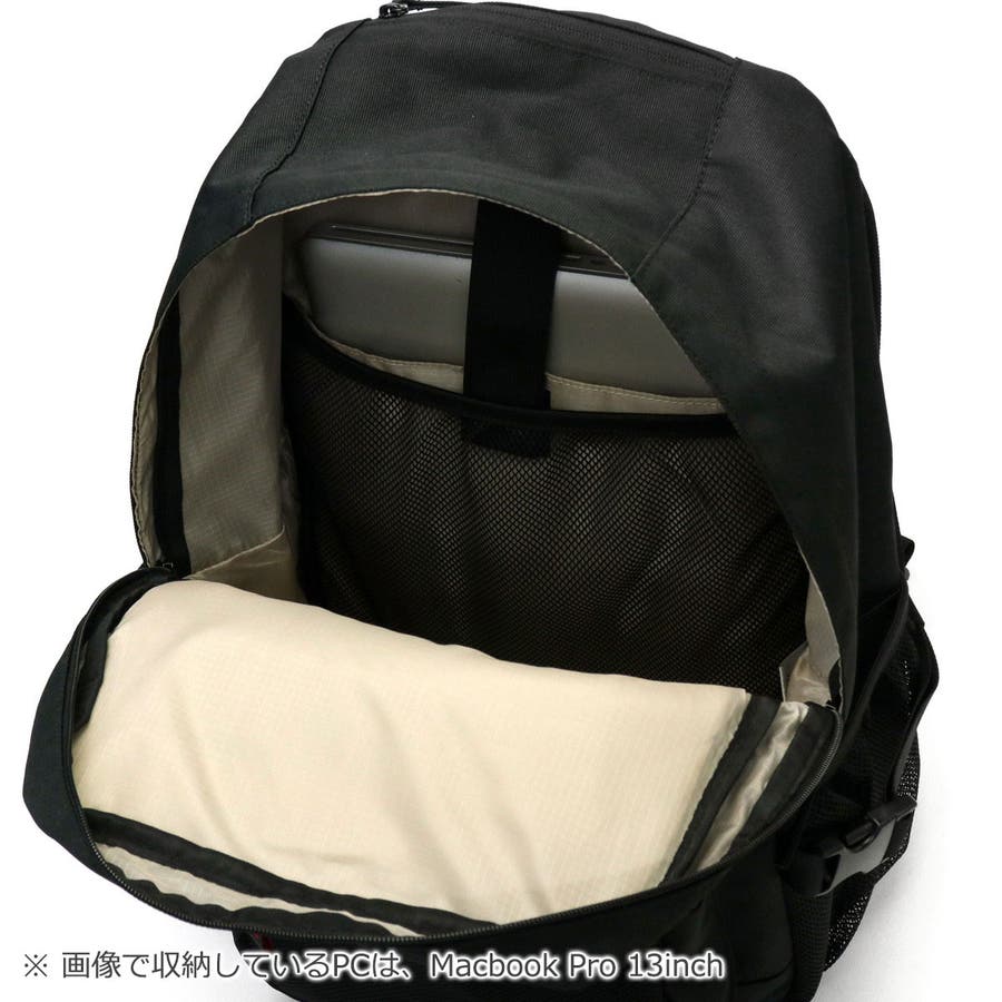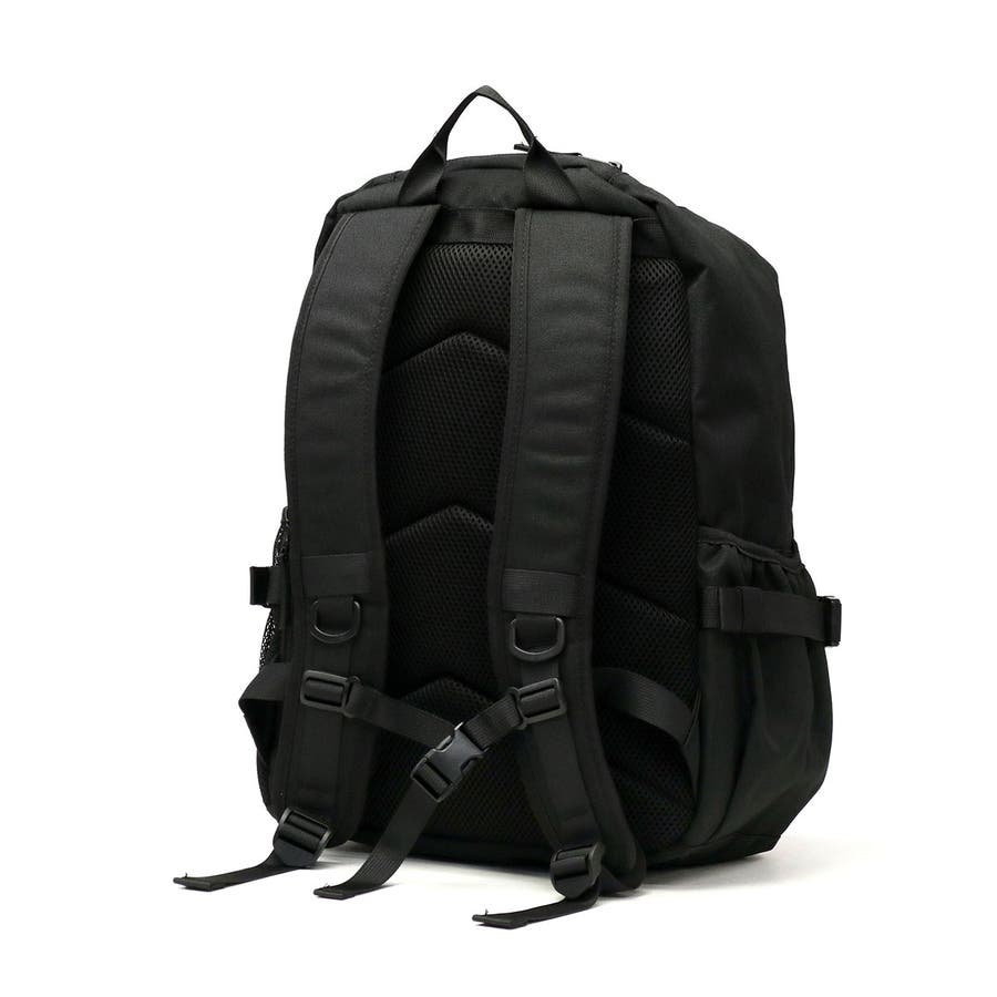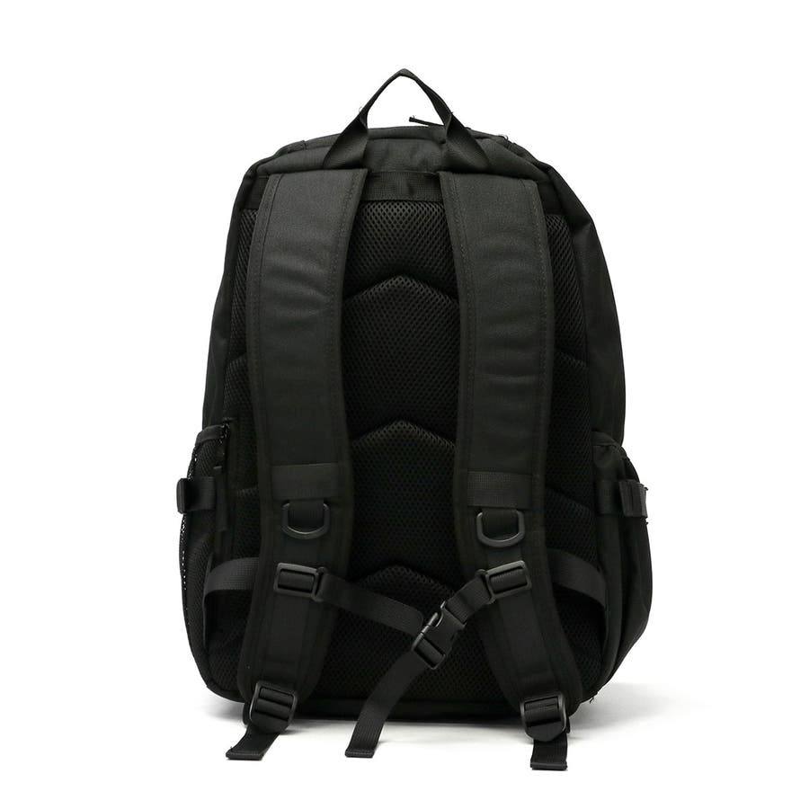 黒をベースとした生地に、ロゴ刺繍とミニロゴテープのアクセントが効いたデイパック。本体は28Lの容量を備え、撥水加工が施されているほか、機能的なポケットを複数配置した使い勝手の良さが魅力です。また、付属のポーチはミラー機能とカード収納を搭載しており、いつでも身だしなみのチェックが可能。ポーチは本体トップのサブスペースに収納して必要なときにサッと取り出せます。通学や休日のお出かけ、1泊程度の小旅行にも活躍するマルチなアイテムです。