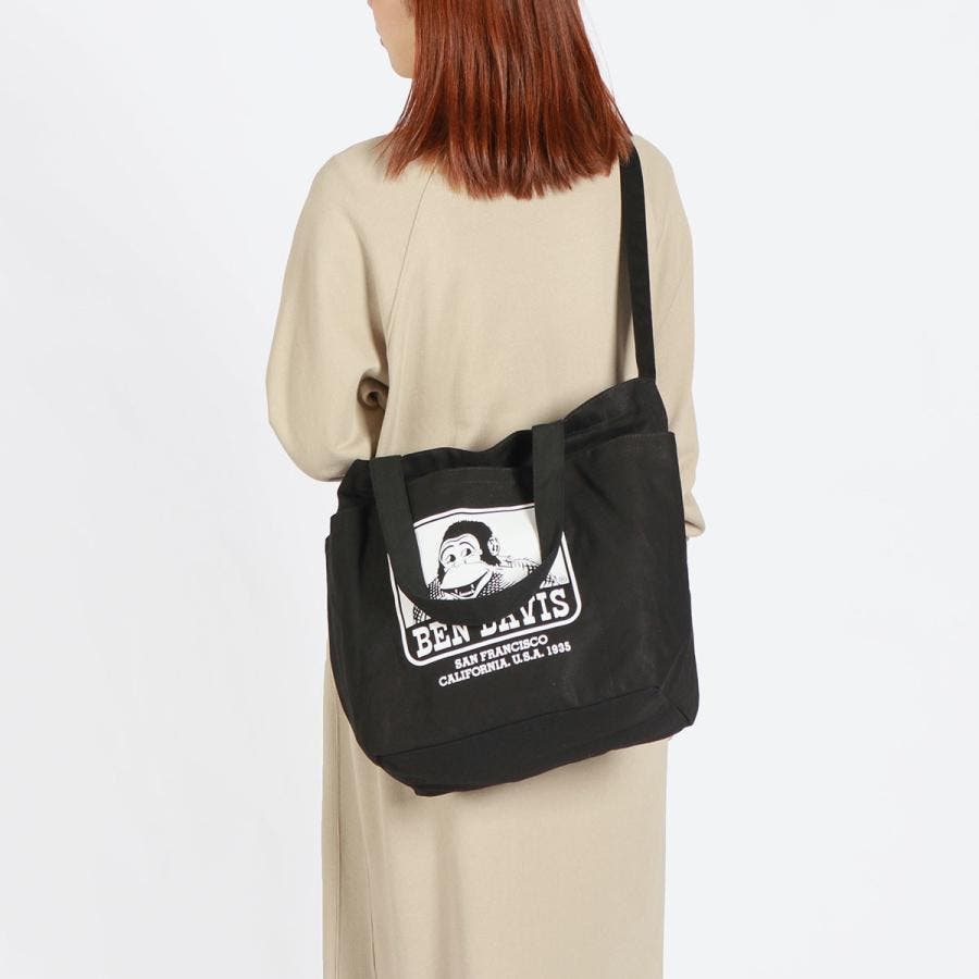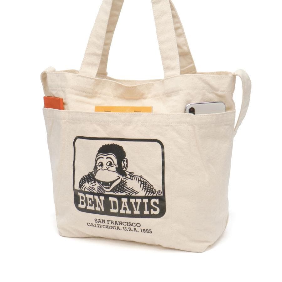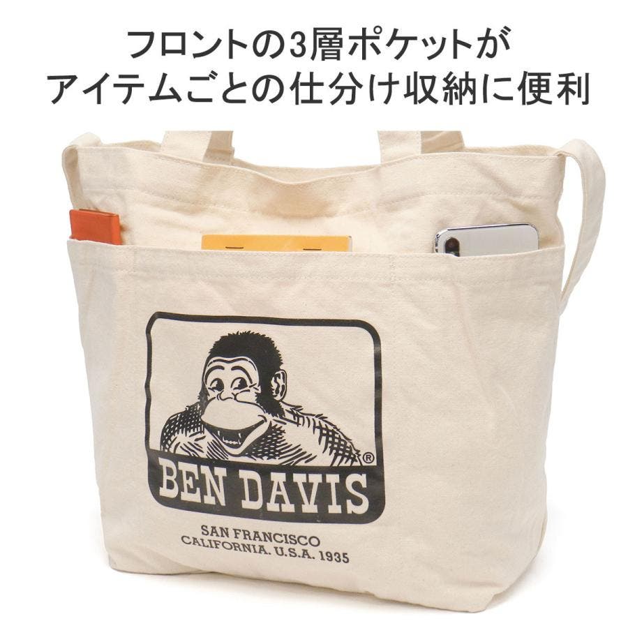 アメリカを代表するワークブランド『BEN DAVIS/ベンデイビス』のロゴプリントが前面に入ったコットン素材のショルダートートバッグです。A4サイズがゆったり入るサイズ感で、手提げとショルダーの2WAY仕様になっています。フロント部分に配置された3層のポケットが、スマートフォンや小物の収納に便利。ラフに使えるキャンバス素材で、普段使いから通勤・通学にも最適です。
