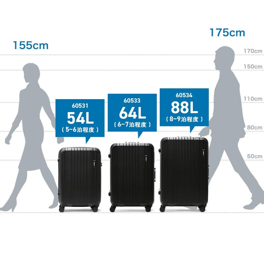 細部まで機能をブラッシュアップした次世代のスタンダードモデル『HERITAGE2/ヘリテージ2』より、6~7泊程度の旅行に最適な64Lサイズが登場。メイン素材には強度と弾力性を兼ねそなえたポリカーボネートプラス素材を採用し、軽さと強度を高い次元で融合させています。スーツにも合わせやすい落ち着いたカラーリングで、ビジネスシーンからトラベルシーンと幅広く活躍するアイテムです。