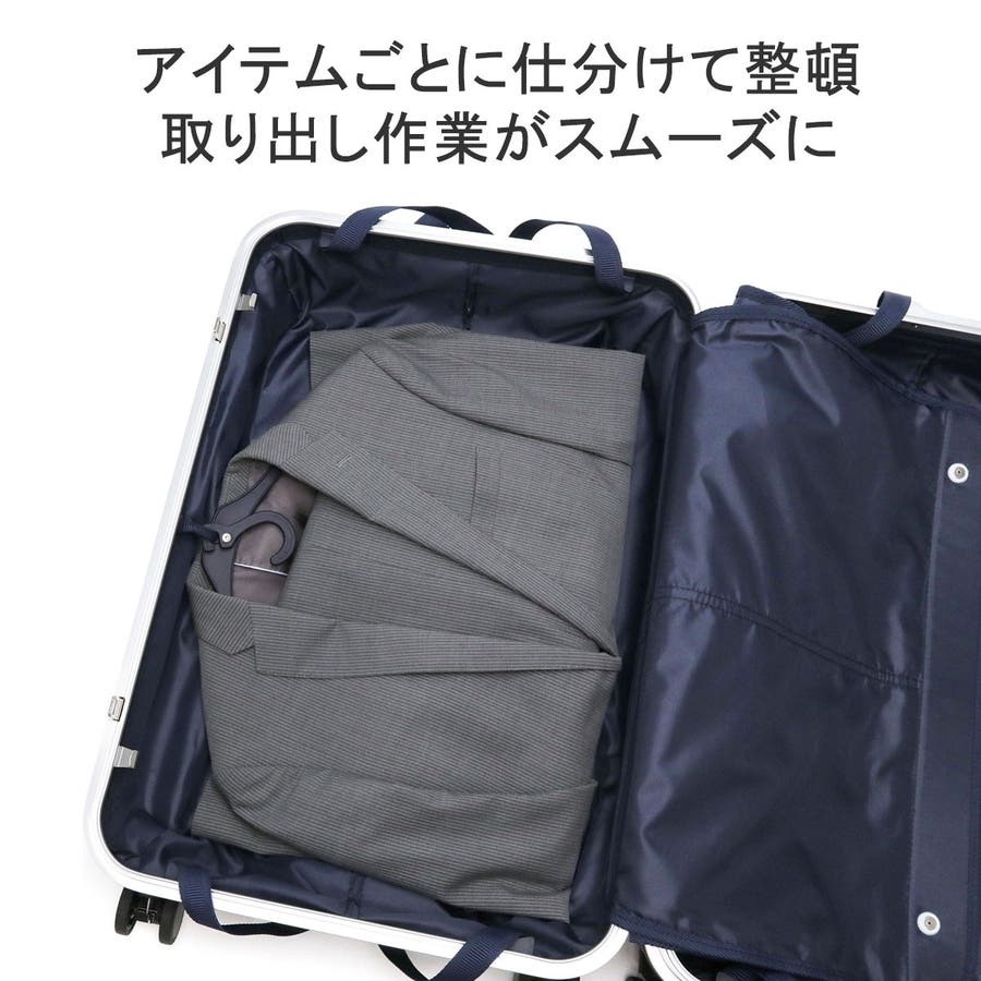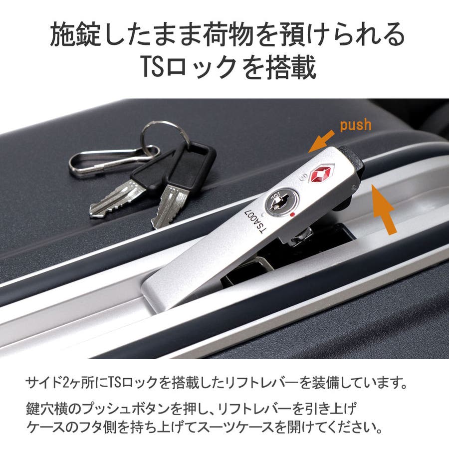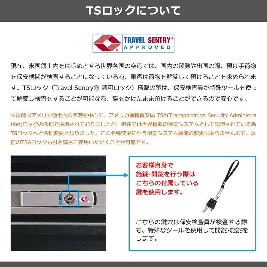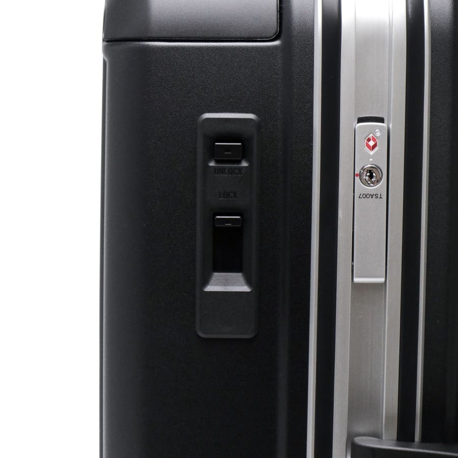 本体はフレームタイプで、内装には両面仕切りと荷崩れ防止のクロスベルトを備えており、ジャケット等の収納に便利なハンガーも装備されています。荷物の紛失時に発見率が向上するトラベルセントリーIDを搭載。背面のプレートに記載された固有のIDナンバーを登録しておくことで、荷物の紛失時に役に立ちます。静音ダブルホイールキャスターやアンダーハンドル、TSロックと欲しい機能を詰め込んだ次世代モデルです。