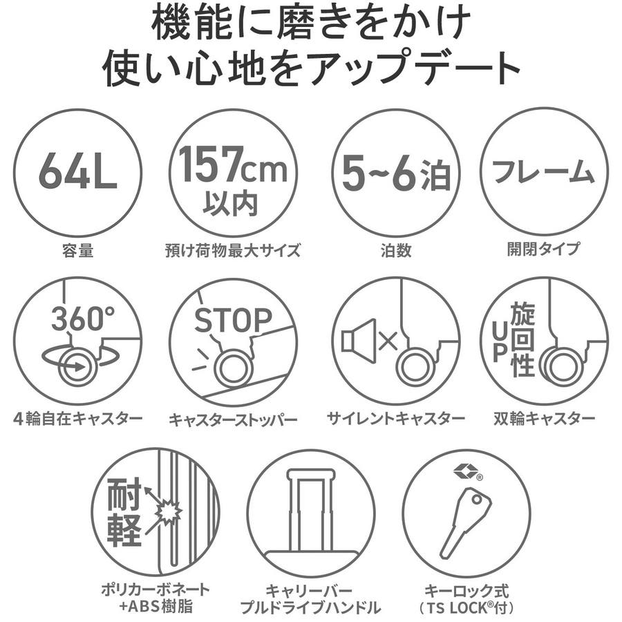 細部まで機能をブラッシュアップした次世代のスタンダードモデル『HERITAGE2/ヘリテージ2』より、5~6泊程度の旅行に最適な64Lサイズが登場。メイン素材には強度と弾力性を兼ねそなえたポリカーボネートプラス素材を採用し、軽さと強度を高い次元で融合させています。スーツにも合わせやすい落ち着いたカラーリングで、ビジネスシーンからトラベルシーンと幅広く活躍するアイテムです。
