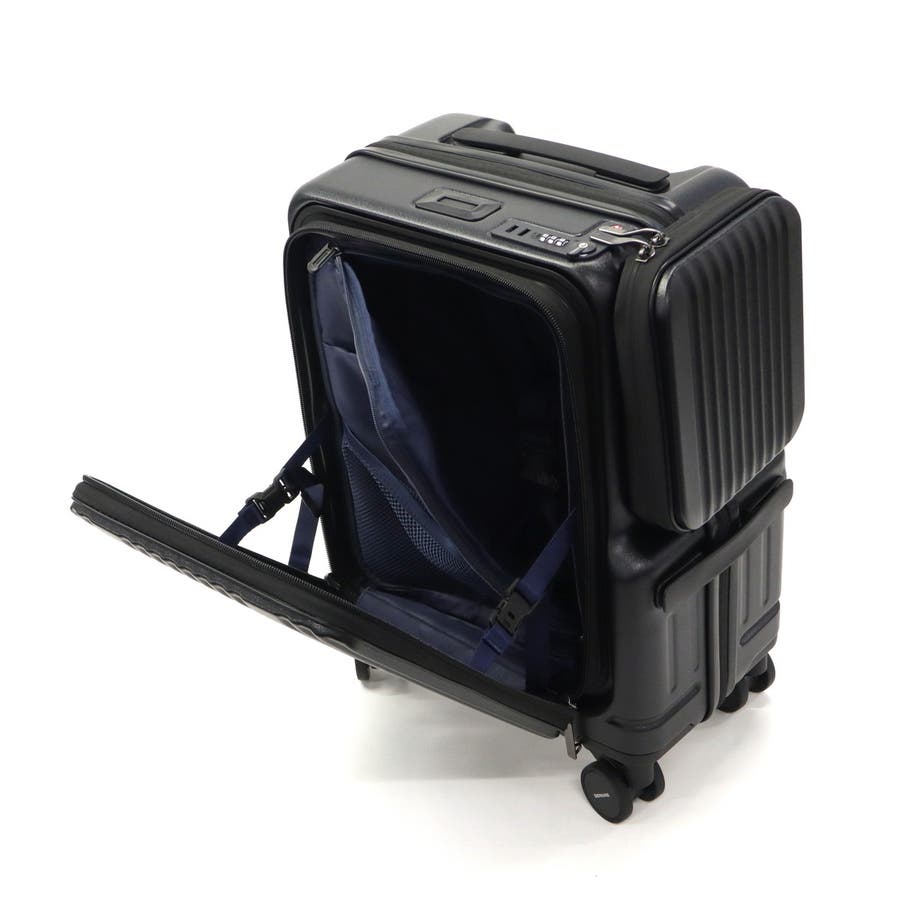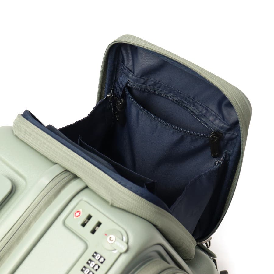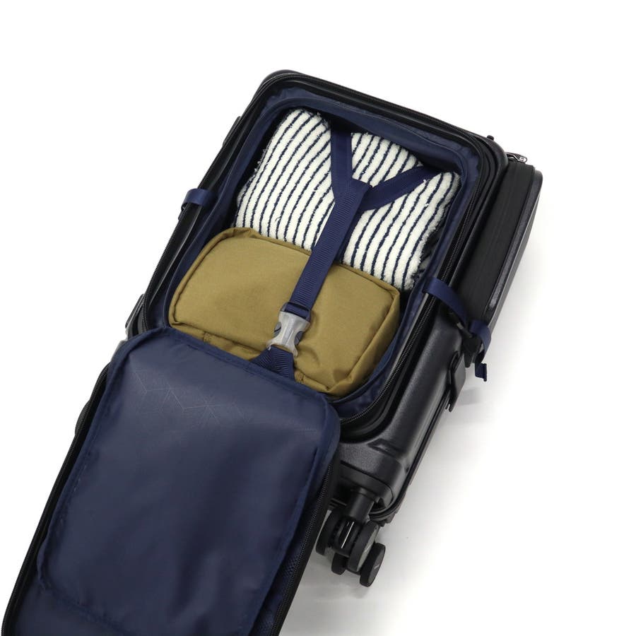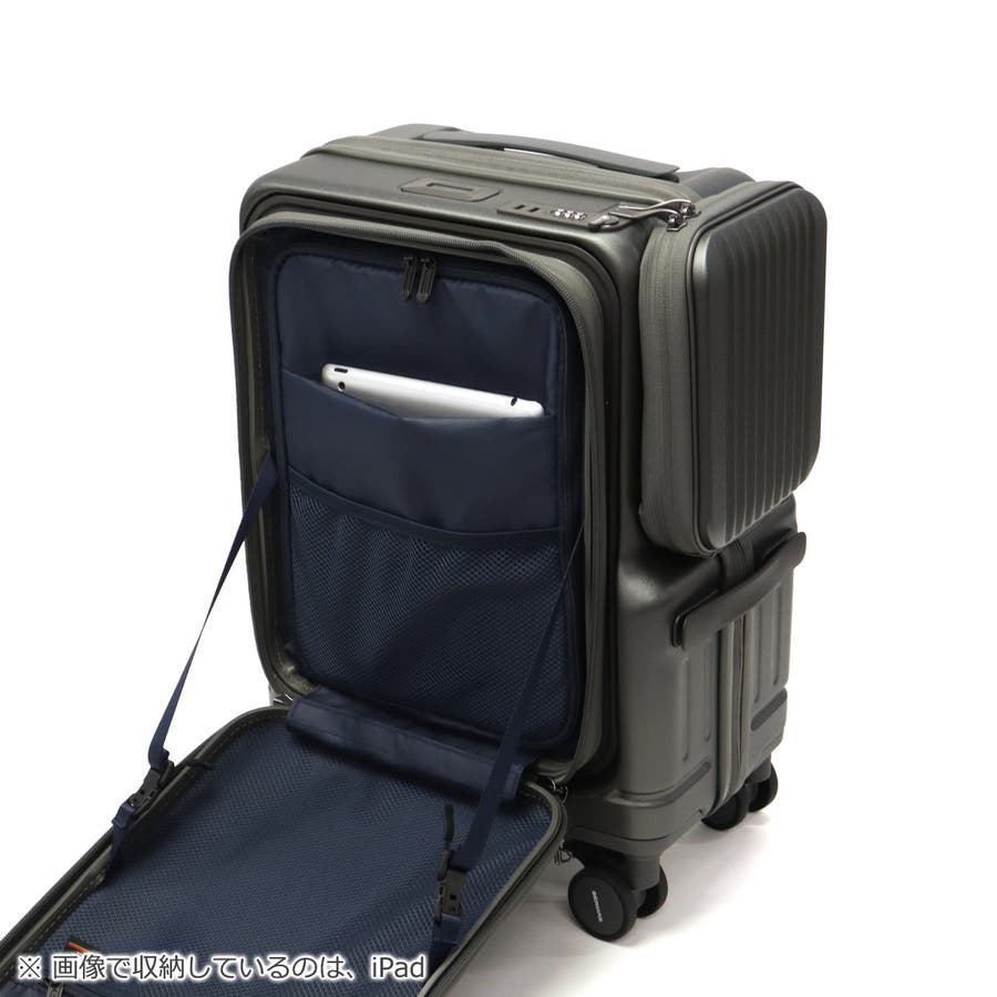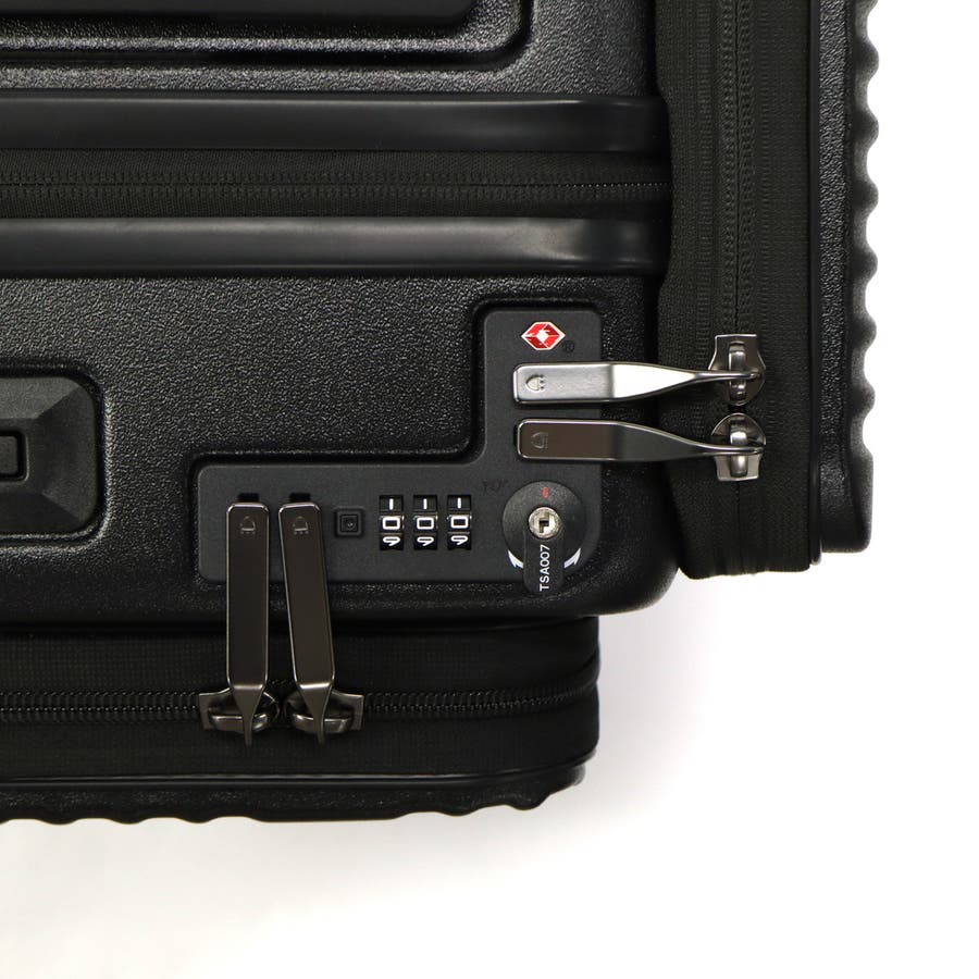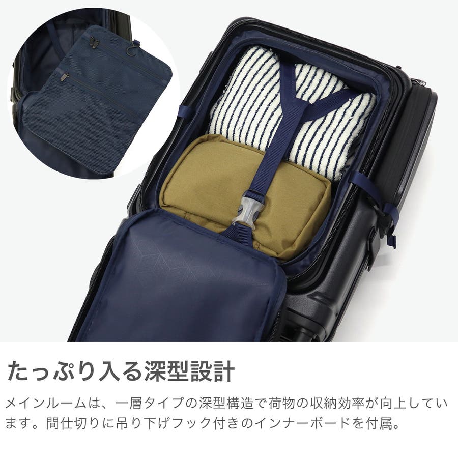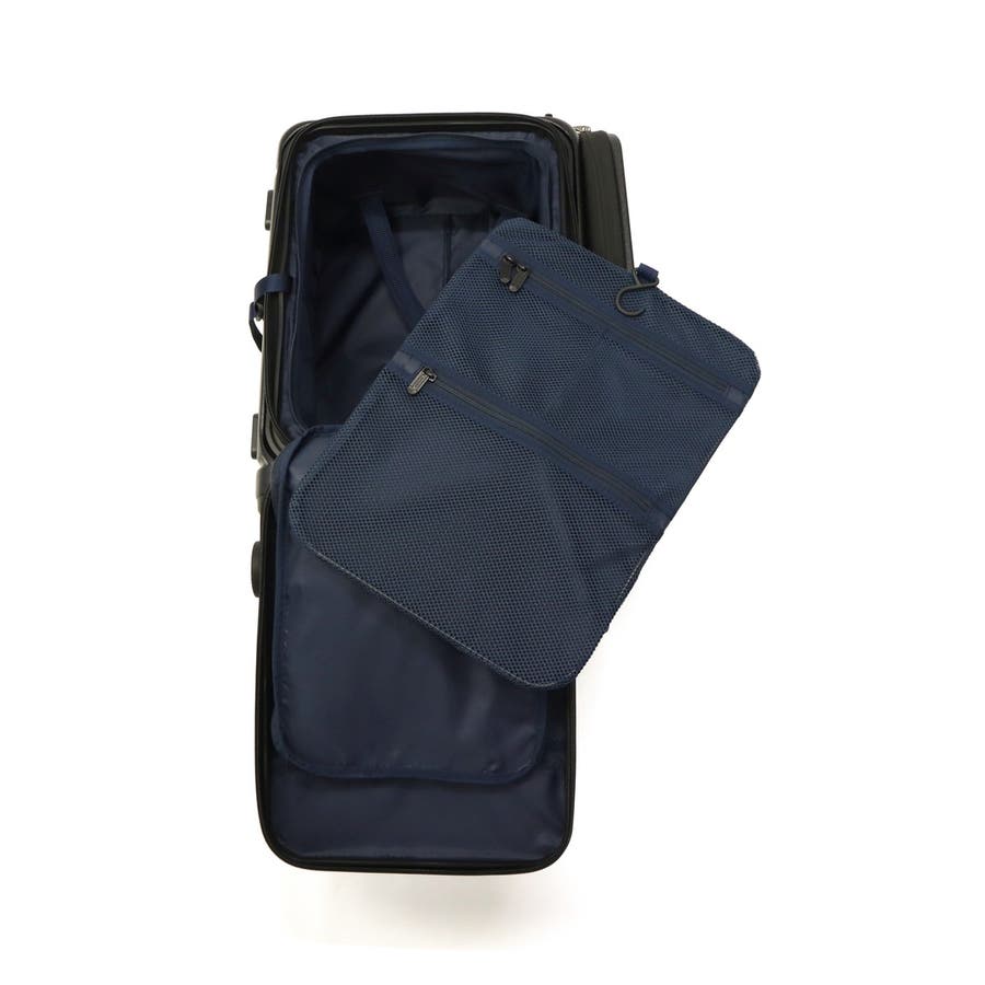 収納効率を追求した深型設計のスーツケースです。独立したサイドポケットか上部に配置してあることで、スマートフォンなどの小物類を収納しやすく、しゃがまずに出し入れが可能です。フロントオープン、カップホルダーなど機能性抜群。間仕切りに吊り下げフック付きのインナーボードを付属。 バスルームのフックなどに吊して使えるのでホテルでの利便性も高く、小物など整頓し収納しやすいのでトラベル収納ハンガーとしてもおすすめです。TRAVEL SENTRY ID付きで、万が一の紛失時も安心。