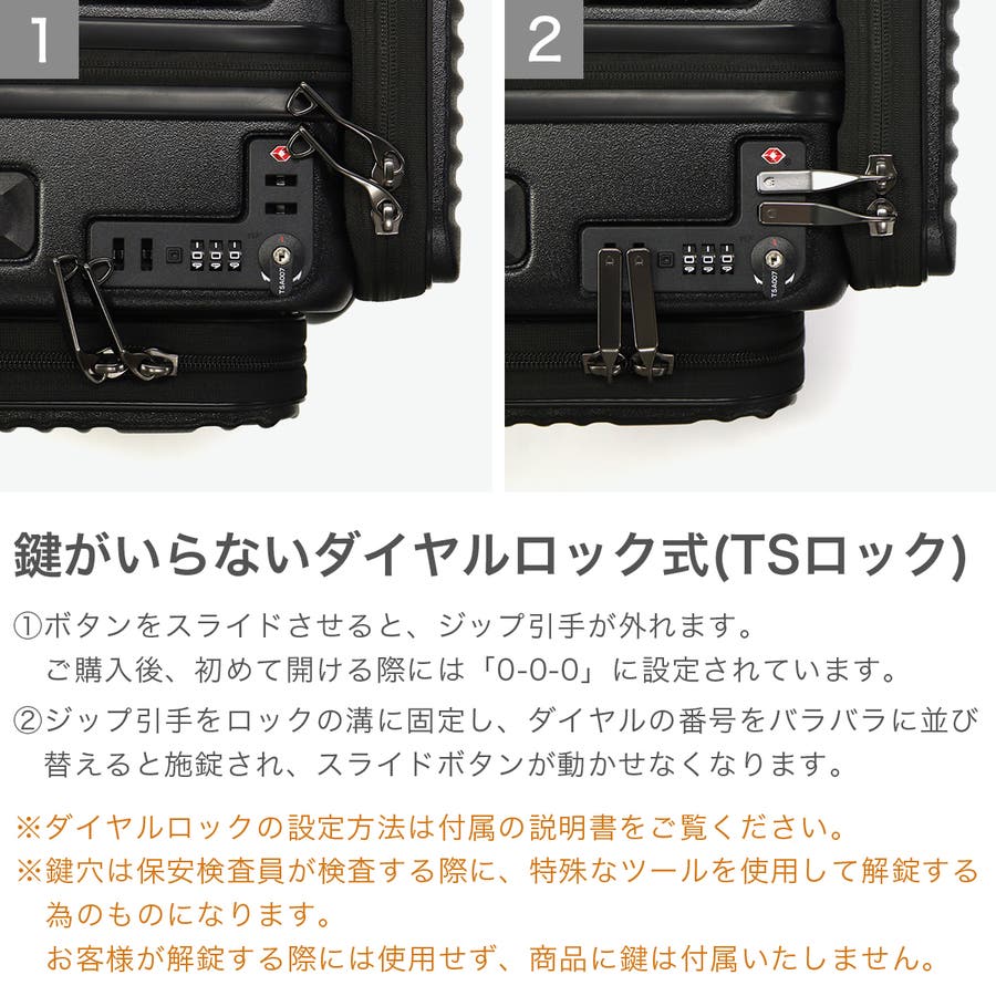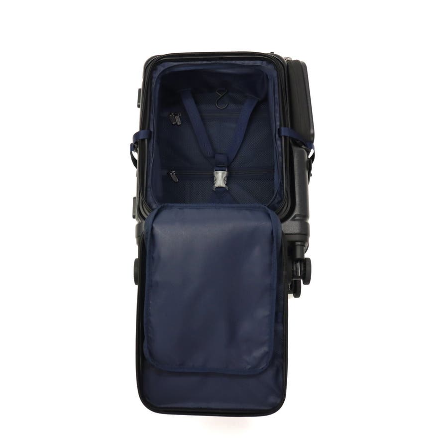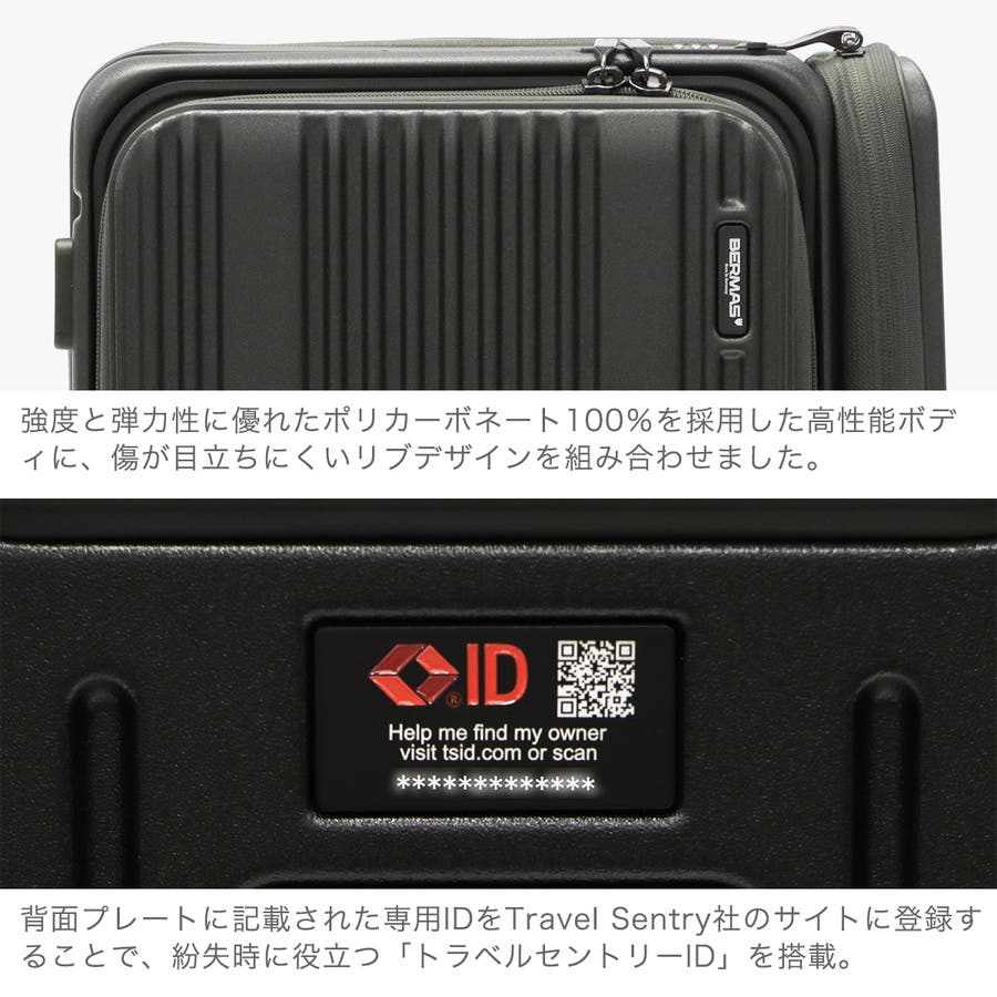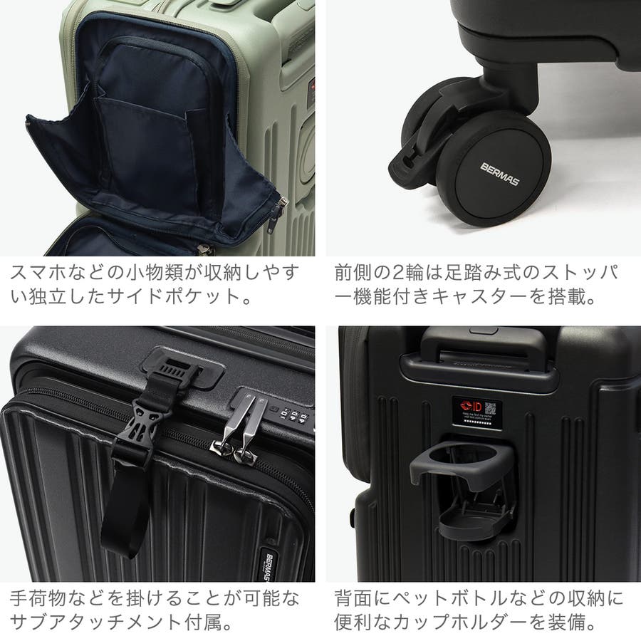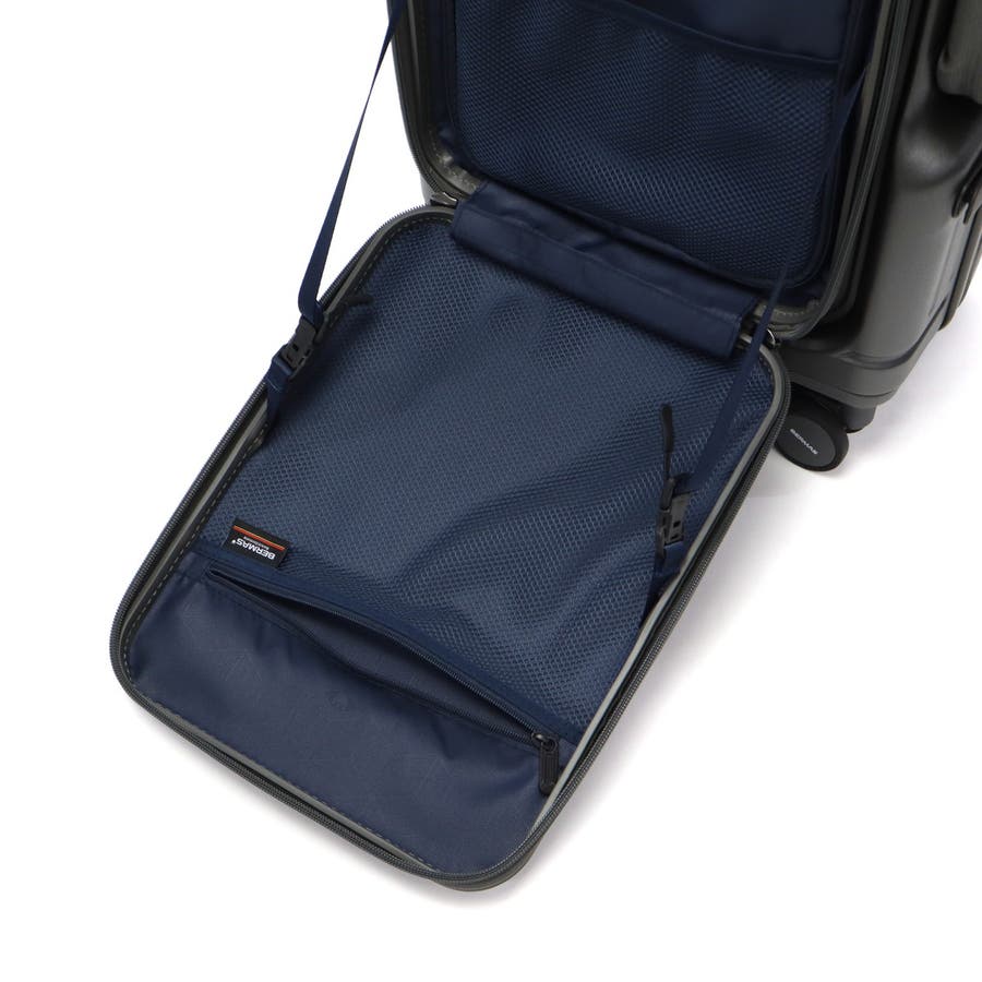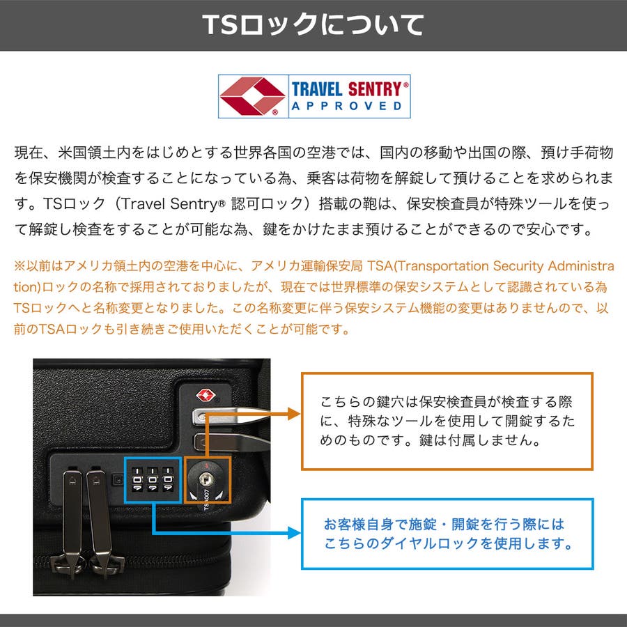 収納効率を追求した深型設計のスーツケースです。独立したサイドポケットか上部に配置してあることで、スマートフォンなどの小物類を収納しやすく、しゃがまずに出し入れが可能です。フロントオープン、カップホルダーなど機能性抜群。間仕切りに吊り下げフック付きのインナーボードを付属。 バスルームのフックなどに吊して使えるのでホテルでの利便性も高く、小物など整頓し収納しやすいのでトラベル収納ハンガーとしてもおすすめです。TRAVEL SENTRY ID付きで、万が一の紛失時も安心。