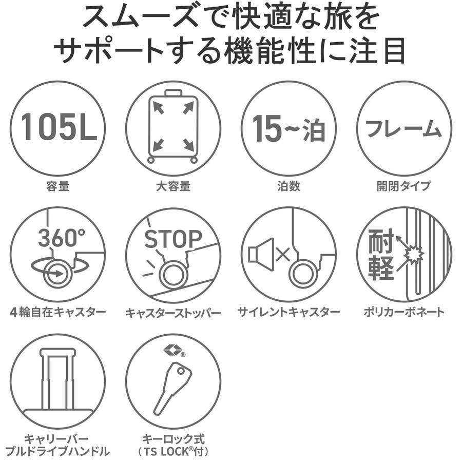 旅に出る前のワクワク感、旅支度をしている間も楽しい気持ちにさせてくれる『BOUNDRIP/バウンドリップ』のスーツケース。フレームタイプの本体は耐久性に優れ、15泊以上の長期滞在にも活躍する105Lの容量を備えています。簡単に操作できるブレーキ付きの静音キャスターや、渡米にも対応するTSロックなど、トラベルシーンをサポートする機能が満載のアイテムです。
