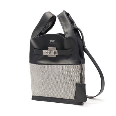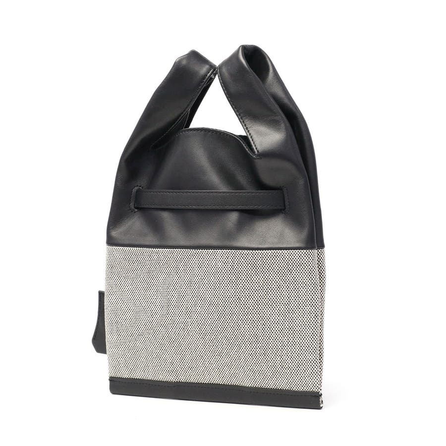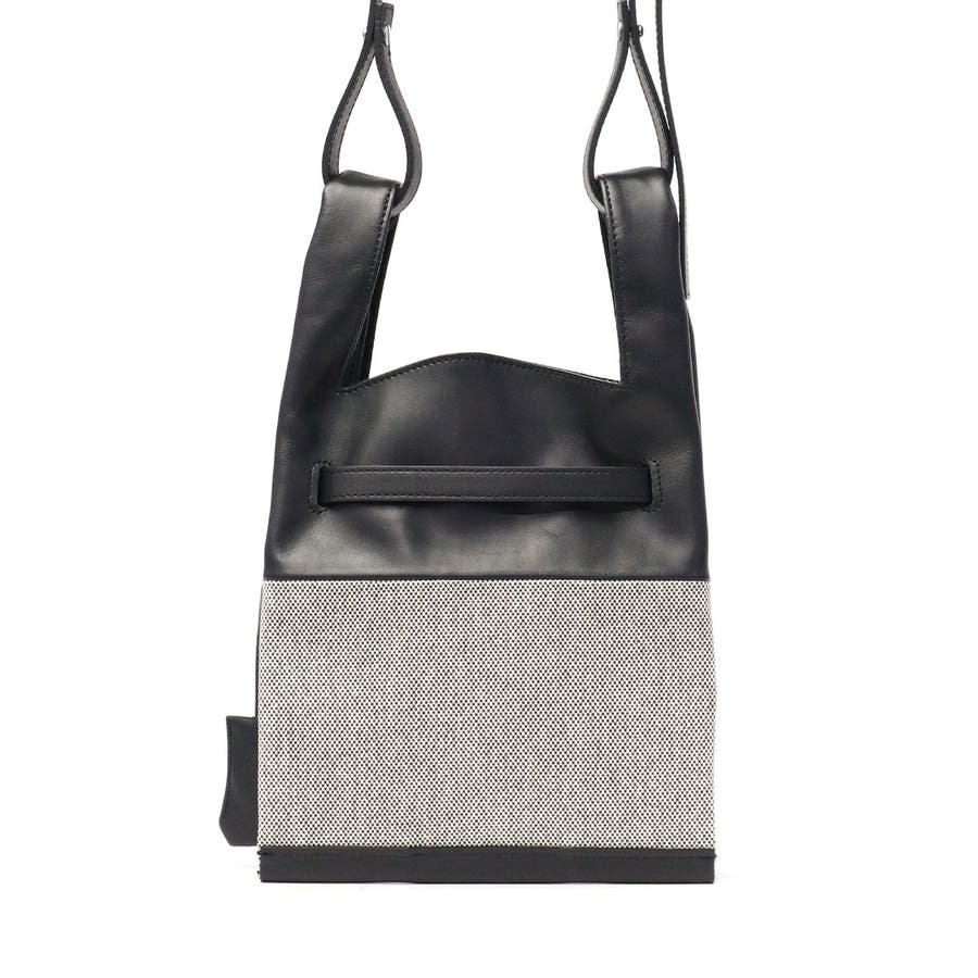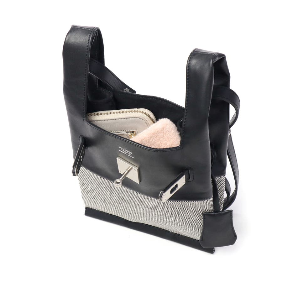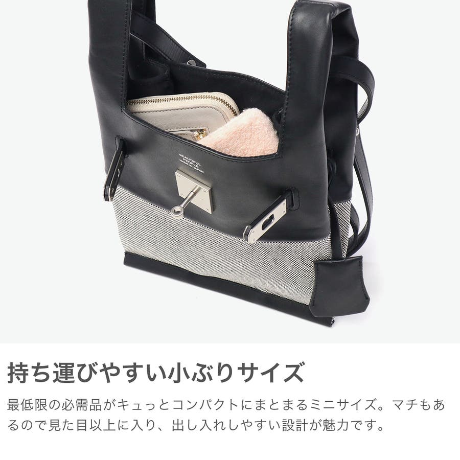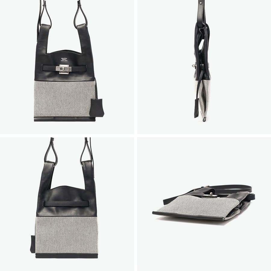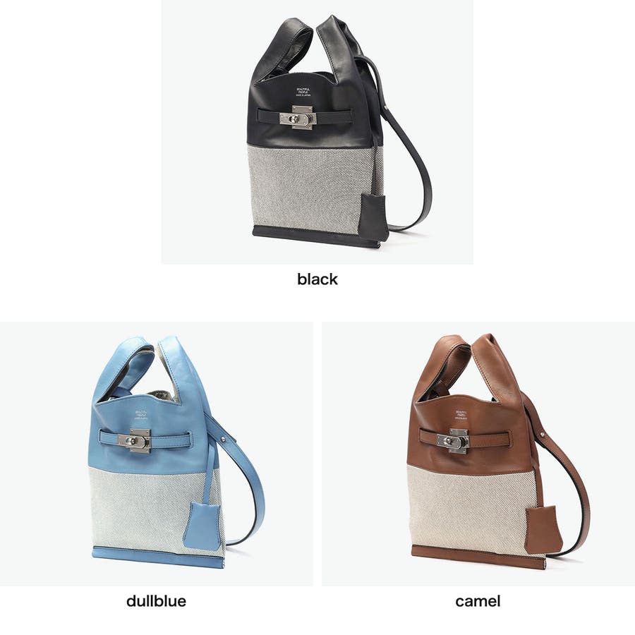 上質な牛革とカジュアルなコットンを組み合わせた、2WAY仕様のミニショルダー。マーケットバッグと金具の組み合わせが特徴で、「高価」と「安価」、「理想」と「現実」など相反する要素を融合したデザインに仕上がっています。付属のチャームはキーリングとしても使用可能。裏地には手触りの良い起毛ポリエステルを採用し、使い心地も快適です。