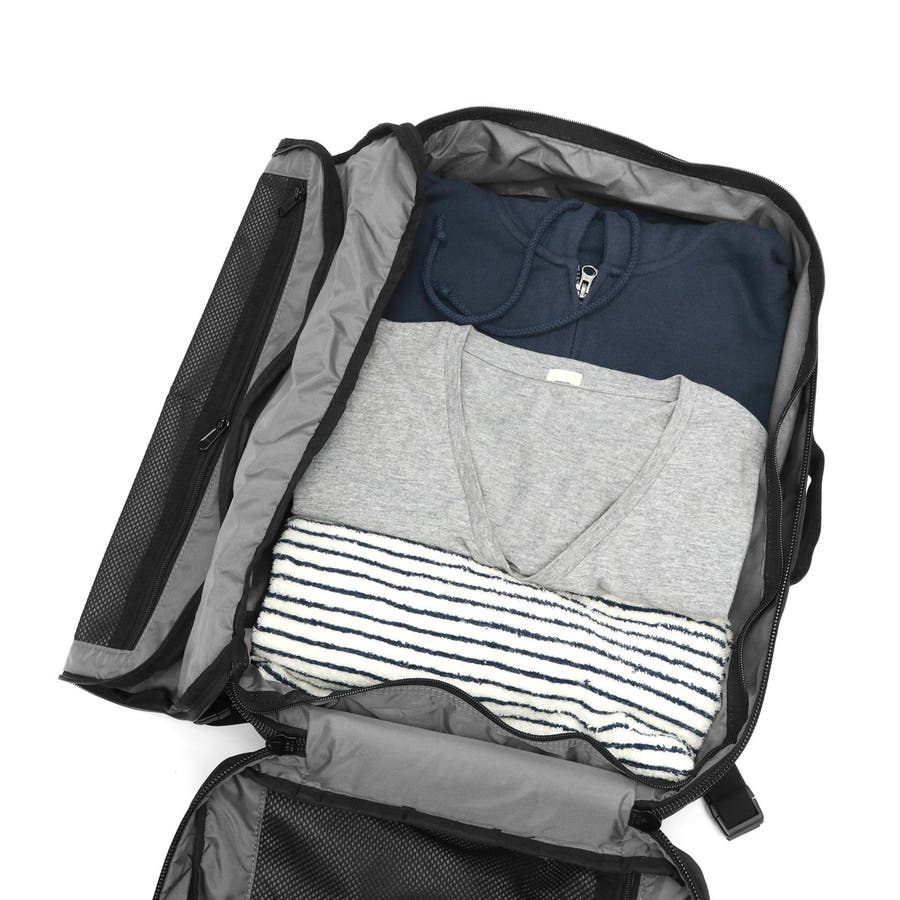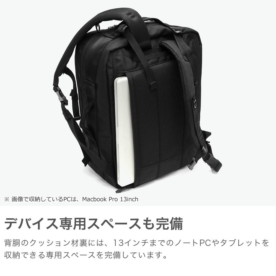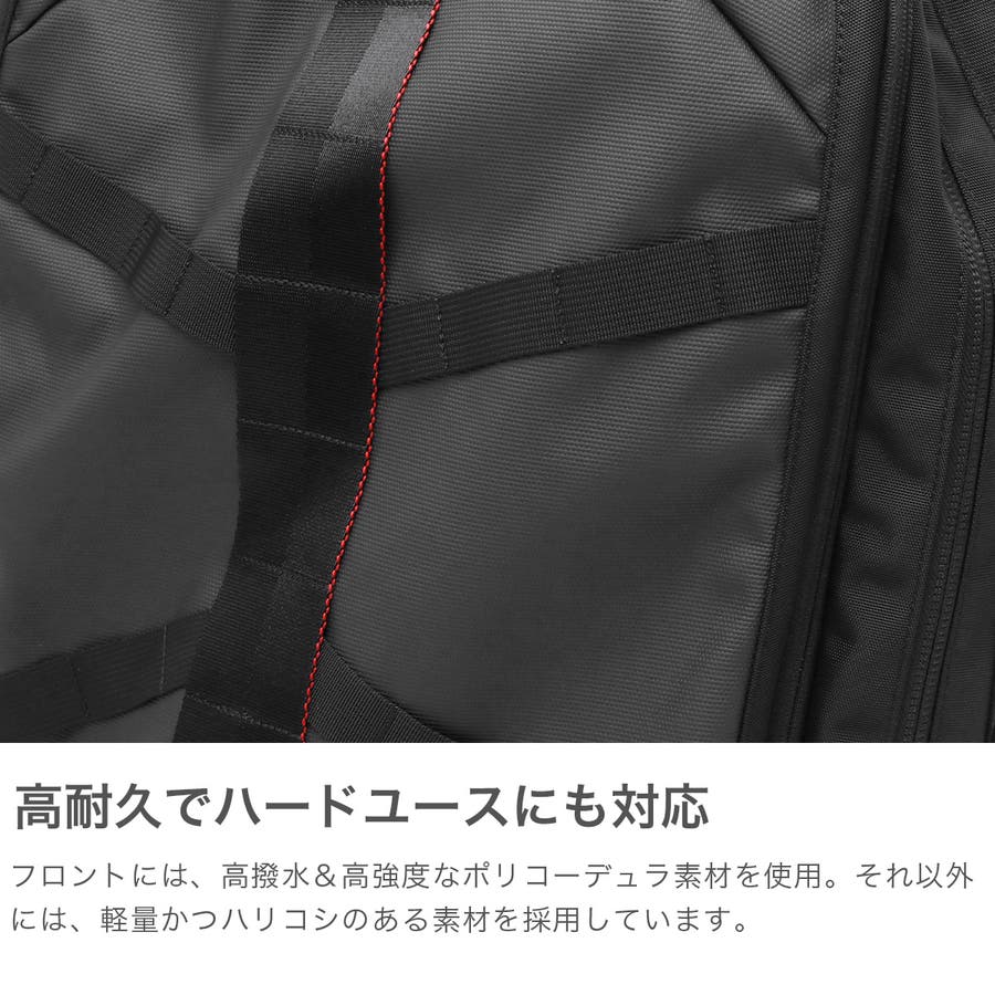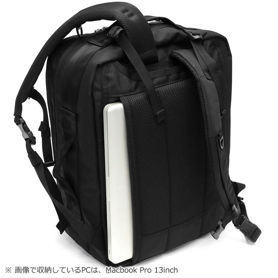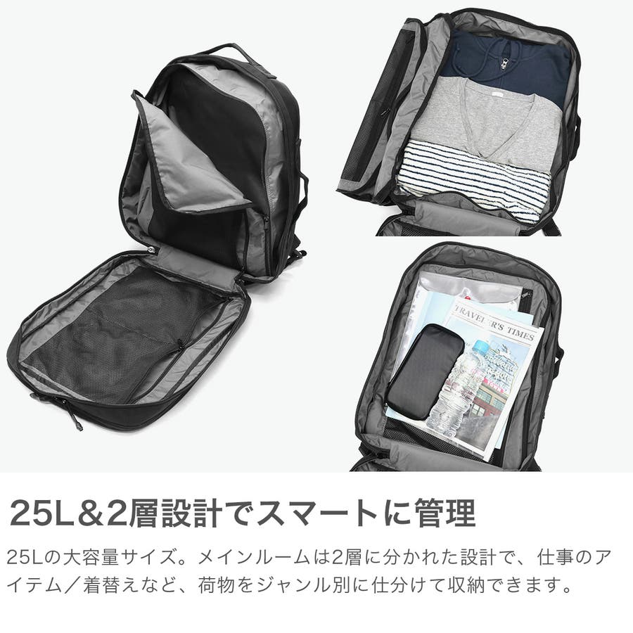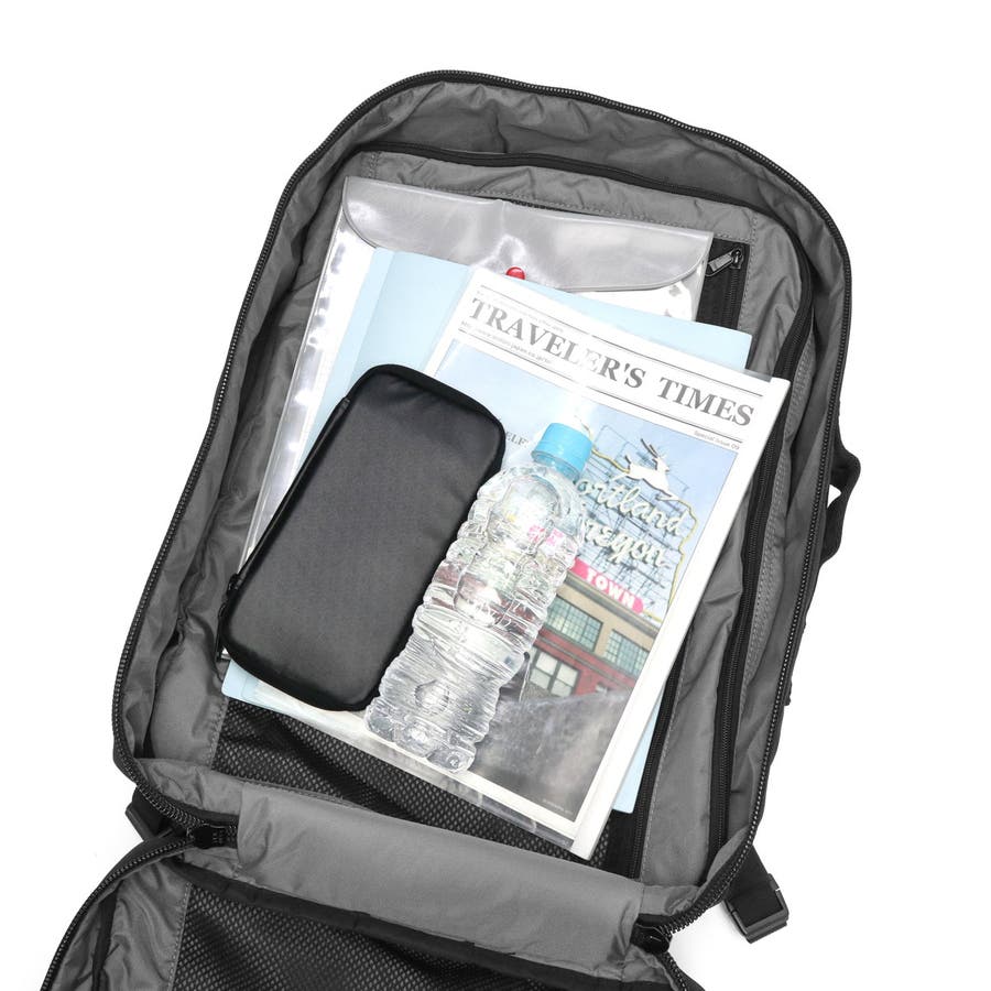 ワントーンのカラーリングでありながらも異なる素材の風合いが存在感を発揮するリュックサック。摩耗強度も高く、トラベル等のタフな使用に最適です。仕切りポケットを閉じることで2層構造となり、仕事のアイテムと着替えなどジャンルの異なるアイテムを分けて収納するのに便利。より快適な旅や仕事をサポートします。