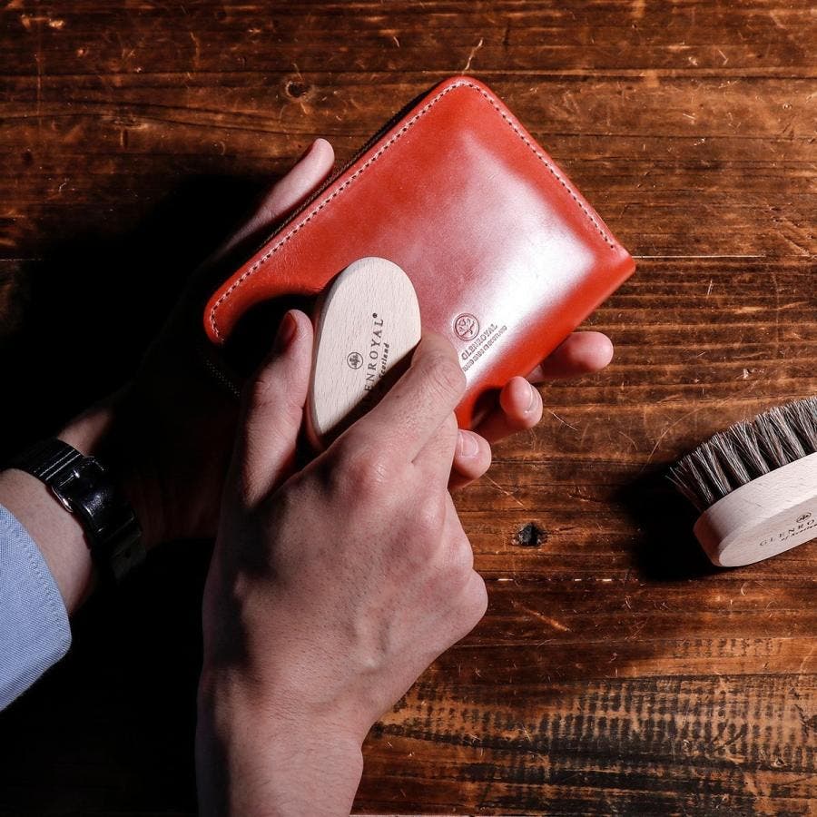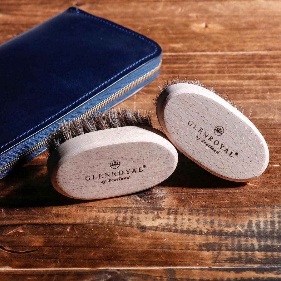 大切なレザーアイテムのお手入れに欠かせないブラシです。レザーアイテムは定期的にメンテナンスをすることで美しく変化し、末永くお使いいただけます。ブラシの毛は、ブラウンの馬毛と白馬の毛を特別ブレンドすることにより、上品な色合いに仕上げ、一つ一つ異なる、木目の美しいブナ材も特徴になっています。