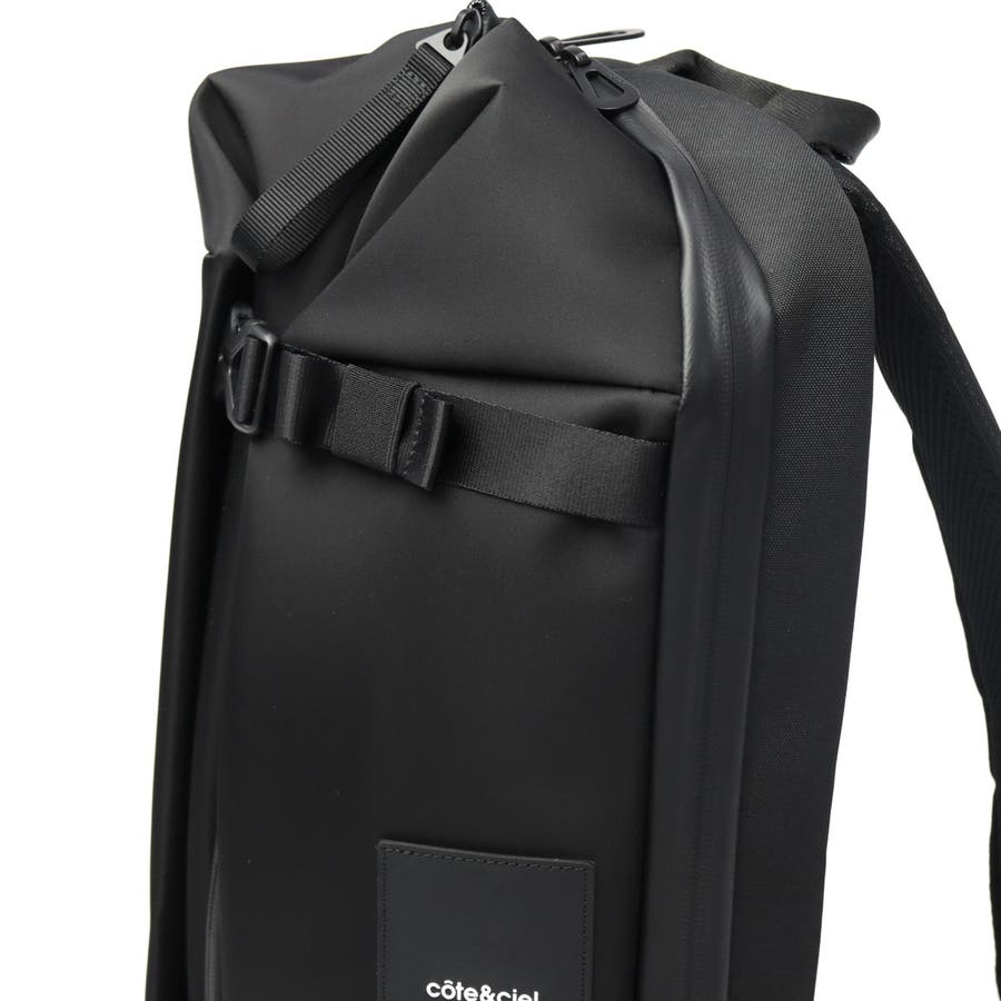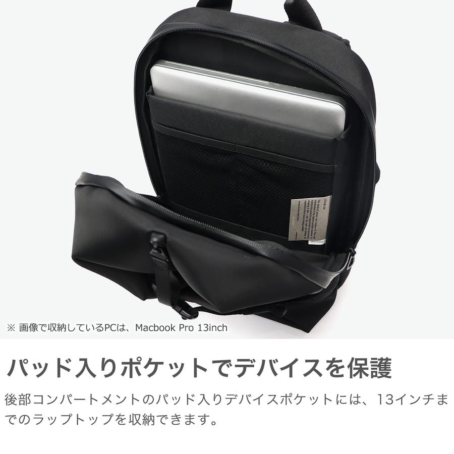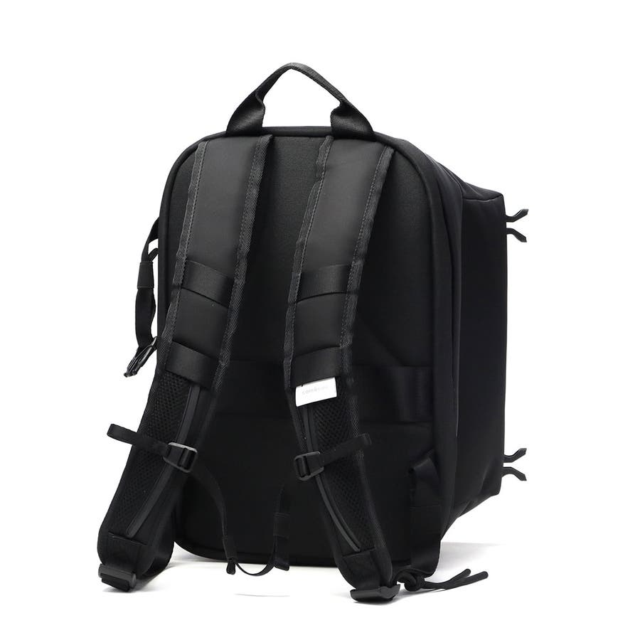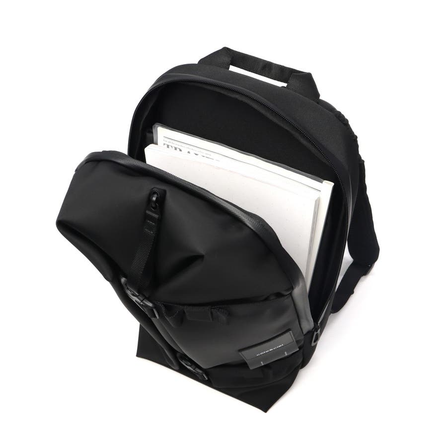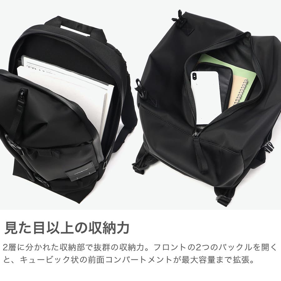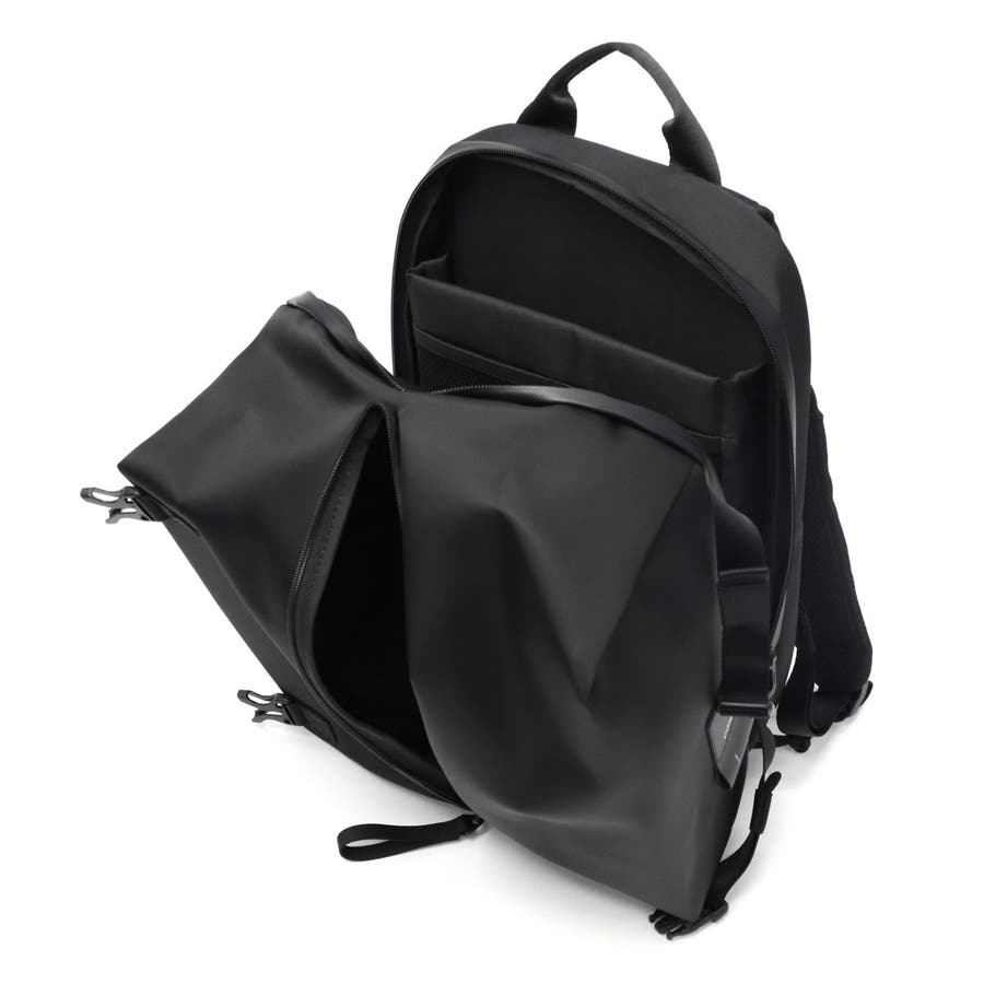 一見コンパクトなバックパックですが、フロントのバックル調節で前面コンパートメントを最大容量まで拡張できる、アイデア満載のアイテム。後部コンパートメントにはパッド入りデバイスポケットを装備し、ビジネスシーンでも活躍します。マットな質感の生地でスタイリッシュに、さらに機能面も充実させたスマートなバックパックです。