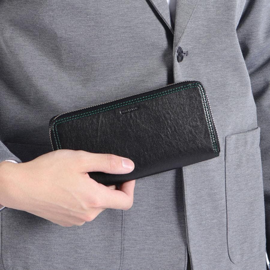手馴染みの良いフレンチシープと遊び心のあるポイントカラーのWステッチが魅力的な『Rami/ラミ』シリーズのラウンドファスナー長財布。札入れ、小銭入れ、カード収納を完備し、普段使いからビジネスまで幅広く対応します。老若男女問わずに使用できるような落ち着きある表情が特徴で、ギフトにもぴったりな一品。