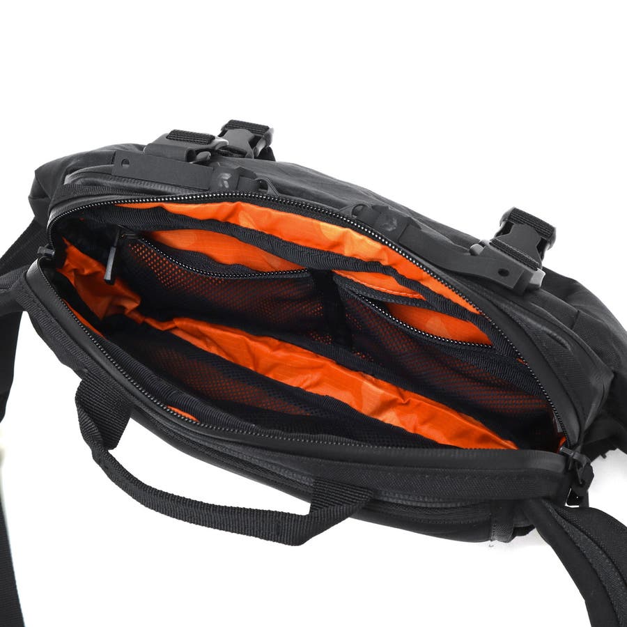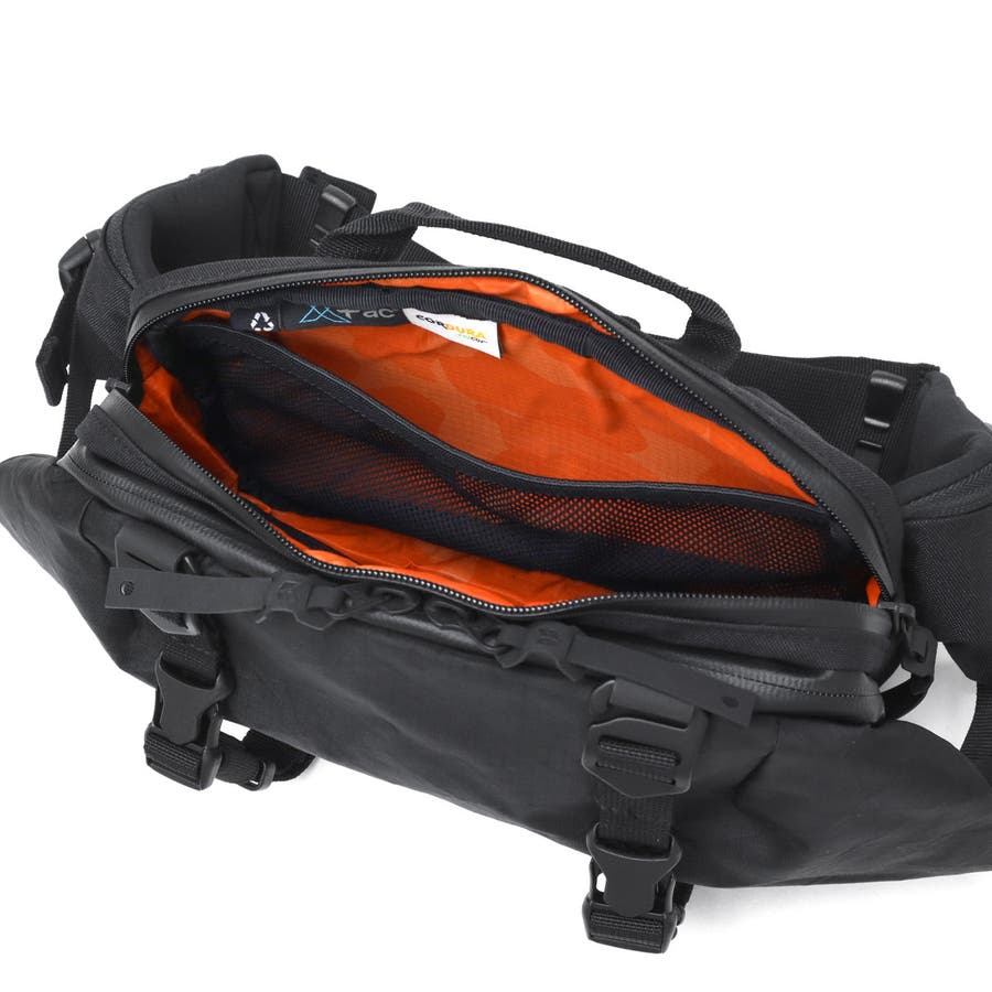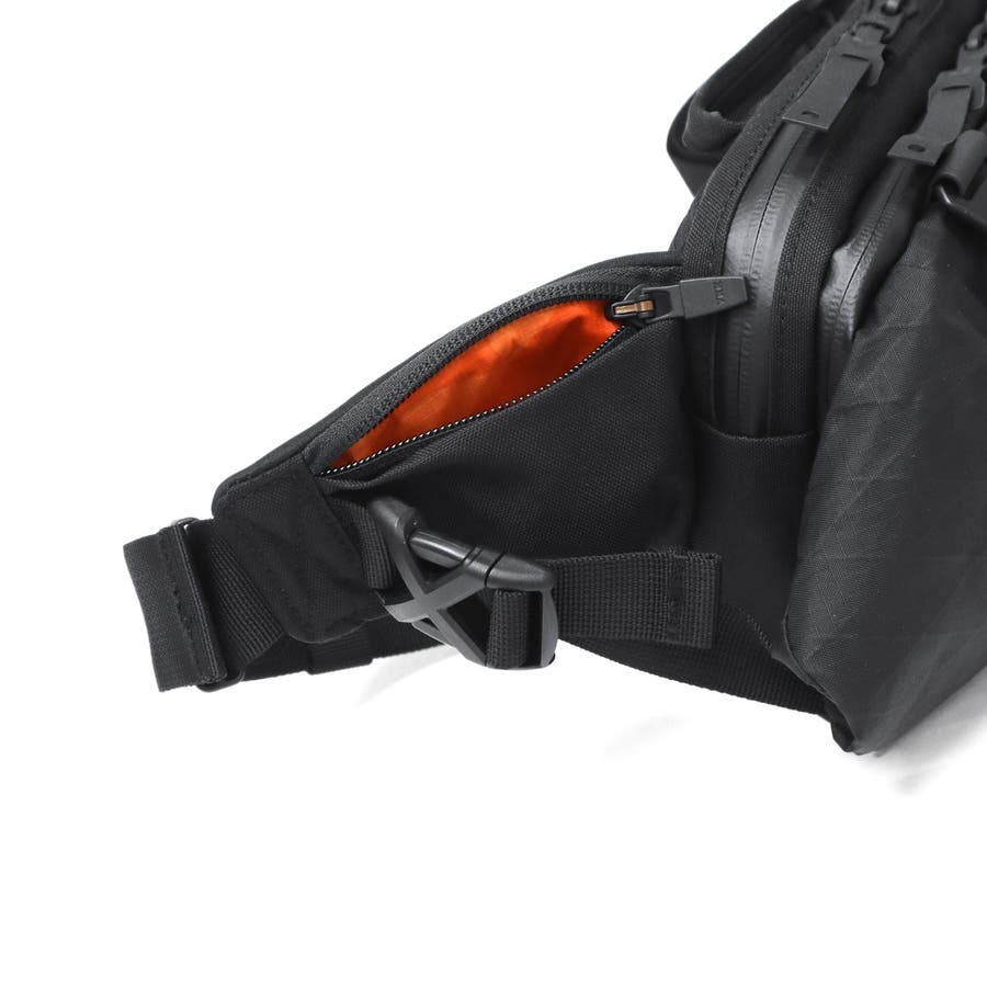ミニマルなサイズ感に高い機能性を備えた、CODE OF BELLの横型ボディバッグ『X-POD II』。必要なものだけをスマートに持ち運べる2層構造で、財布やスマホ、パスポートなどをすっきり収納。2.3Lから7Lへと容量が拡張でき、シーンに合わせて柔軟に対応します。耐久性に優れたリサイクルコーデュラナイロンと止水ファスナーを採用し、雨や汚れにも強いので安心してお出かけできます。