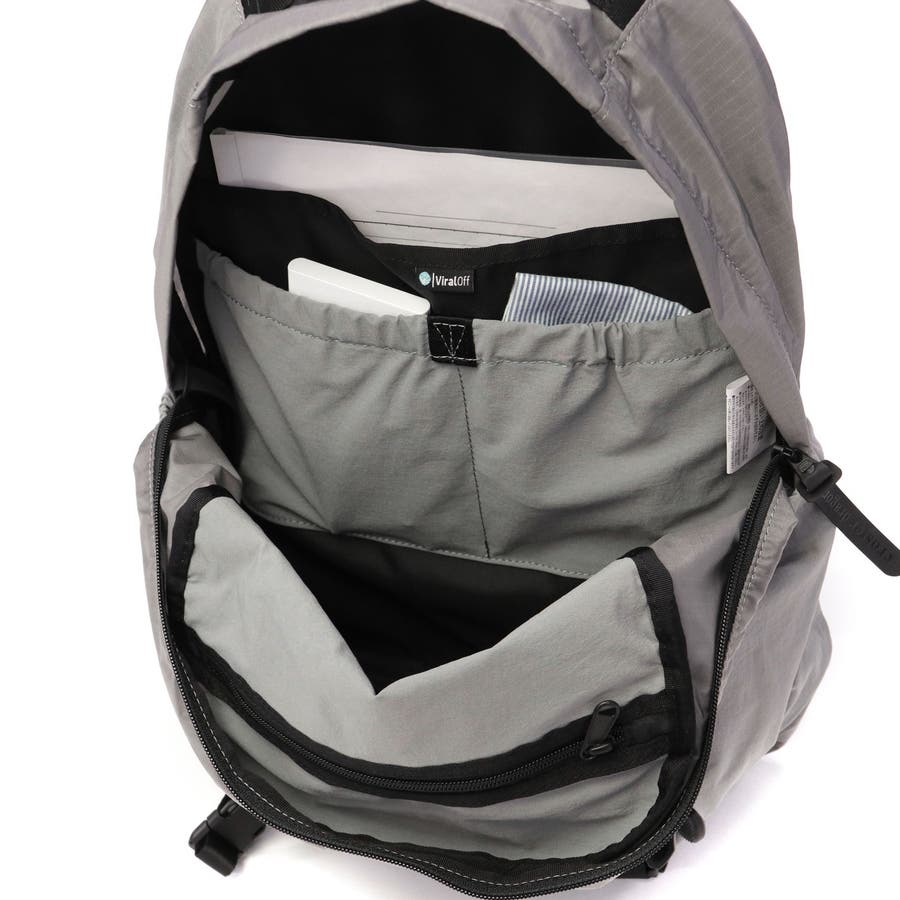 アウトドアからタウンユースまで幅広く活躍するバックパック。見た目以上の収納力で使い勝手抜群のデザインが魅力です。本体内側には表面に付着したウイルスを減少させる「バイラルオフ」素材を採用したポケットを設けています。また、雨の日でも安心できる撥水ファスナーを採用。さらに、生地には汚れにくいテフロン加工を施しているため、毎日気兼ねなく愛用して頂けます。