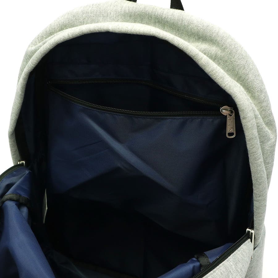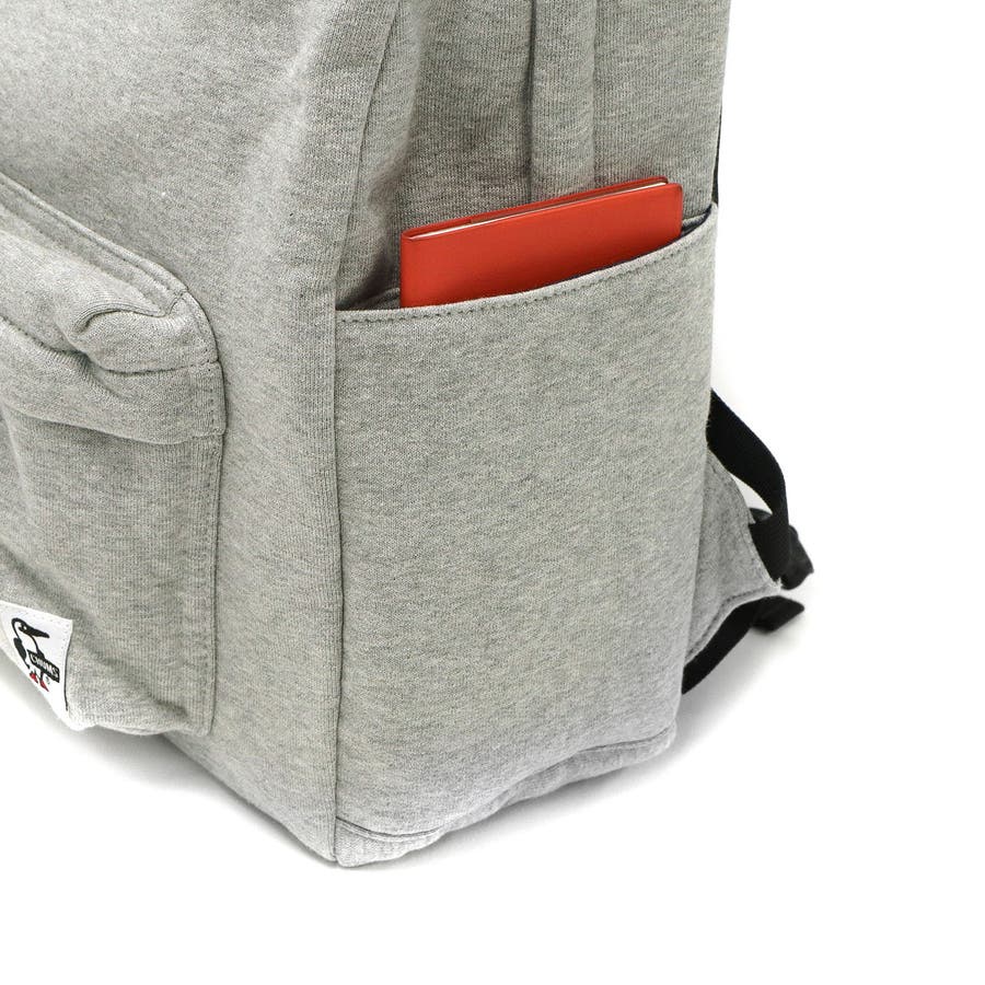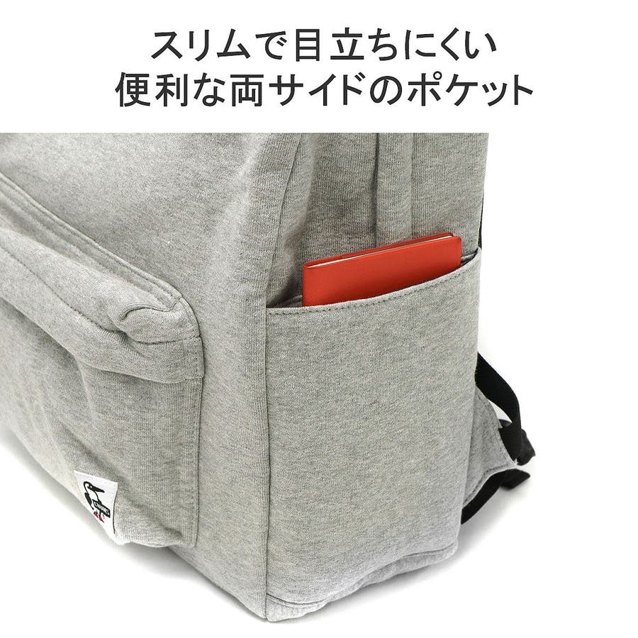 CHUMSの定番素材である柔らかなスウェット素材をメインに、裏地や負荷がかかる箇所には強度の高いポリエステル素材を使用したリュックサック。スウェットの表面には撥水、撥油、防汚性能を施した、水や汚れに強いタフな仕上がりがポイントです。メインルームは18Lの容量を備え、通勤通学など日常的に使いやすいA4サイズに対応。本体の両サイドに配置されたポケットは、未使用時は目立たないため、すっきりとした外観に見せてくれます。
