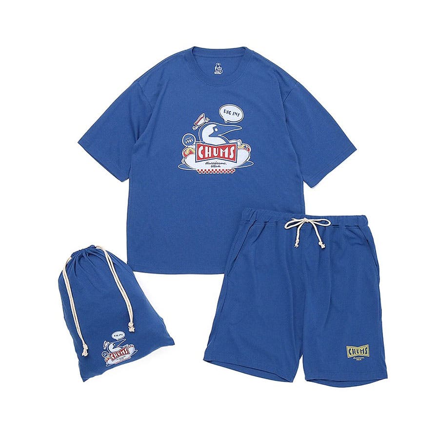 アメリカンダイナーをイメージしたシリーズのルームウェア3点セット。半袖Tシャツ、ショートパンツ、収納袋がセットになった、春夏にぴったりの軽やか素材。肌触りがよく速乾性もあり、部屋着にもワンマイルにも使える便利なアイテムです。巾着付きでお泊りにも◎