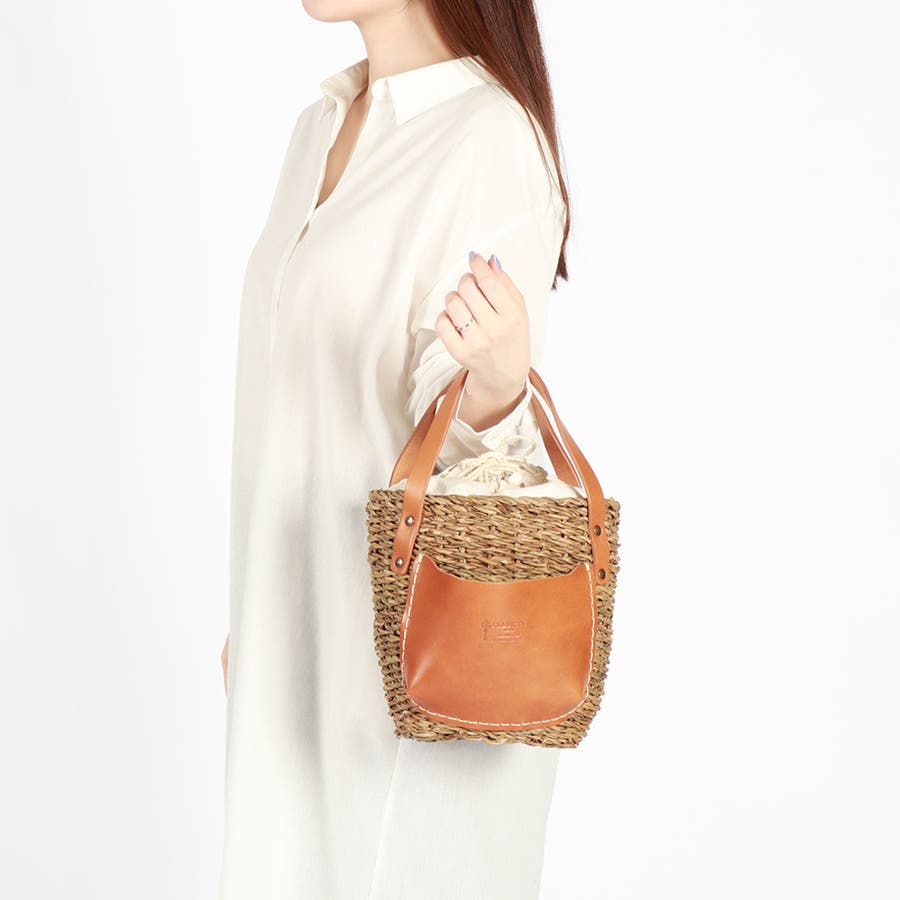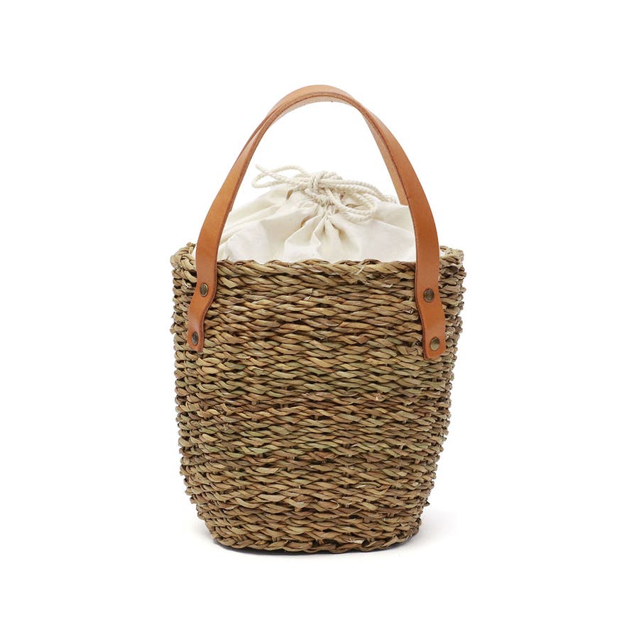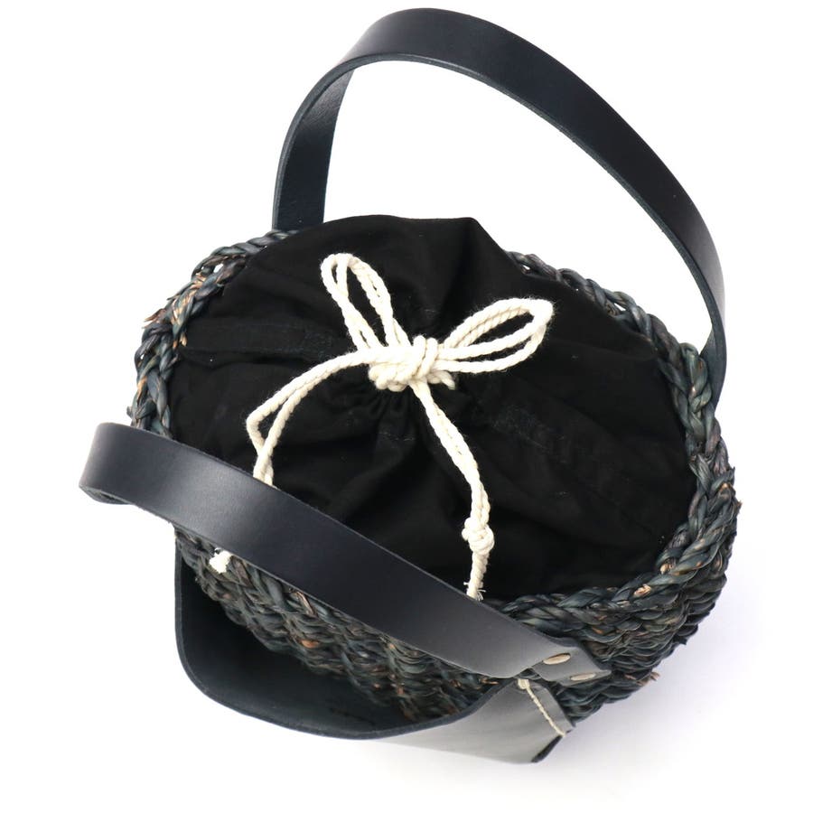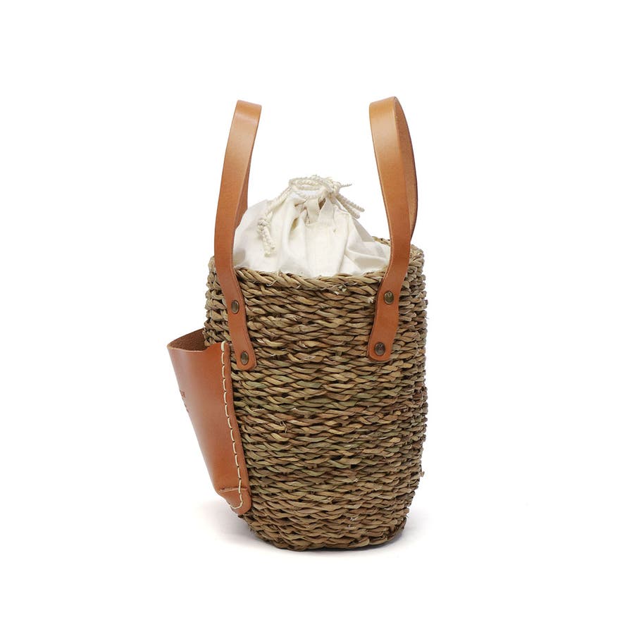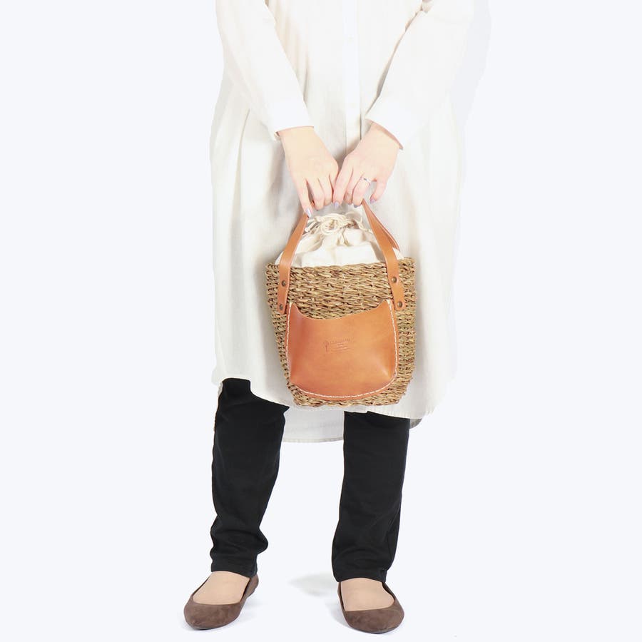 コロンと丸みを帯びた愛らしいフォルムに、大きなレザーポケットを合わせたカゴバッグ。バングラデシュの温地帯に生える水草・ホグラを使用し、職人が一つ一つ丁寧に編み込んでいます。ナチュラルなカゴにレザーパーツを合わせることで、上品さをプラス。口元から覗く巾着は、中に入れ込んですっきりと持ってもOK。爽やかさと大人可愛さを兼備したアイテムに仕上がっています。