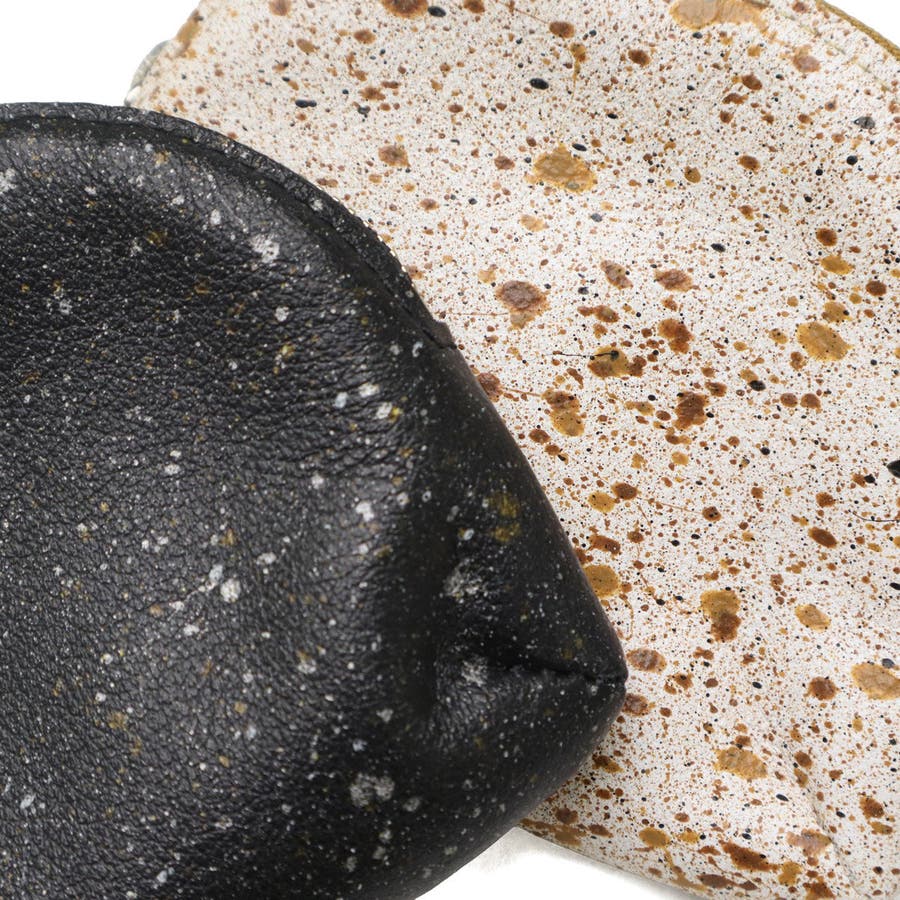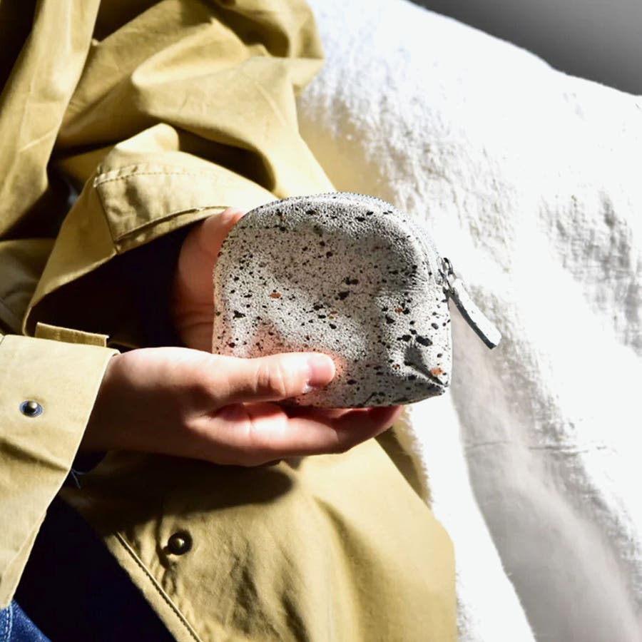 兵庫県の特産である本御影石を模したソフトレザーで仕立てた『MIKAGE』。こちらは、シンプルなデザインながらコロッとした丸みのあるフォルムのコインケースです。 小銭はもちろんですが、カードやお札も三つ折りにすれば収納することができます。石のような見た目とソフトな風合いが特徴で、特別な調整を施したハンドスプレーを使い、職人が1枚1枚手吹きで仕上げていくため革1枚ごとに表情が異なる逸品。存在感あるアイテムに仕上がっています。