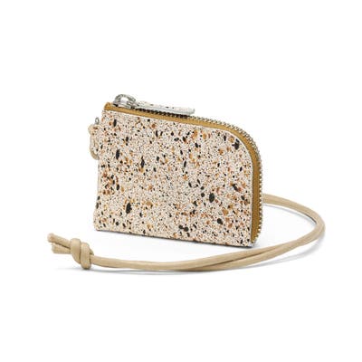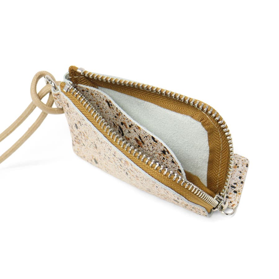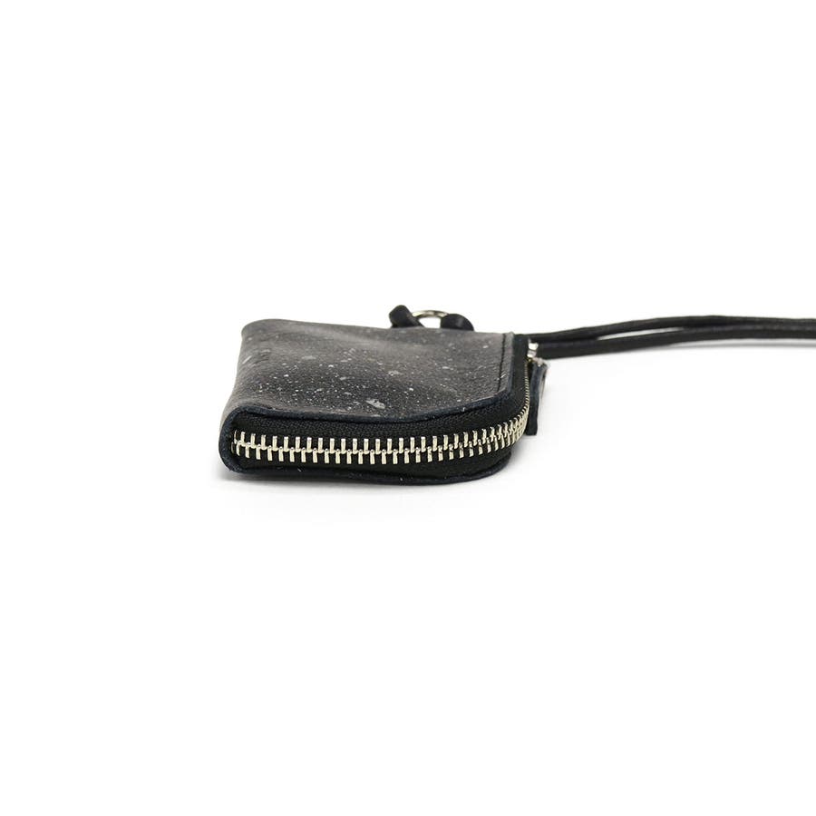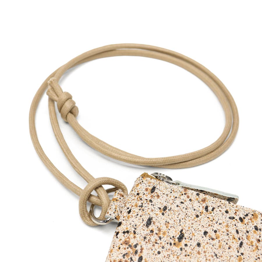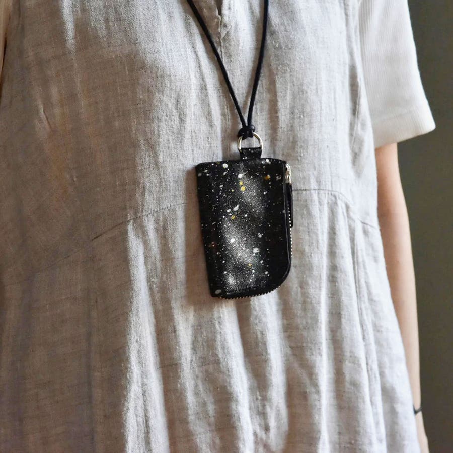 兵庫県の特産である本御影石を模したソフトレザーで仕立てた『MIKAGE』。「石のような見た目」と「手触りの良いソフトな風合い」が特徴です。こちらはカードがちょうどピッタリ収まり、首からかけられるようにストラップを付けたミニ財布。お財布を持つほどではない用事や、アウトドアシーンにもおすすめの手軽なサイズ感で、アクセサリー感覚でお使いいただけます。