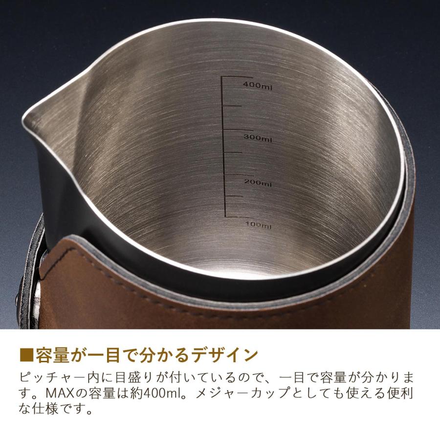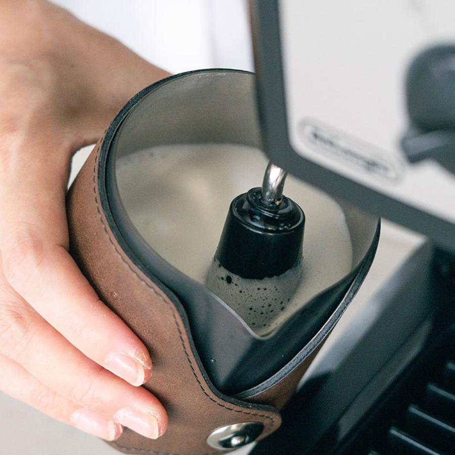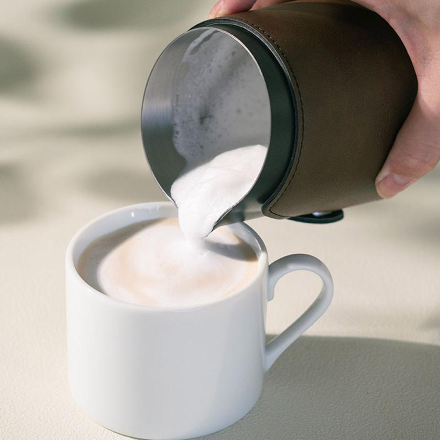 エスプレッソやドリップコーヒーに合わせる、フォームミルクやスチームミルクを作るのに便利なミルクピッチャーです。ハンドルがないため、ラテアートを行う際には注ぎ口と手の距離が近く、繊細な表現がしやすい設計。また、ミルクを使ったアレンジドリンクの攪拌にも幅広く活用でき、非常に便利です。