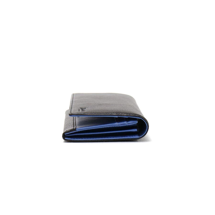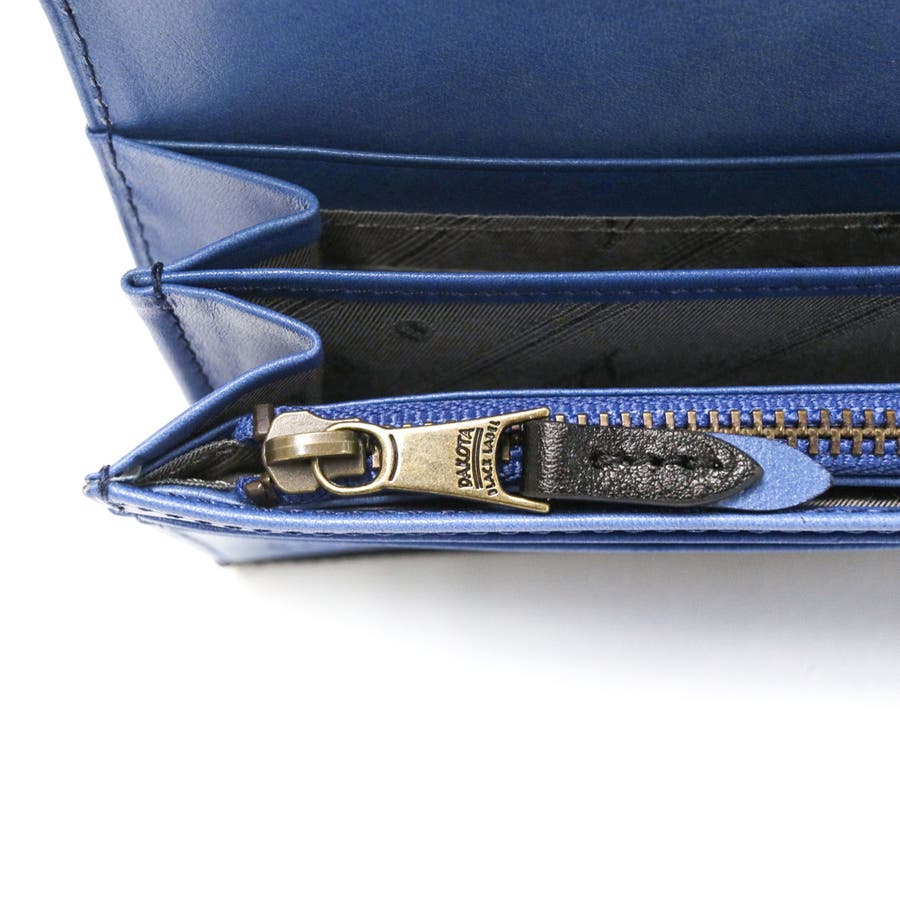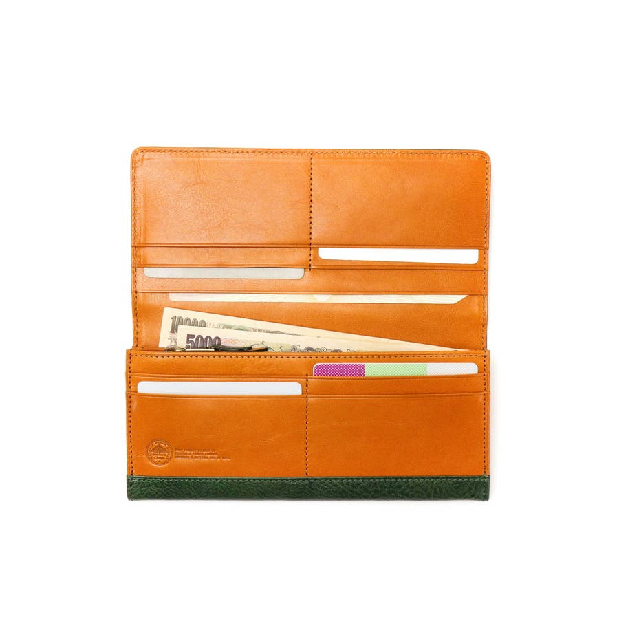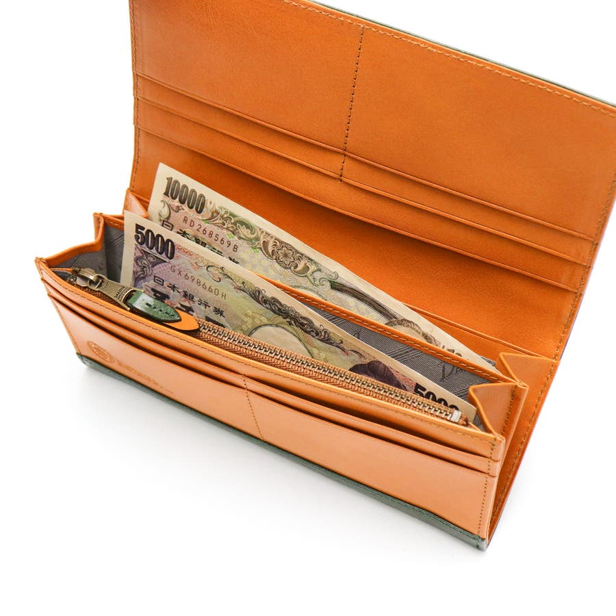かぶせタイプのスマートな本体には、ジップ開閉の小銭入れを搭載。スリムながらもゆったりと硬貨を収納できます。2つに分かれた札入れスペースは、ササマチ仕様で紙幣が取り出しやすいつくりに。札入れの裏と小銭入れの手前、かぶせ部分にフリーポケットを設けたことで、レシートやチケットなどとの仕分けも叶います。さらにカード収納は充実の14枚分を装備し、収納力に長けた仕上がりとなっています。