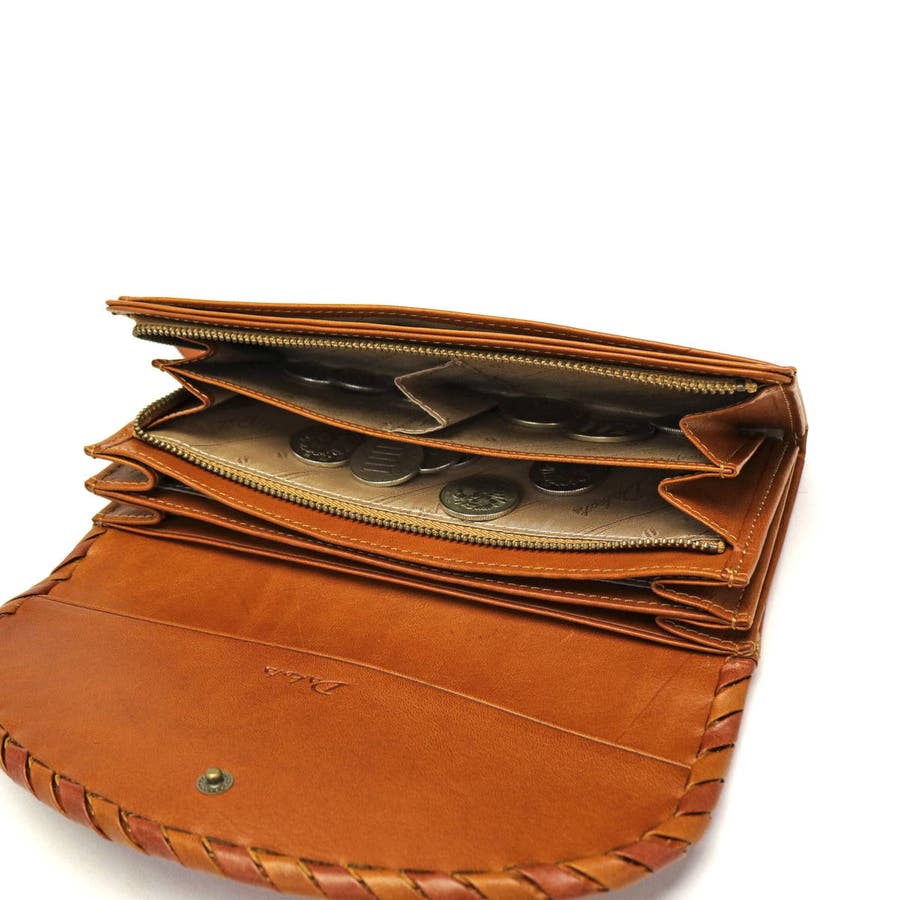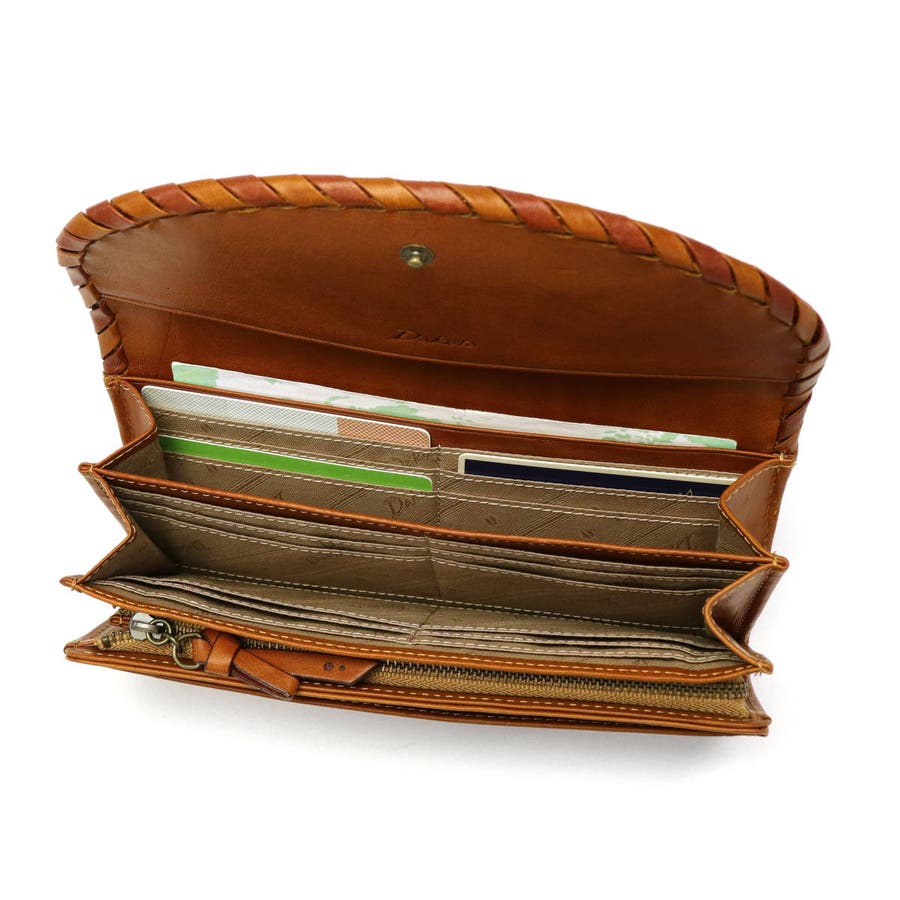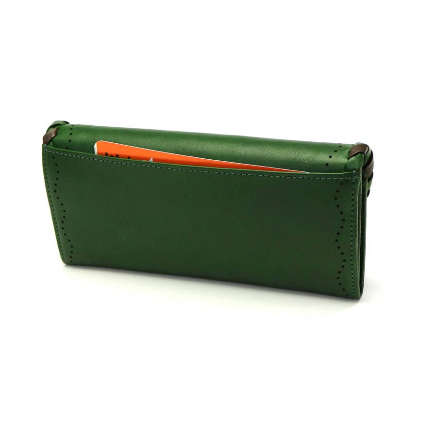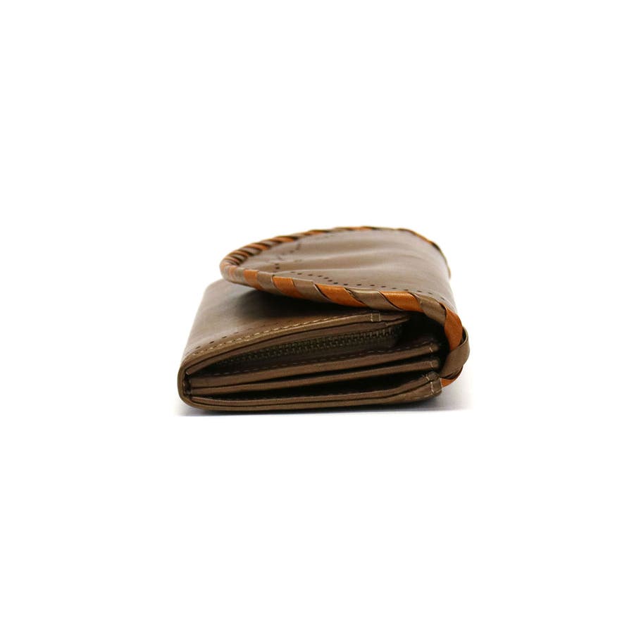 かがりデザインとレーザーカットが目を引くシリーズ、『ポポラリタ』のフラップ付き長財布。カジュアルながらも女性らしい柔らかな印象を与えてくれます。植物タンニン鞣しにオイルを含ませたバケッタ製法で作られたイタリアンレザーは、使い込むほどに革本来の風合い・経年変化を楽しむことできます。