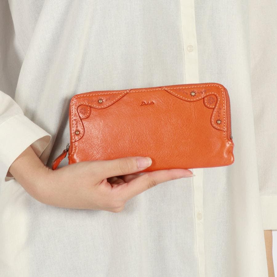 マーガレットの花模様を施したクラシカルな雰囲気漂う財布シリーズ「マーゴット」の薄型コンパクト長財布。紙幣を折らずにスマートに持ち歩きたい方におすすめのデザイン。スリムな設計ながらも、紙幣やレシート類の出し入れがしやすく必要な機能は備えたアイテムとなっています。革の経年変化によってツヤや色の深みが増していくイタリアンレザーの手触りも存分にお楽しみください。