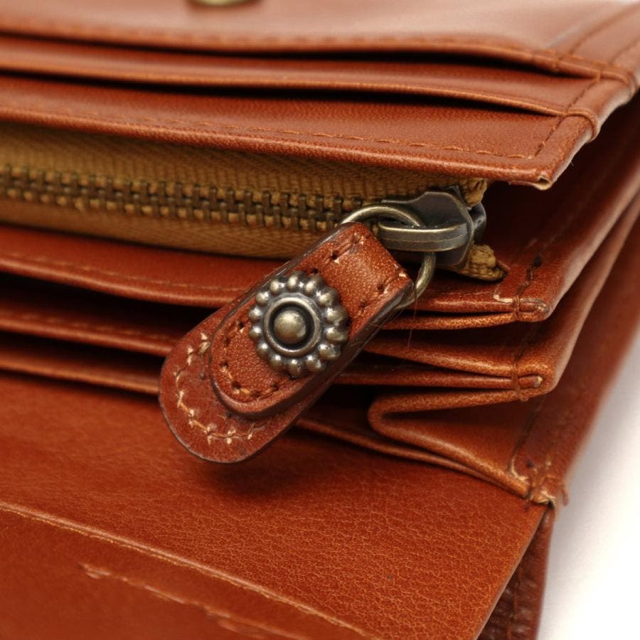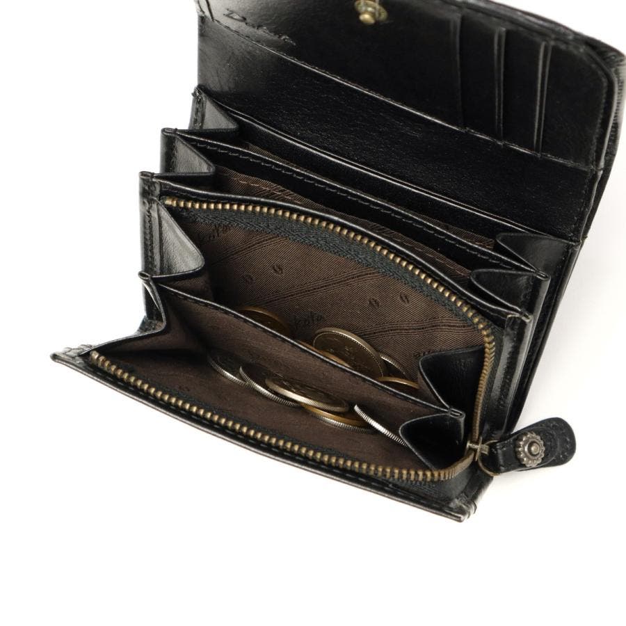 艶やかなイタリアンレザーとアンティーク調の金具が魅力の『リードクラシック2』シリーズ。こちらは、やわらかなカーブを描くフレームが優雅な印象を与えるかぶせタイプの二つ折り財布です。シンプルながらも機能性に富んでおり、カードは11枚収納可能。小銭入れと札入れには仕切りが施され、使い勝手も抜群です。落ち着いた色味とクラシカルなディテールがレトロな雰囲気を漂わせ、使い込むほどに愛着が湧く一品です。
