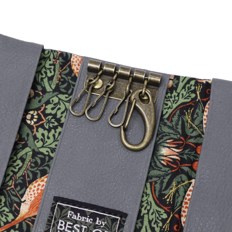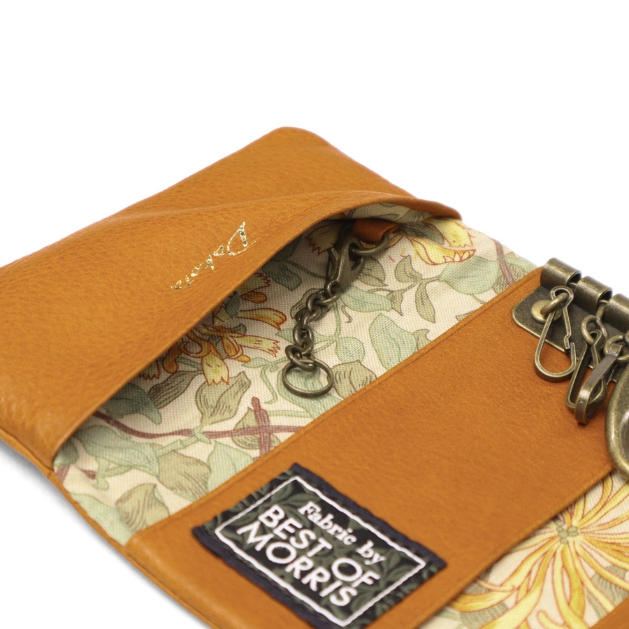 「BEST OF MORRIS」の生地を内装に使用した『バイブリー』シリーズのキーケースです。内装には時代を超えて愛される芸術的なテキスタイルが広がり、カラーごとに異なる内装パターンが魅力です。軽く柔らかな牛革を袋縫いでふっくらと仕上げ、優しく上品な印象に。繊細な馬蹄モチーフのブローチが革の美しさを引き立て、日常を華やかに彩ります。