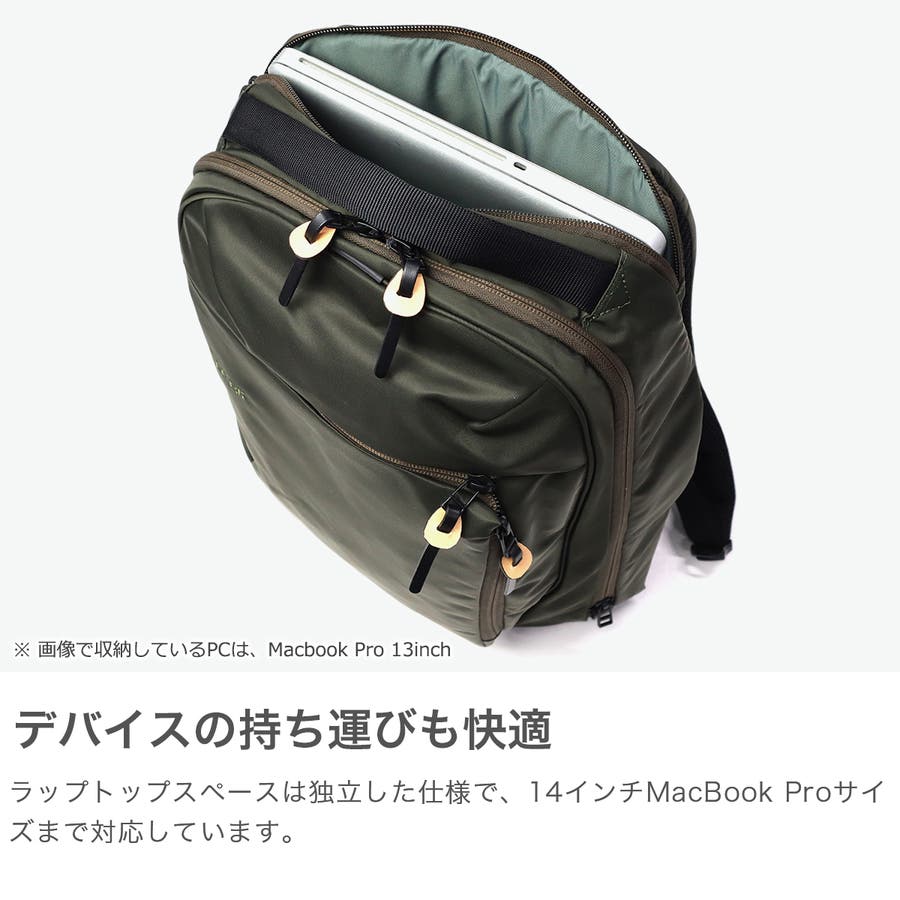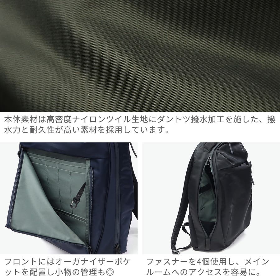 超耐久撥水加工「ダントツ撥水」を施した高密度ナイロンツイル素材を使用したバックパック。抜群の水切れ性と耐久性で、撥水機能が持長続きします。立体的なフォルムが特徴的で、独立したラップトップスペースやキャリーバーへのセットアップなど、ビジネスシーンとの兼用も考えられたデザインと機能性になっています。