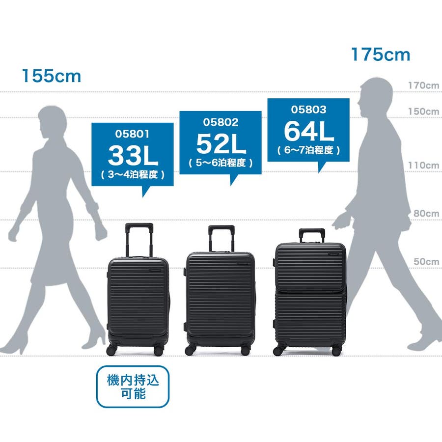 ・エキスパンダブル機能付きの製品は、マチ拡張時の3辺の和が機内持ち込みサイズ、預け入れ無料サイズを超える場合がございます。また、航空会社や飛行機の機種などによって規定が異なりますので、予めご確認の上お求めください。