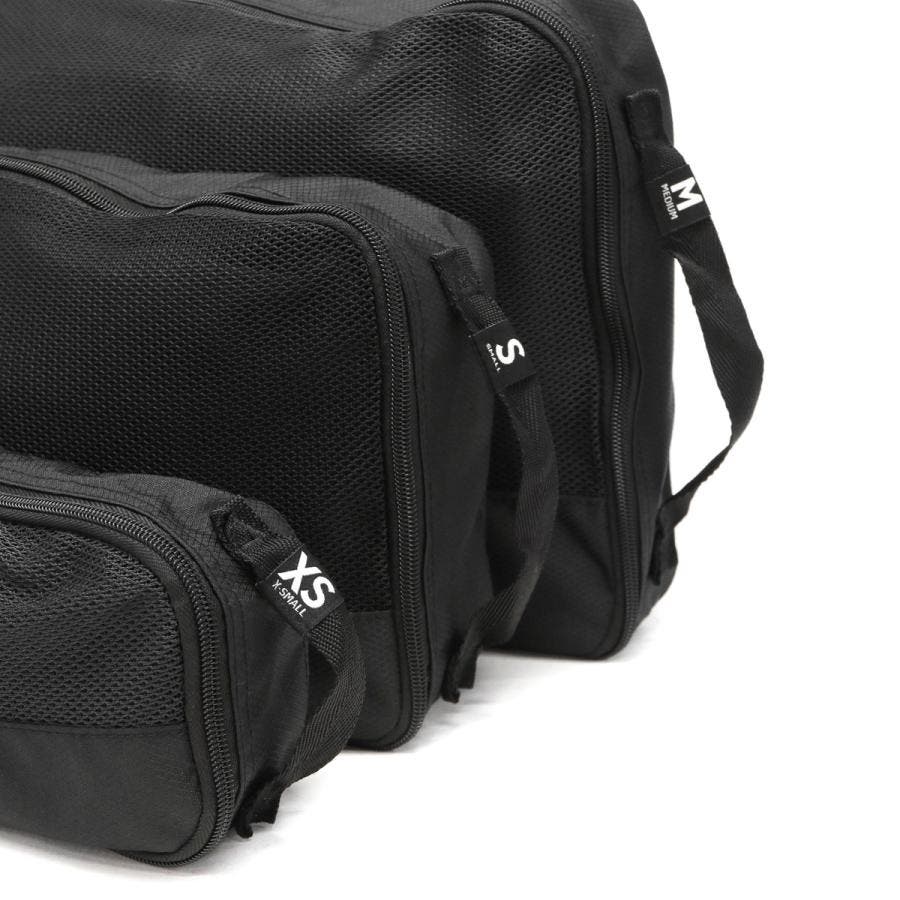 旅行はもちろん、普段使いにも便利なトラベルキューブセット。XS、S、Mの3サイズがセットになっているので用途に合わせて荷物を効率的に収納できます。素材には環境に配慮された100%海洋リサイクル素材を使用。メッシュ部分から中身が確認でき、斜めになったジッパーのデザインにより荷物が詰めやすく、パッキングがスムーズにできます。