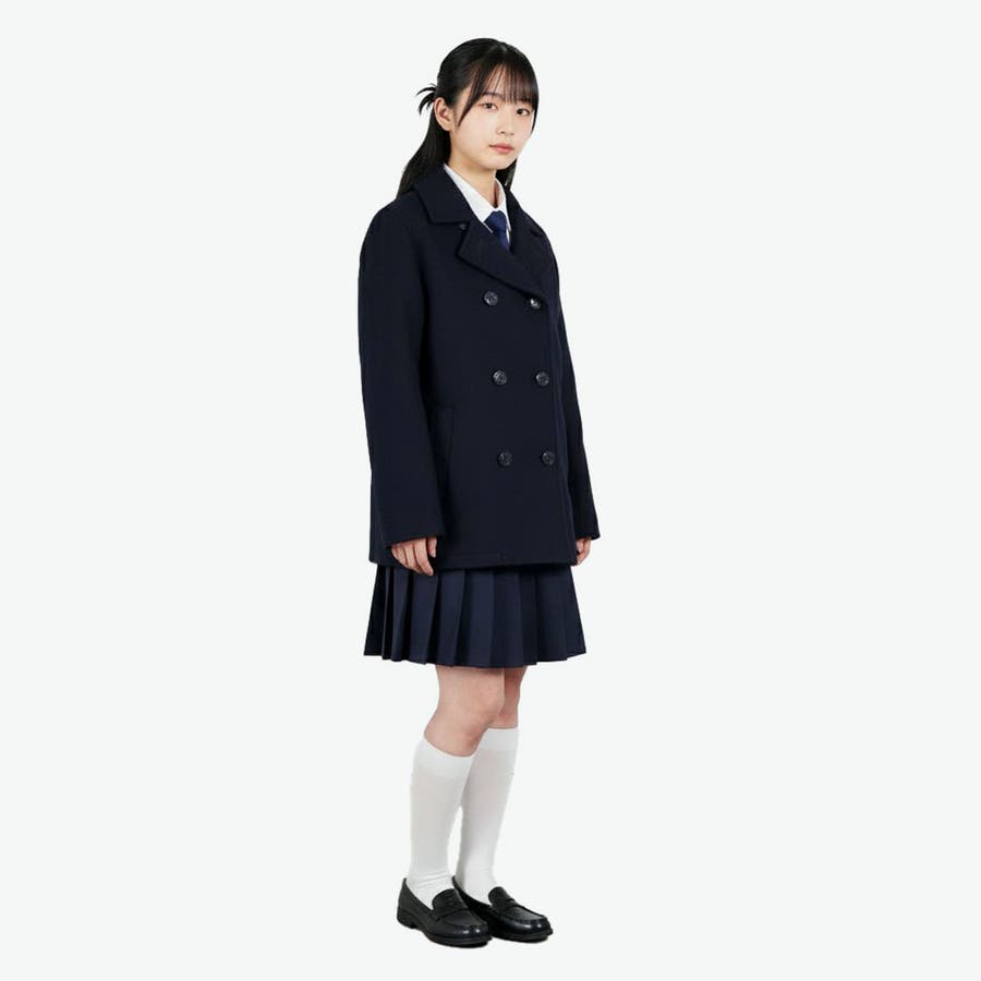 人気の定番デザインのPコート。保温性に優れたウール混メルトン素材を使用し、寒い季節もあたたかく快適に。左右どちらを前にしても着られる本格仕様で、制服の上からでもきれいに着こなせるシルエットが魅力です。オリジナル仕様のボタンとポケット口の女神刺繍がポイントの、通学にぴったりな一着です。