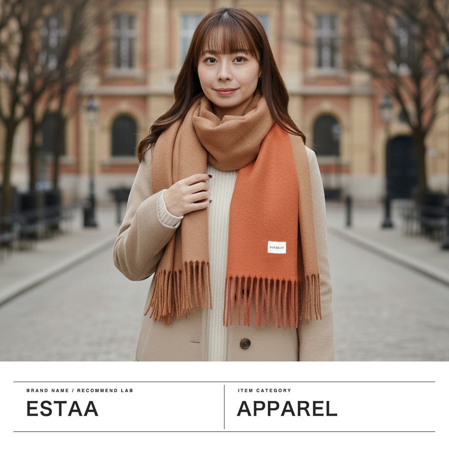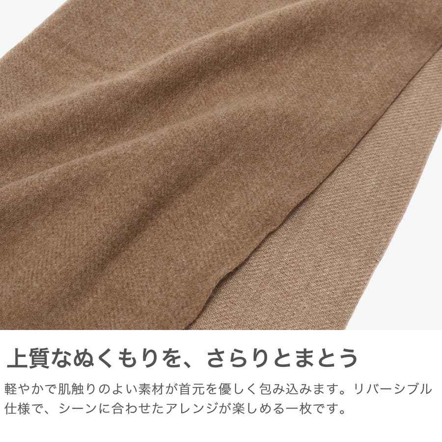 肉厚でふっくらとした生地感と、滑らかなカシミヤのような肌触りが魅力のリバーシブルマフラー。無地のリバーシブル仕様なので、巻き方や気分に合わせて多彩な表情を楽しめます。自宅で手洗いできるケアのしやすさもポイントです。