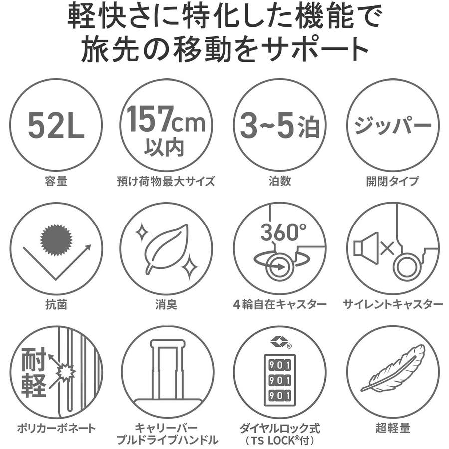 フリクエンター史上、最も軽さに特化したシリーズ『LIEVE/リエーヴェ』から容量52Lのスーツケースが登場。構造や細部のパーツにこだわり、限りなく重量負担を減らし軽快な使い心地が魅力的。また、トップレベルの静かさを誇るブランドオリジナルのタイヤを採用した他、抗菌・消臭効果の付いた収納部や便利なTSAロックなど優れた機能性も同時に揃えたアイテムです。