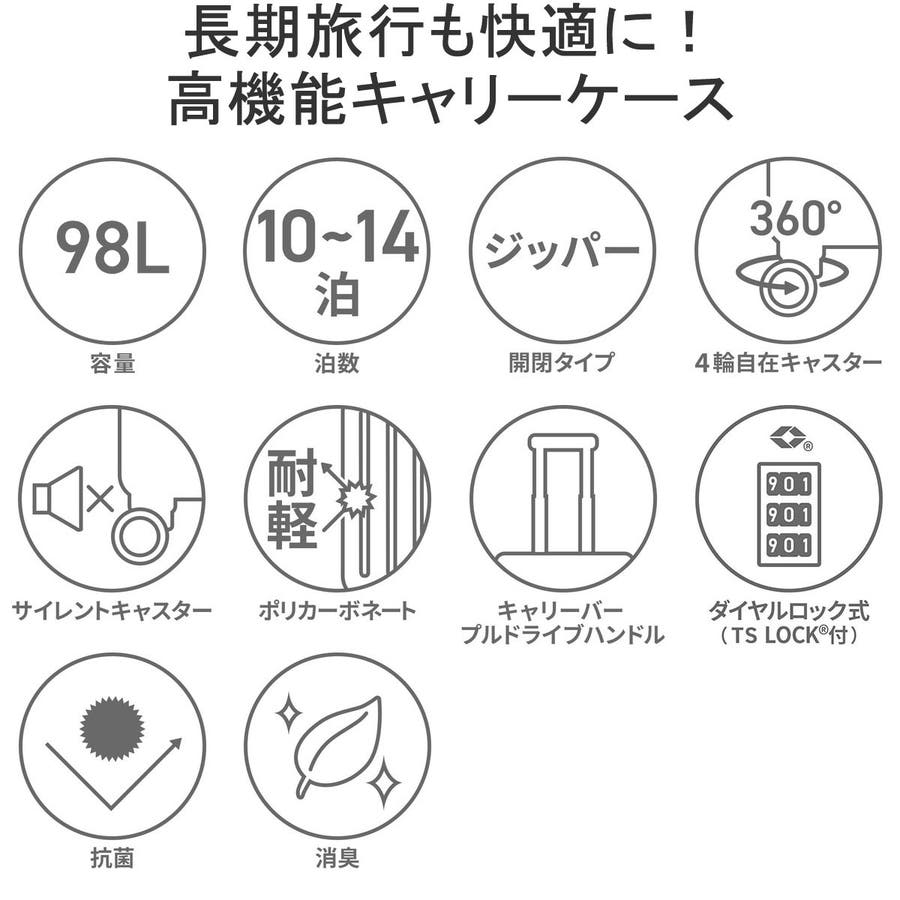フリクエンター史上、最も軽さに特化したシリーズ『LIEVE/リエーヴェ』から容量98Lのスーツケースが登場。頼もしい収納力で、長期の旅行にもおススメです。構造や細部のパーツにこだわり、限りなく重量負担を減らし軽快な使い心地になっているのが特徴。また、トップレベルの静かさを誇るブランドオリジナルのタイヤを採用した他、抗菌・消臭効果の付いた収納部や便利なTSAロックなど優れた機能性も同時に揃えたアイテムです。