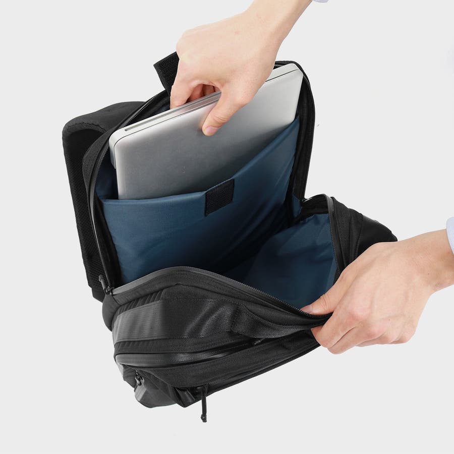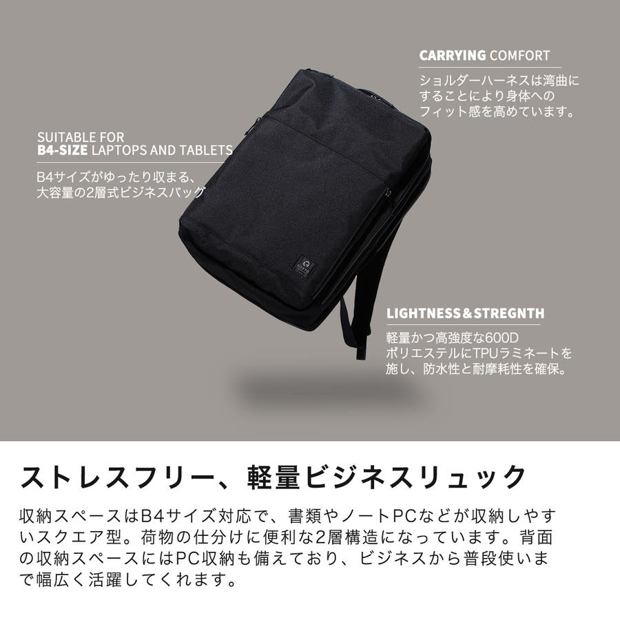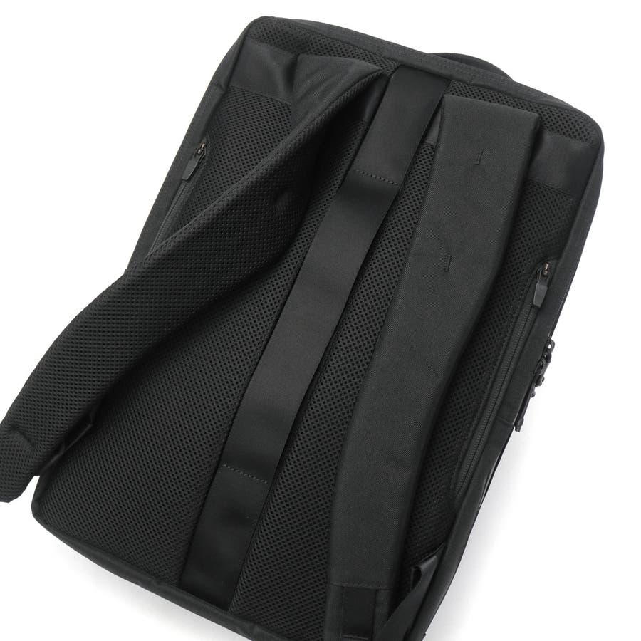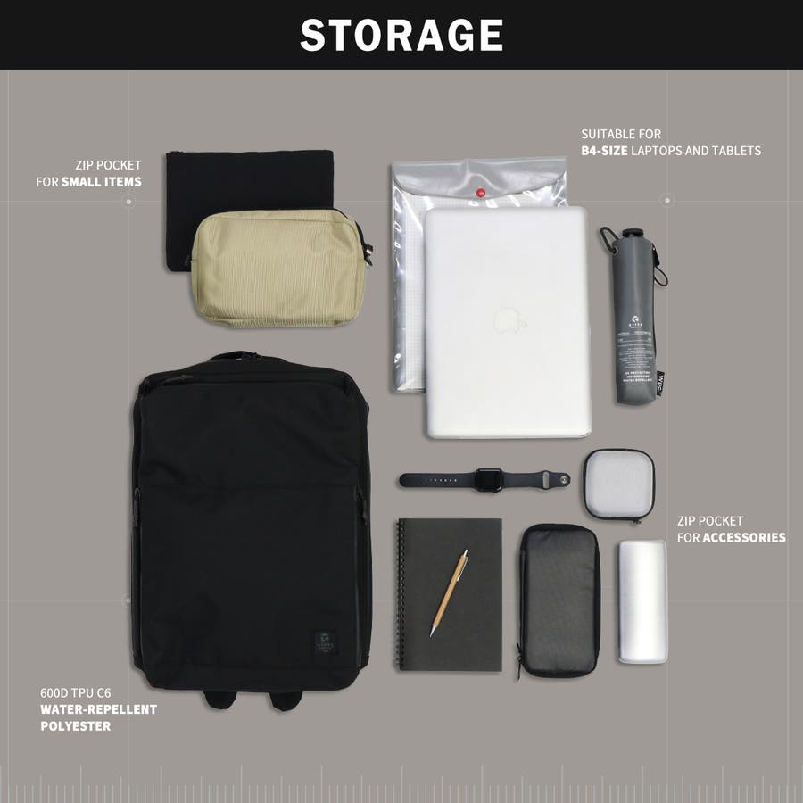 収納スペースはB4サイズ対応で、書類やノートPCなどが収納しやすいスクエア型。荷物の仕分けに便利な2層構造になっています。伸縮性と強度のあるパワーメッシュを使用したポケットを内蔵しており、厚みのある小物の収納にも便利です。背面の収納スペースにはPC収納も備えており、ビジネスから普段使いまで幅広く活躍してくれます。