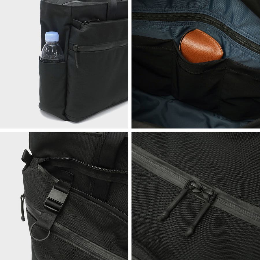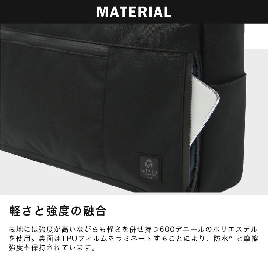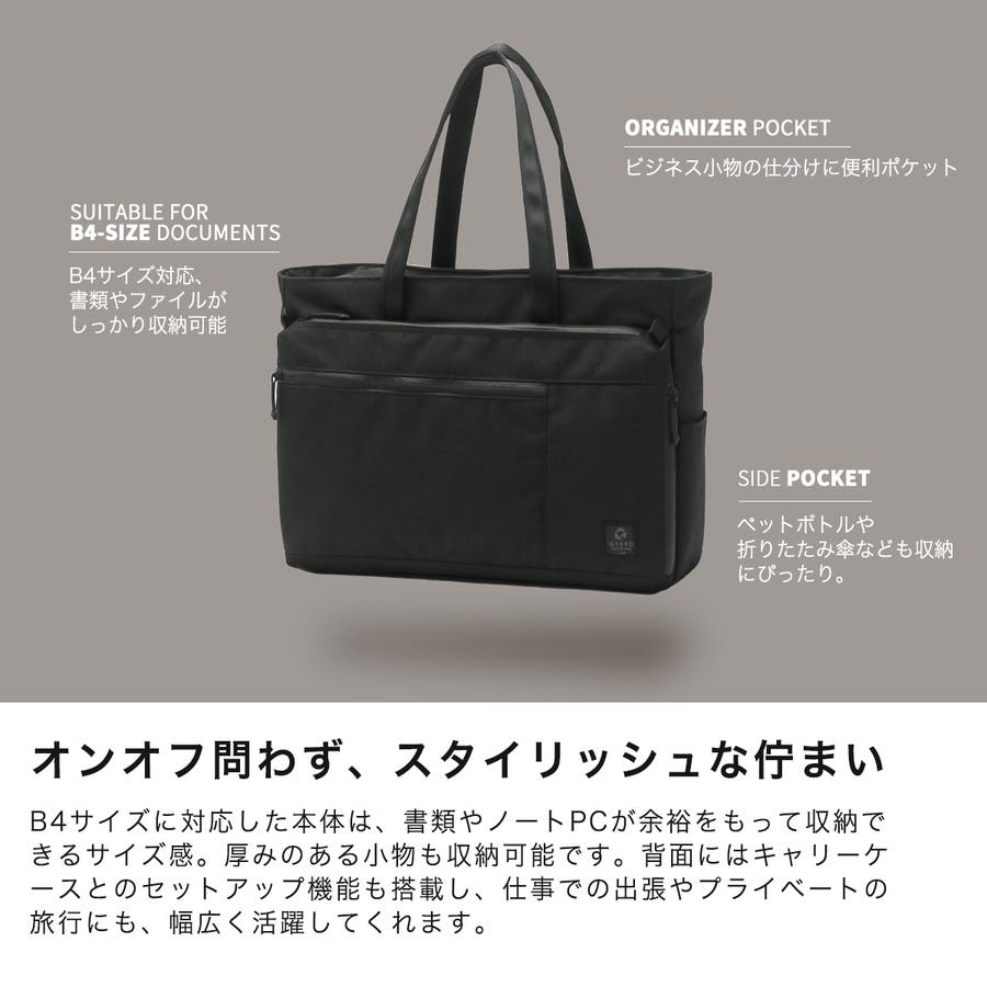 B4サイズに対応した本体は、書類やノートPCが余裕をもって収納できるサイズ感。大きめのジップポケットやPC収納を装備しており、仕分けのしやすい設計になっています。内蔵されたポケットには、伸縮性と強度のあるパワーメッシュを使用。厚みのある小物も収納可能です。背面にはキャリーケースとのセットアップ機能も搭載し、仕事での出張やプライベートの旅行にも、幅広く活躍してくれます。
