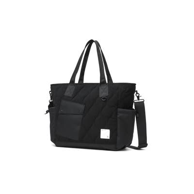 斜めに取り付けられたフラップ式のティルトポケットが特徴的な2WAYトートバッグ。内装にはLAPTOPを収納できるポケットを設けており、両サイドにもドローコード式のポケットを設けることで傘やペットボトルの収納が可能な、機能性に富んだ仕様。