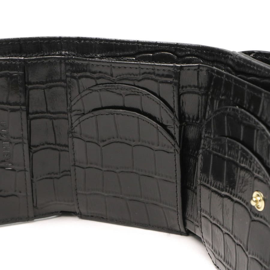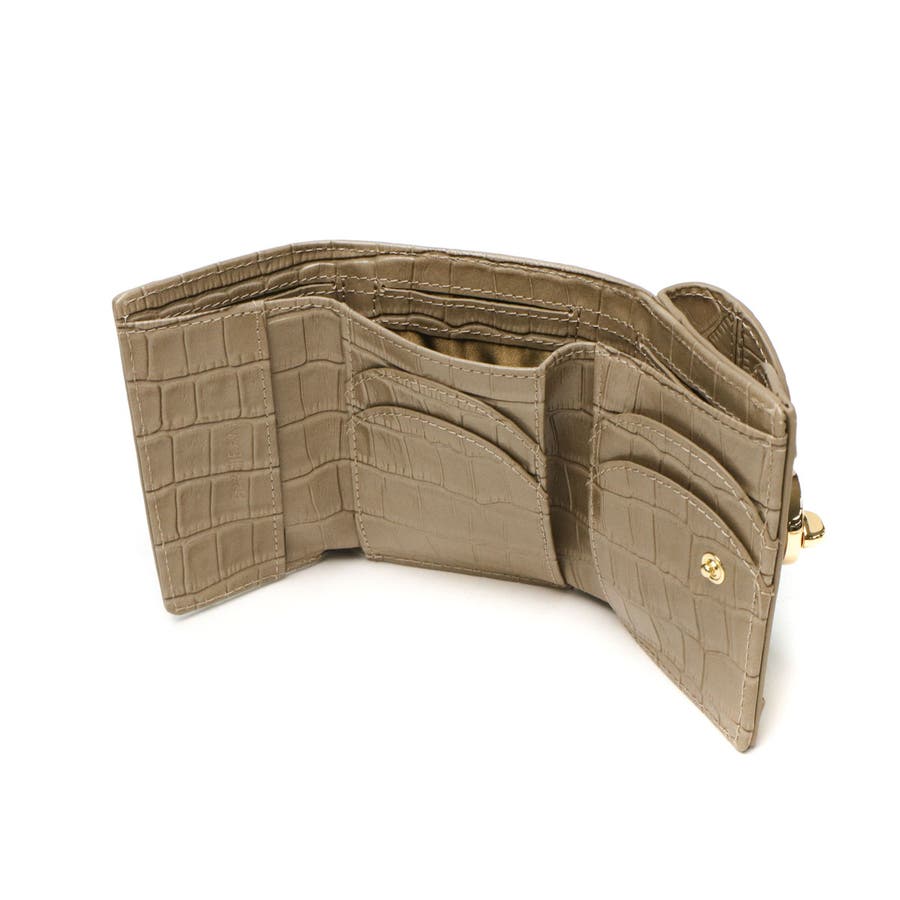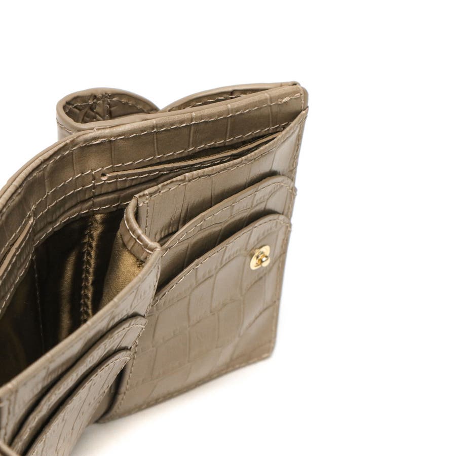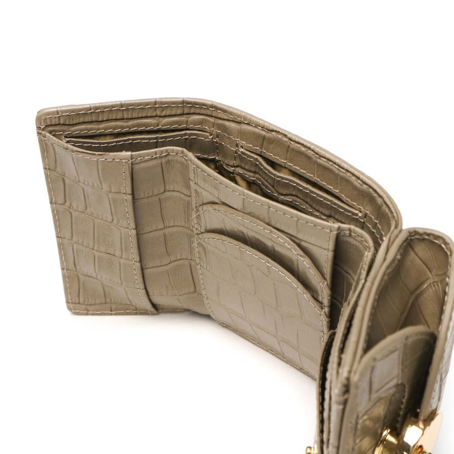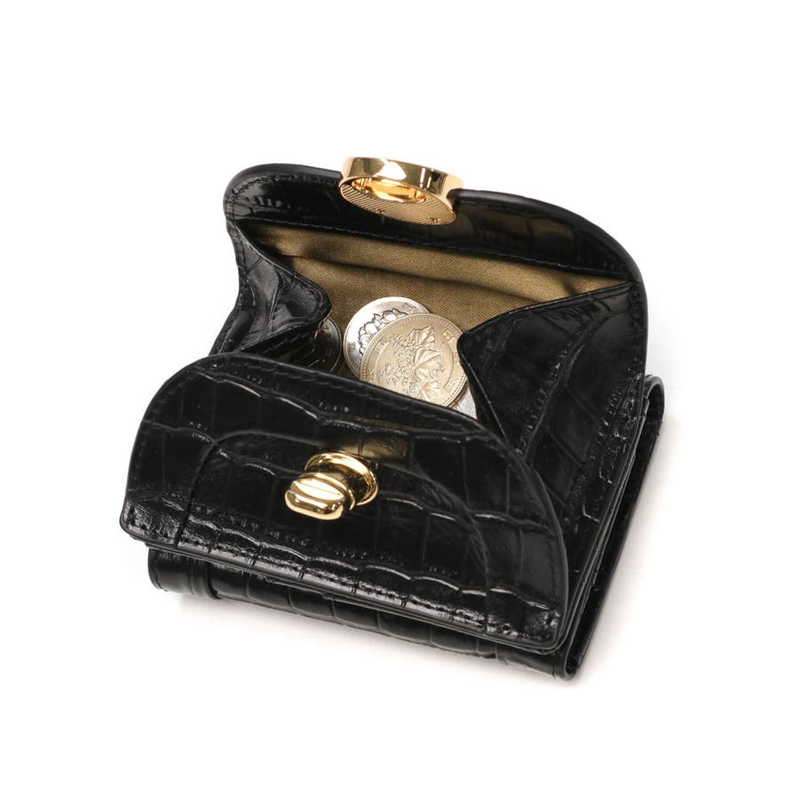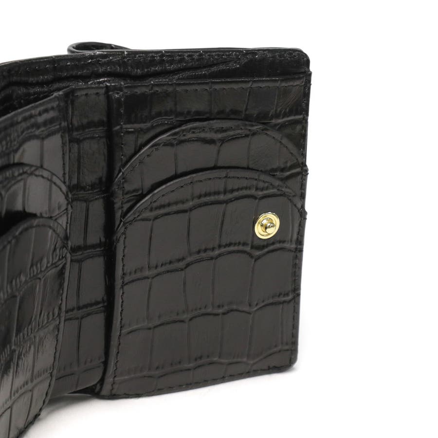 人気定番モデルをクロコ型押しした、三つ折りウォレット。本体は、小銭入れやお札入れも大きく開く使い勝手の良い設計に。さらにカード入れを7つ、ポケットが3つなど収納スペースを多数搭載しています。また上品なレザーに、丸いゴールドの金具をあしらうことで、女性らしさと高級感をプラスしたルックスに仕上がっています。