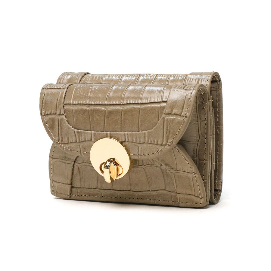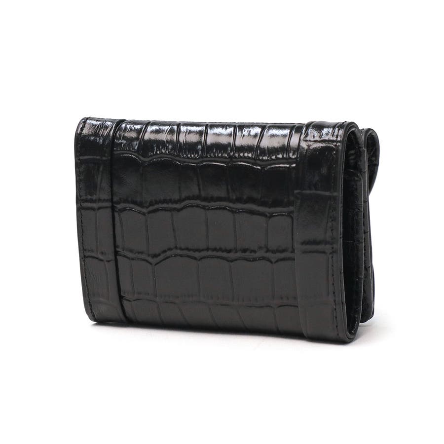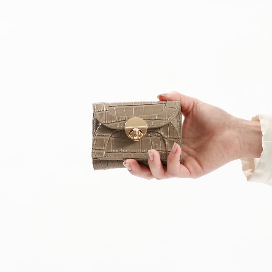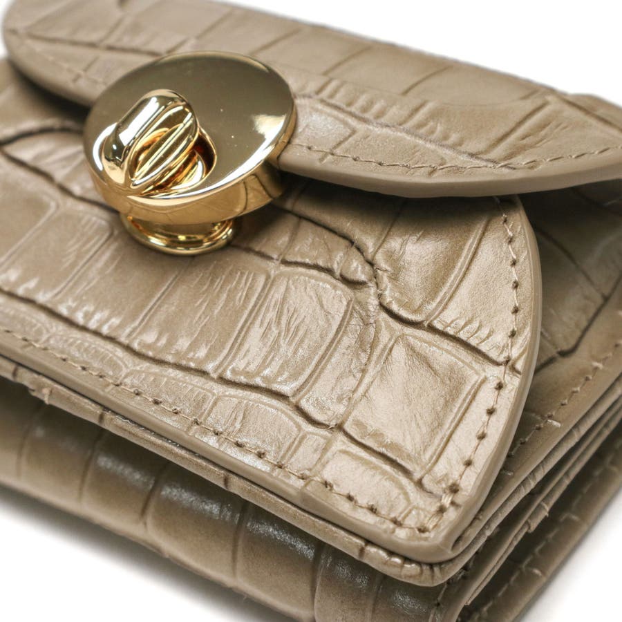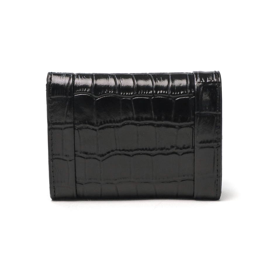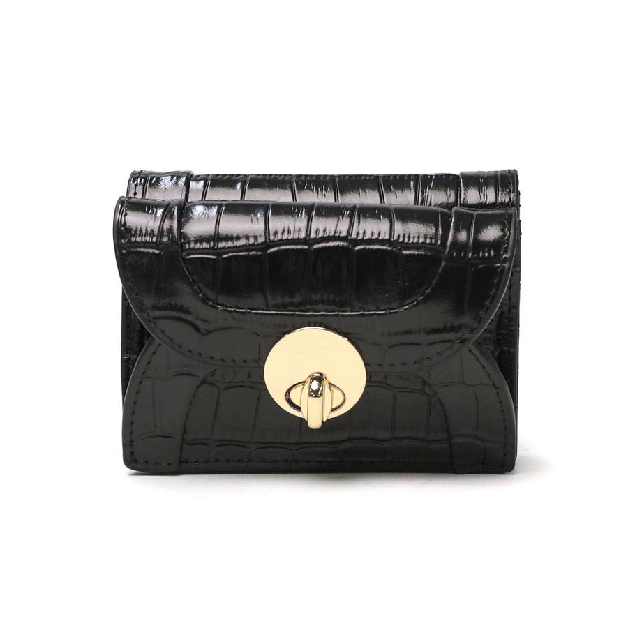 人気定番モデルをクロコ型押しした、三つ折りウォレット。本体は、小銭入れやお札入れも大きく開く使い勝手の良い設計に。さらにカード入れを7つ、ポケットが3つなど収納スペースを多数搭載しています。また上品なレザーに、丸いゴールドの金具をあしらうことで、女性らしさと高級感をプラスしたルックスに仕上がっています。