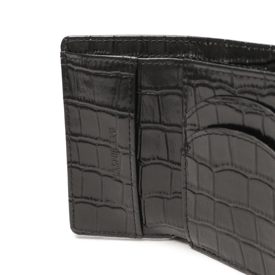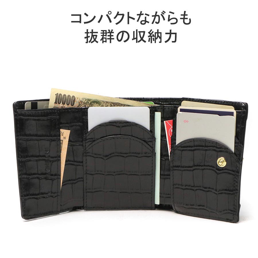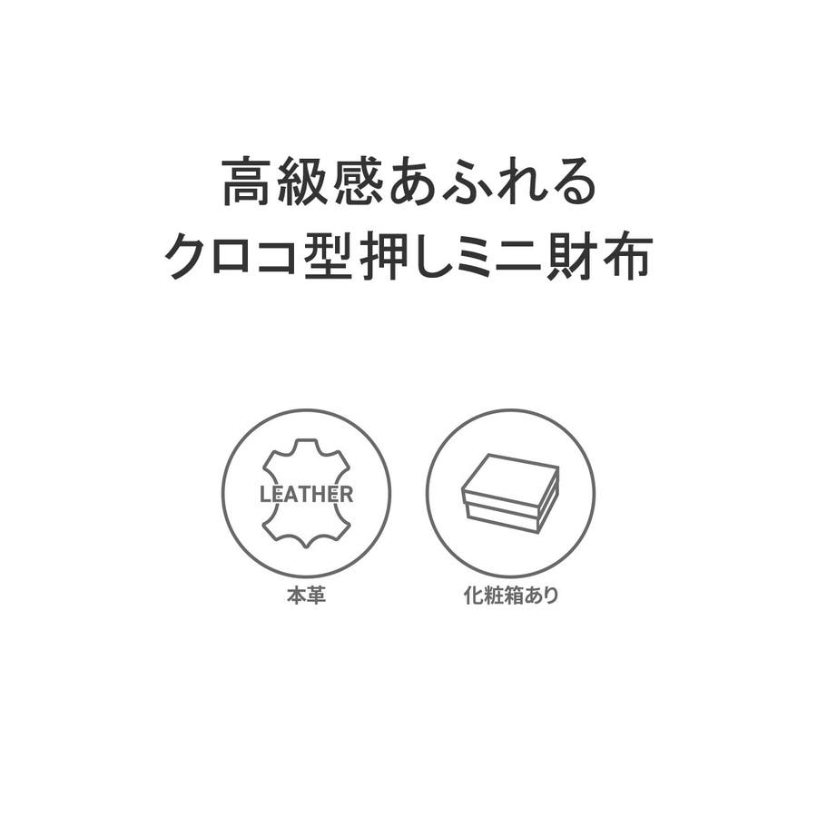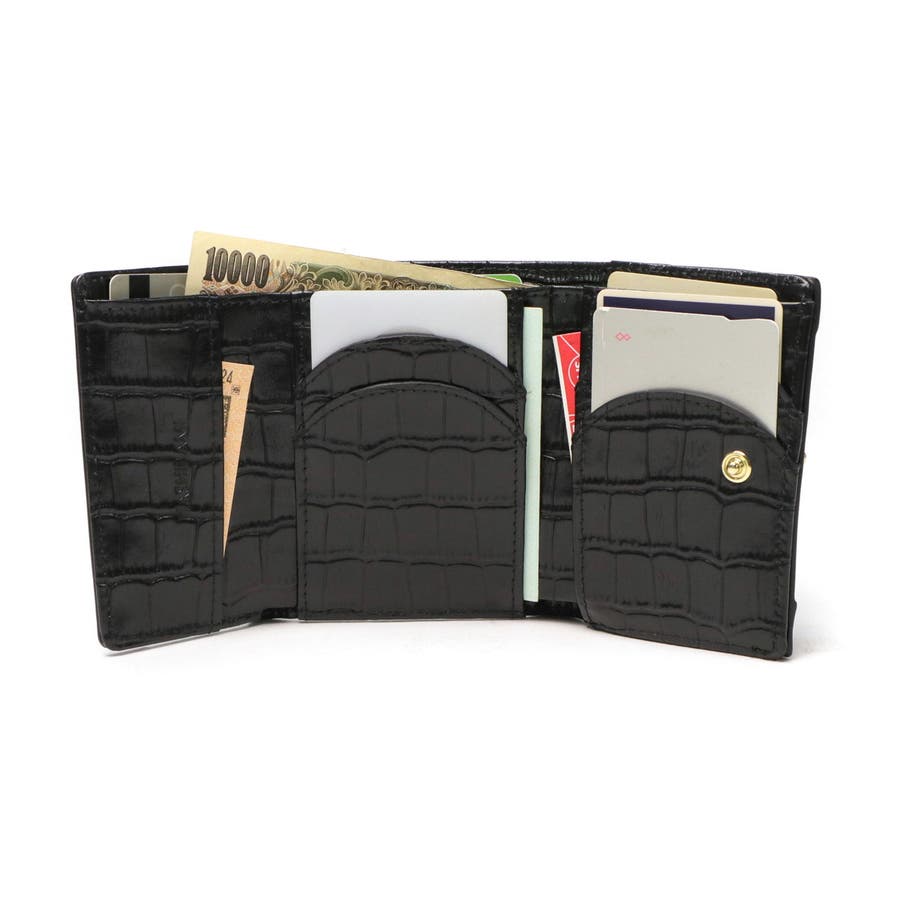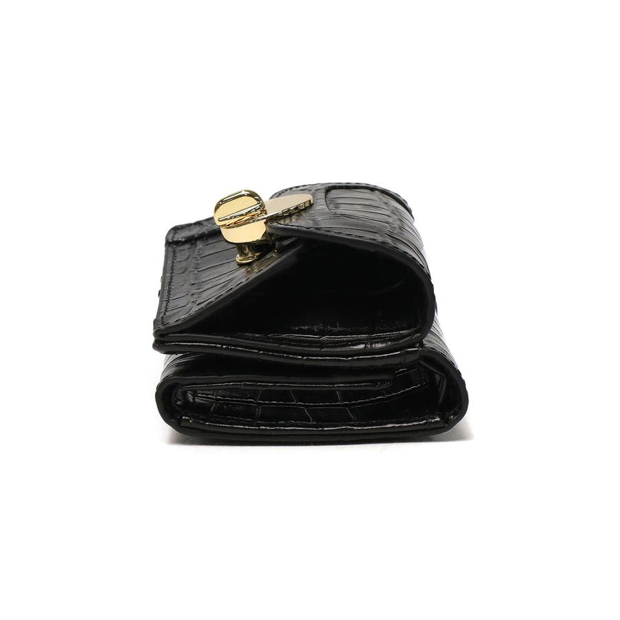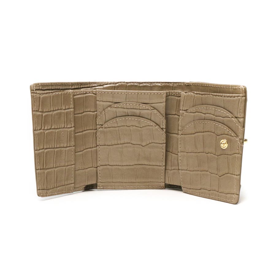 人気定番モデルをクロコ型押しした、三つ折りウォレット。本体は、小銭入れやお札入れも大きく開く使い勝手の良い設計に。さらにカード入れを7つ、ポケットが3つなど収納スペースを多数搭載しています。また上品なレザーに、丸いゴールドの金具をあしらうことで、女性らしさと高級感をプラスしたルックスに仕上がっています。