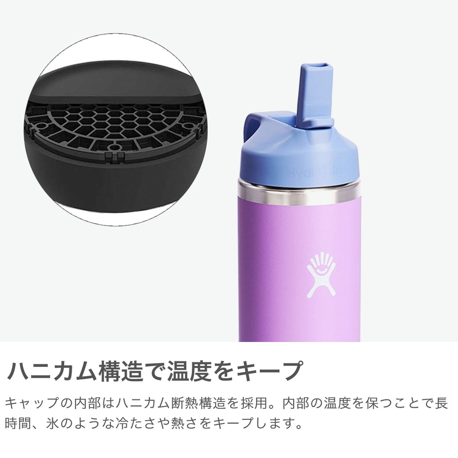 お子様が飲みやすいストロー付きの532ml容量ステンレスボトル。本体は真空断熱構造なので、温度差で表面が結露することもありません。人体に悪影響を及ぼすビスフェノールA(BPA)を含まない素材を使用しているため、お子さんにも安心してお使いいただけます。ボディ表面に特殊なパウダー加工を施し、濡れた手でも握りやすい仕様に。ハニカム構造を採用したキャップが、温度を長くキープしてくれます。