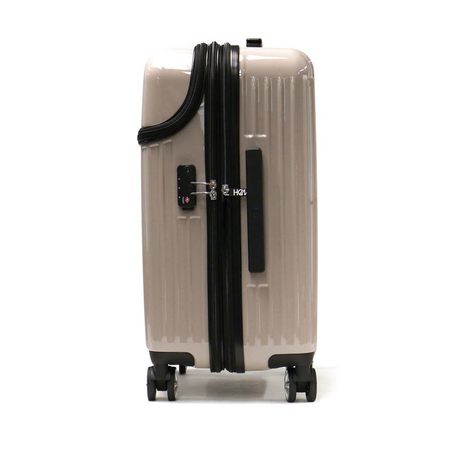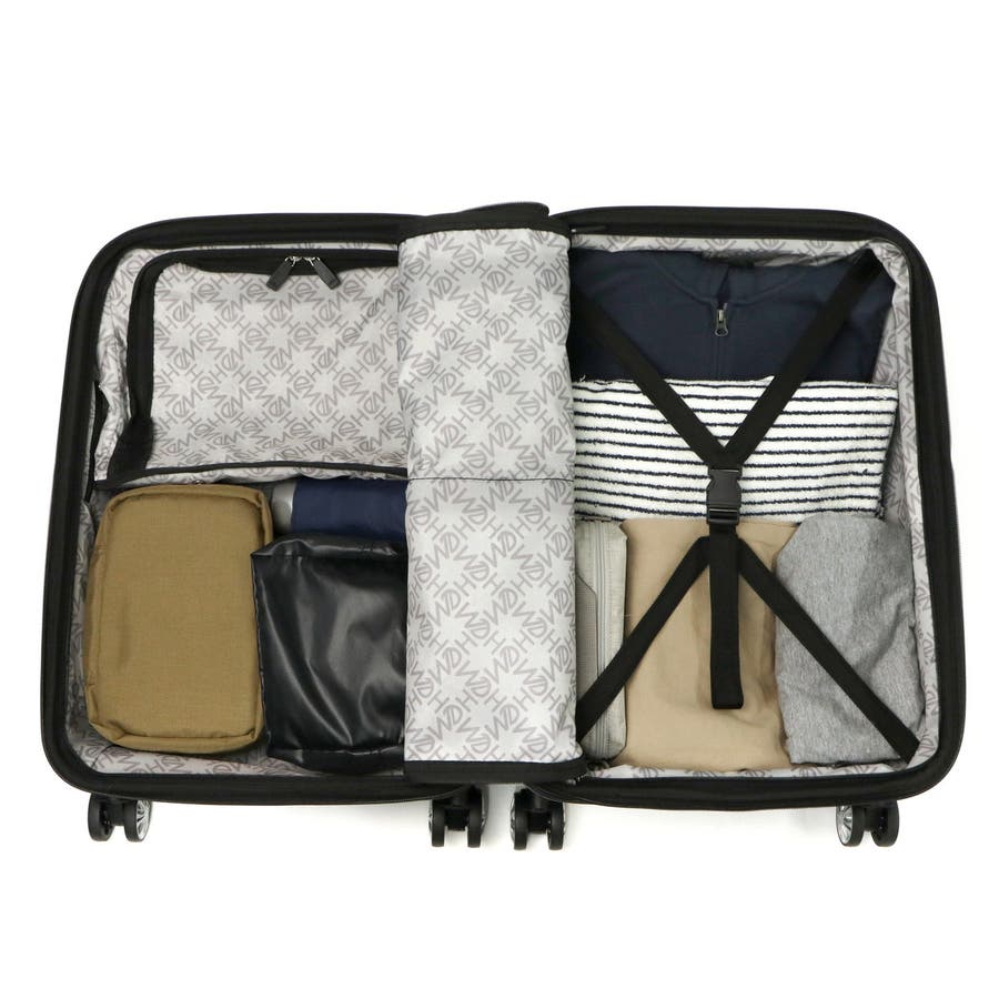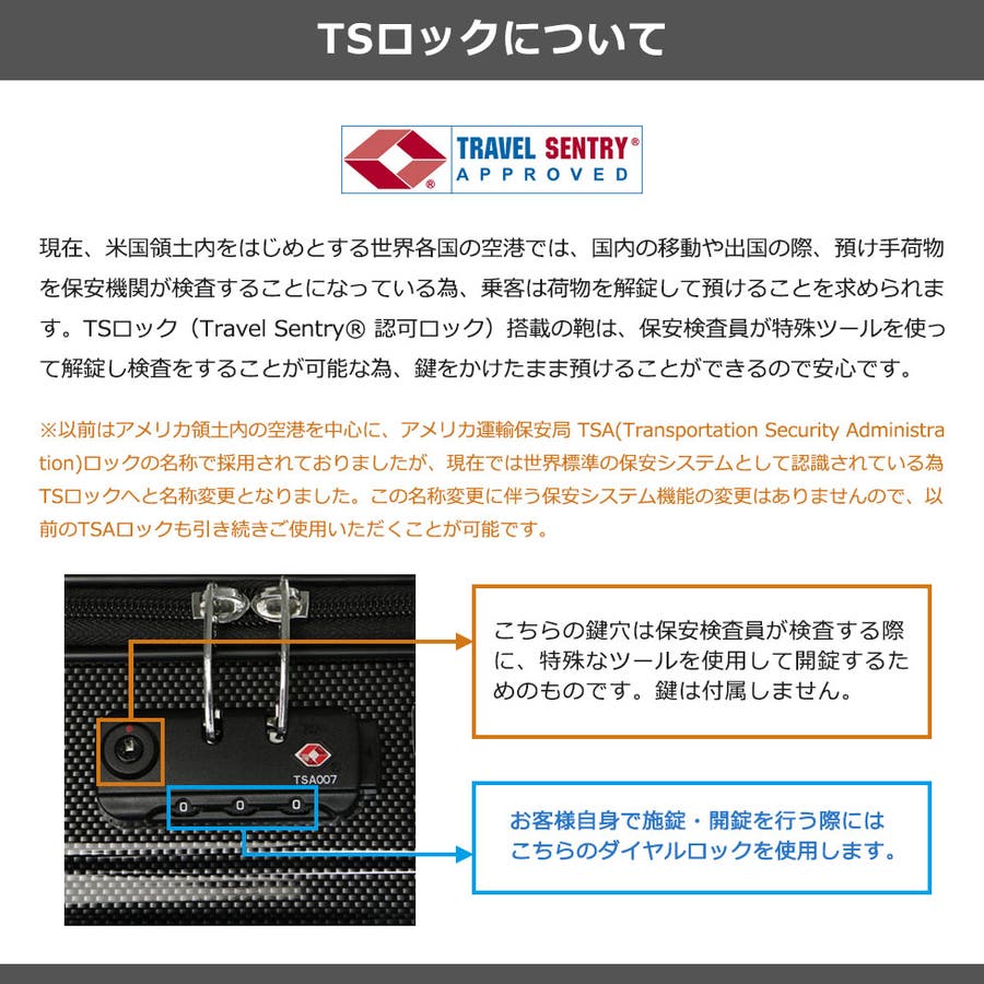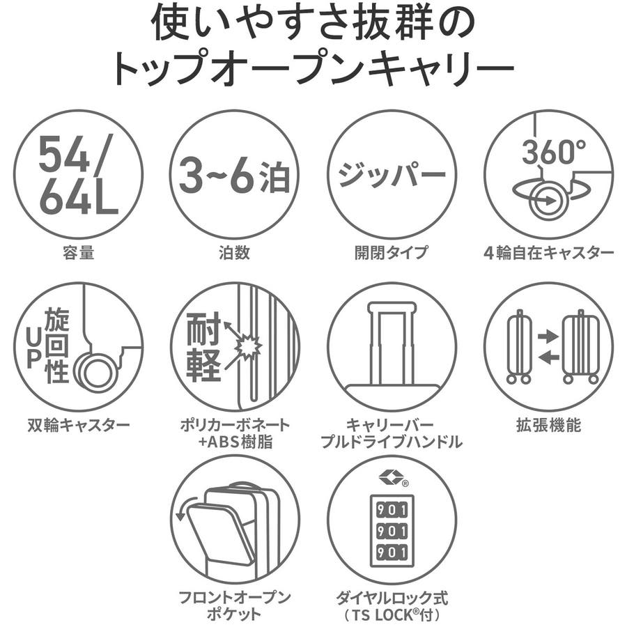 機能性とデザイン性の両方を兼ね揃えたトップオープンキャリー。フロントポケットは必要な荷物をすぐに取り出せる設計となっており、内側背面のファスナーを開くとメインルームにもアクセス可能です。本体サイドはダイヤル式TSAロックを搭載し、トップオープン部分用に南京錠のTSAロックも付属。海外のセキュリティチェックもスムーズに行えます。また男女問わず使えるシンプルなデザインもポイント。