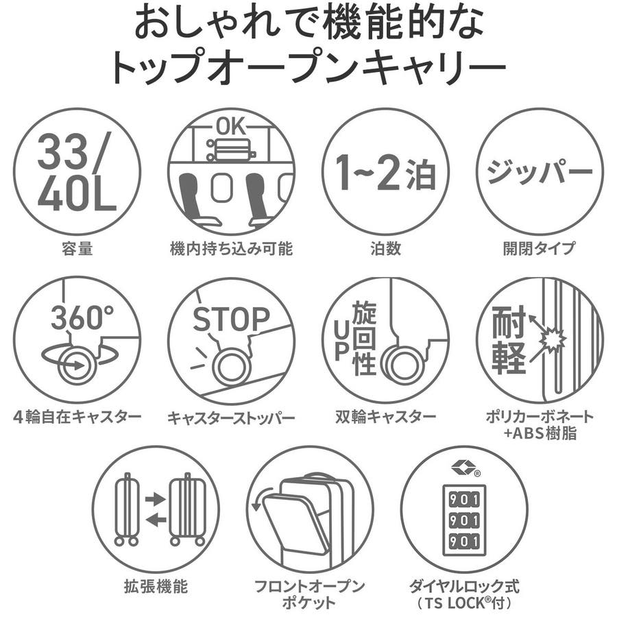 機能的でおしゃれなトップオープンキャリー。こちらは、機内持ち込み可能モデルです。サイドのファスナーをひらくことで、33~40Lまで容量が拡張するエキスパンダブル機能付きとなっています。メインファスナーにはTSダイヤルロック、トップオープン部分にはTSA南京錠を設けている為セキュリティ面も抜群。さらにキャスターストッパーも搭載しており、思わぬ走行を防止できるなど、使いやすい機能性で充実しています。