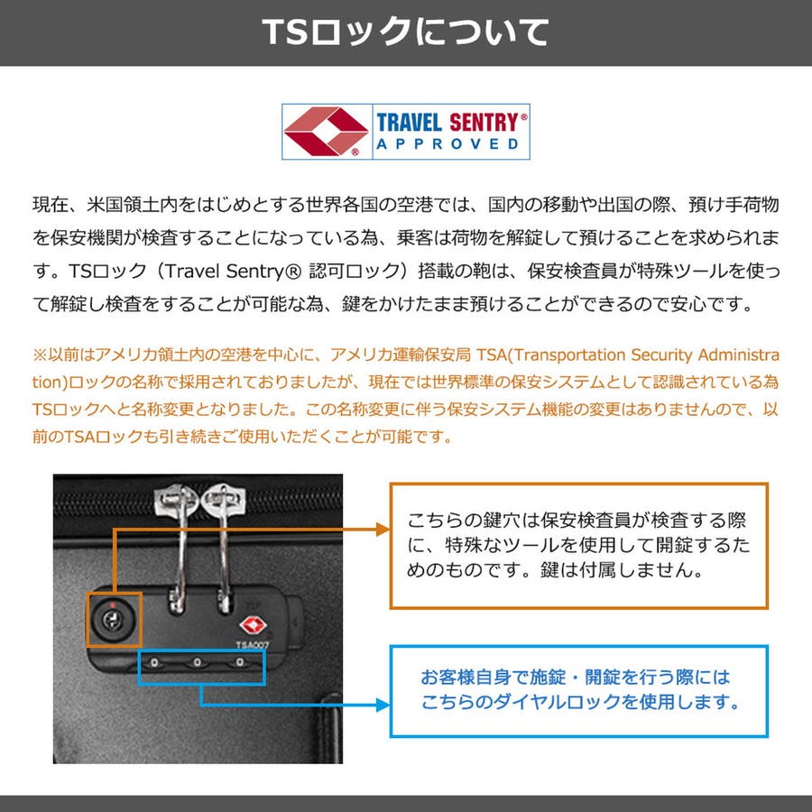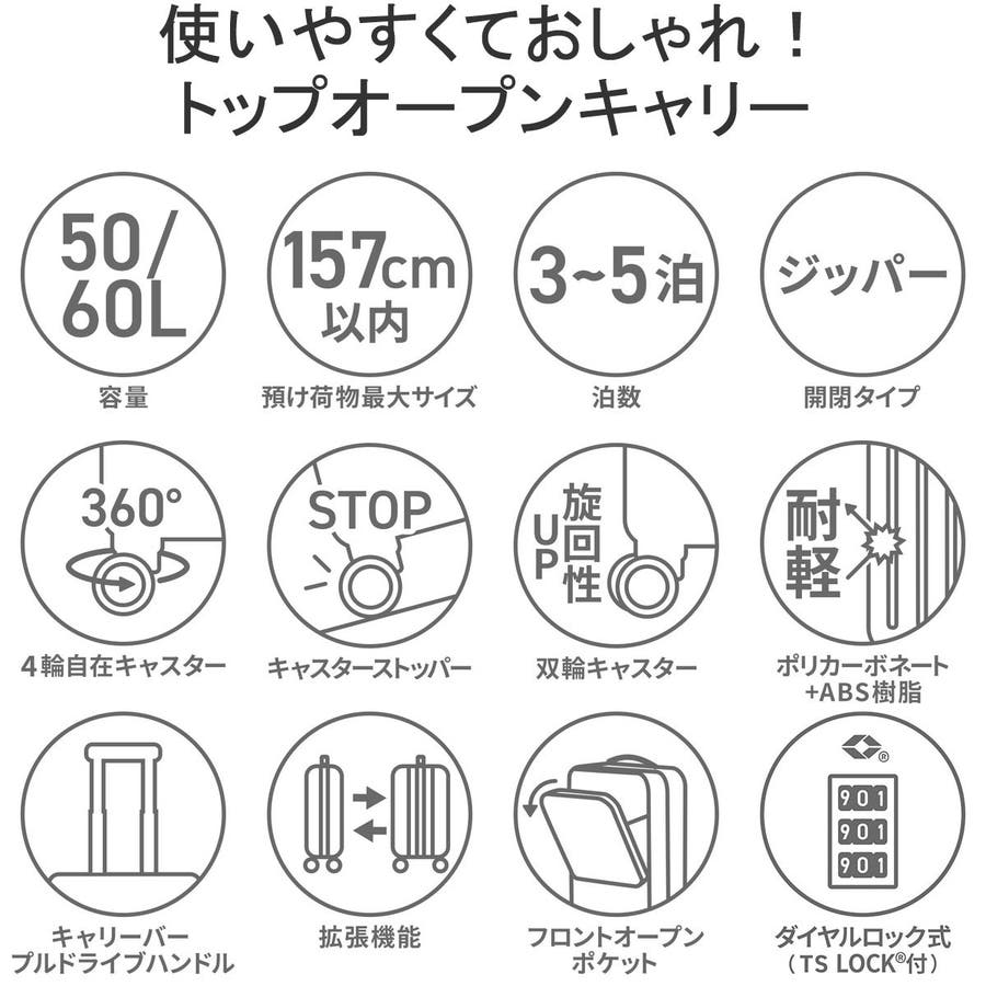機能的でおしゃれなトップオープンキャリー。こちらは、3~5泊程度の旅行におすすめのモデルです。サイドのファスナーをひらくことで、50~60Lまで容量が拡張するエキスパンダブル機能付きとなっています。メインファスナーにはTSダイヤルロック、トップオープン部分にはTSA南京錠を設けている為セキュリティ面も抜群。さらにキャスターストッパーも搭載しており、思わぬ走行を防止できるなど、使いやすい機能性で充実しています。