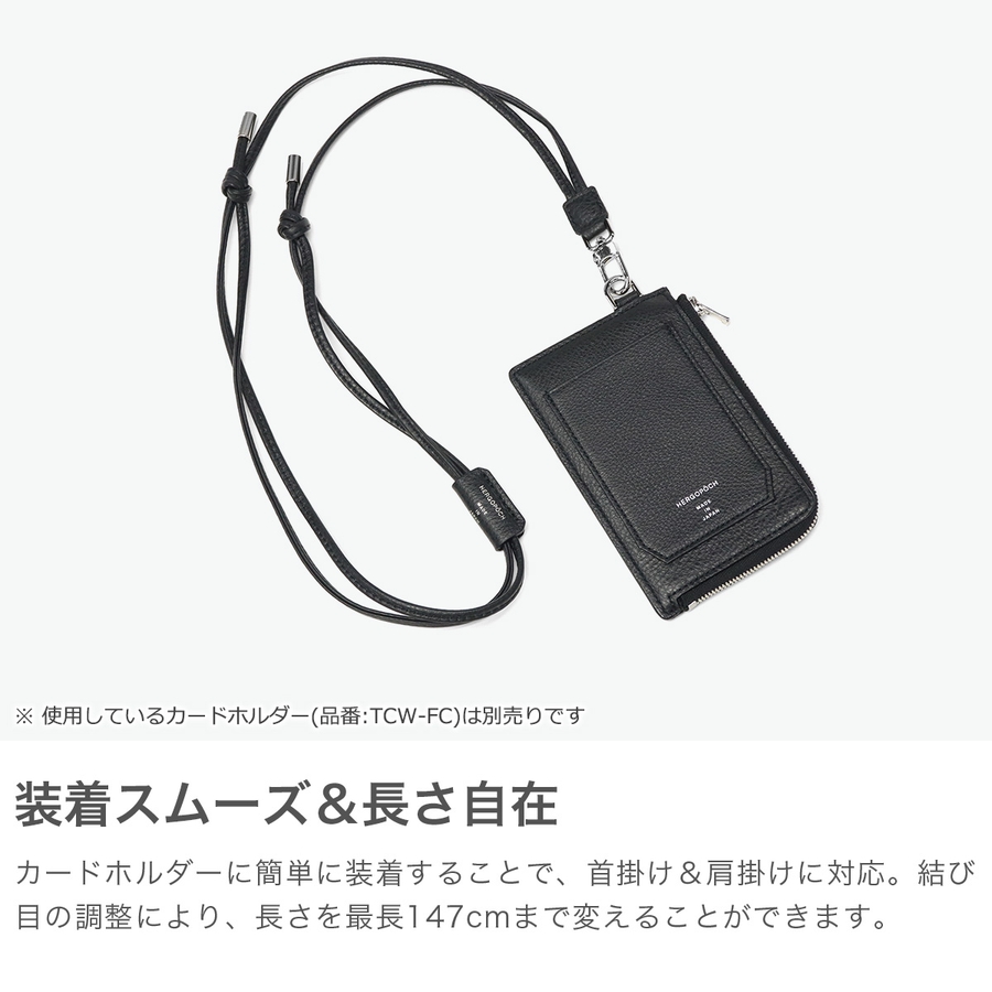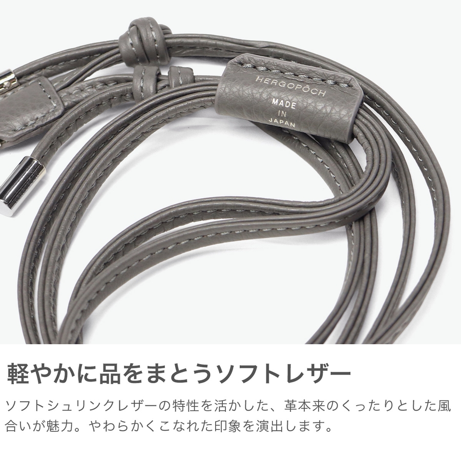 HERGOPOCHの使用するレザーで最もソフトなシュリンクレザーを使用した『TC』シリーズのストラップです。首掛けにも斜めがけにもできる仕様になっており、メタルパーツがアクセントになった遊び心あるデザインがポイント。組み合わせて使える別売りの革小物などと、合わせてのご使用がおすすめです。