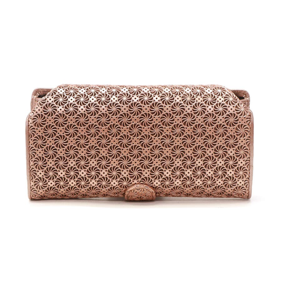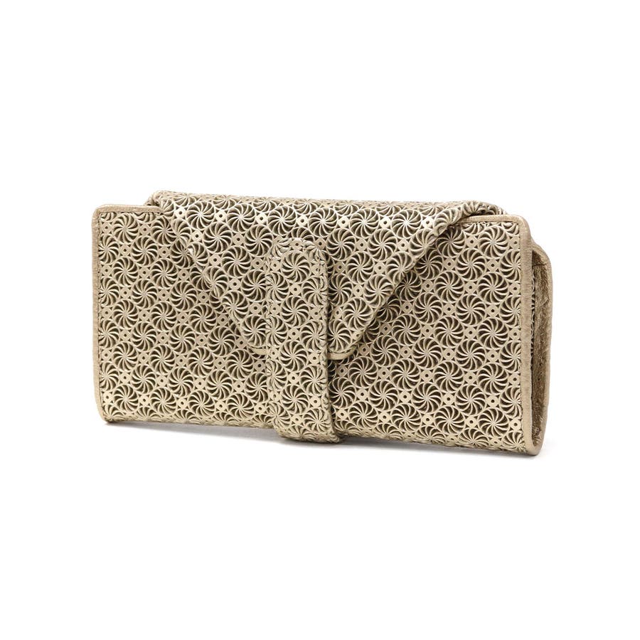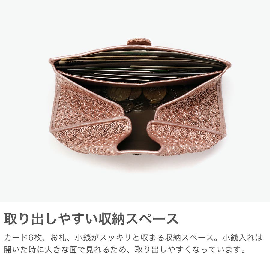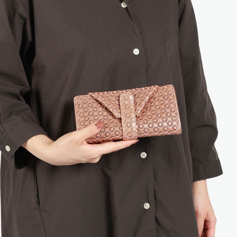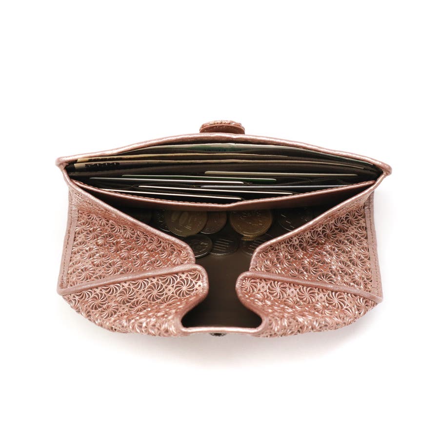 独特なスクリューデザインが人気の『GIRASOLE/ジラソーレ』シリーズの長財布ミニ。牛革に型押しと型抜きを施した、上品でいて軽やかな仕上がりが特徴です。スナップボタンを外すとお財布全体が箱型の作りになっており、小銭入れのように開きます。また蛇腹のように仕切りが重なり合うカードポケットも魅力。エレガンスと実用性を兼ね備え、日常のスタイルを一層引き立てます。