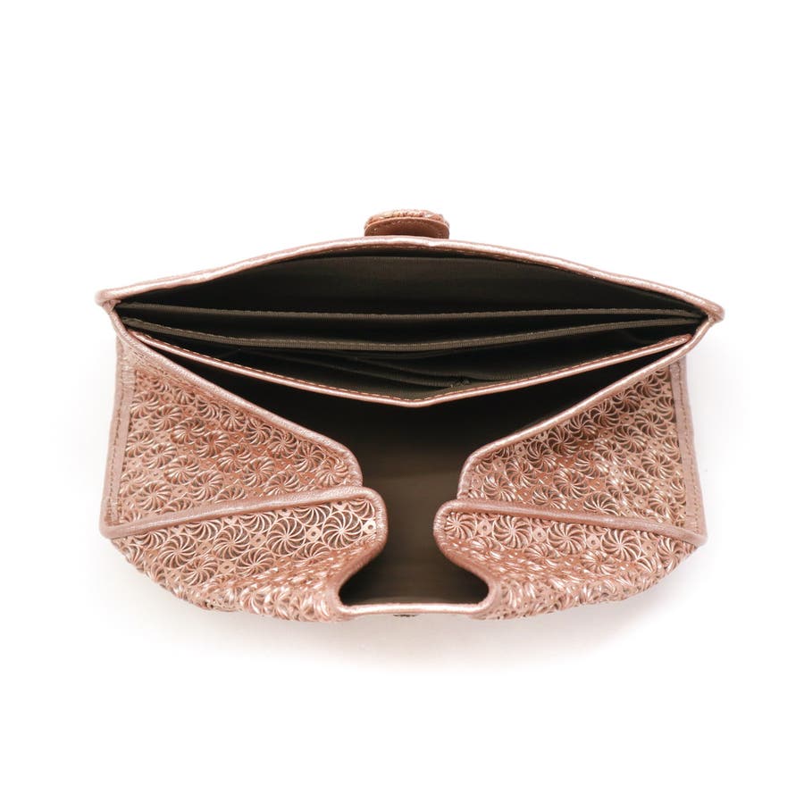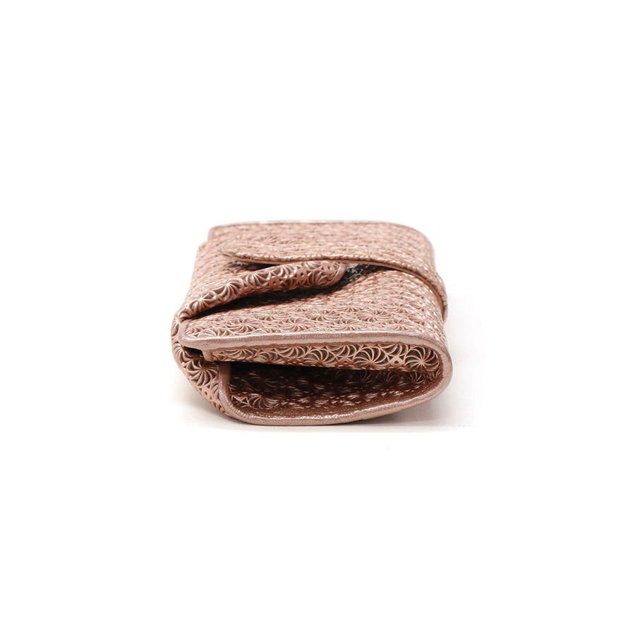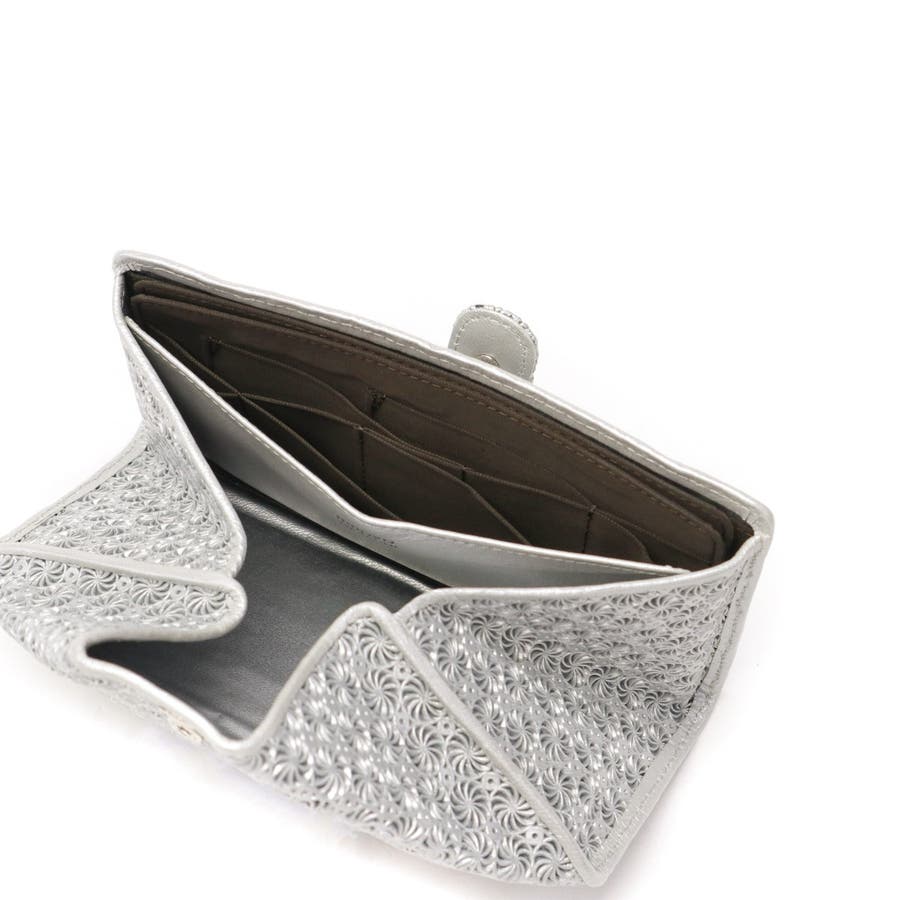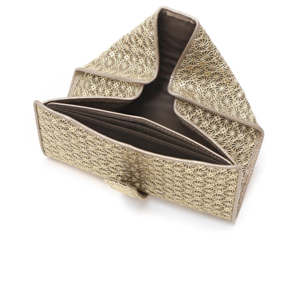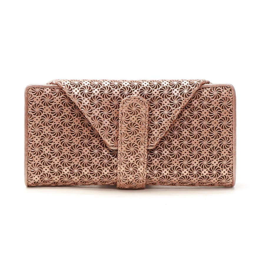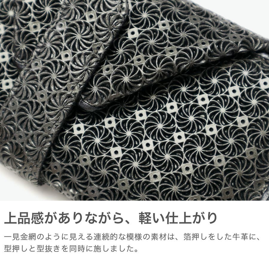 独特なスクリューデザインが人気の『GIRASOLE/ジラソーレ』シリーズの長財布ミニ。牛革に型押しと型抜きを施した、上品でいて軽やかな仕上がりが特徴です。スナップボタンを外すとお財布全体が箱型の作りになっており、小銭入れのように開きます。また蛇腹のように仕切りが重なり合うカードポケットも魅力。エレガンスと実用性を兼ね備え、日常のスタイルを一層引き立てます。