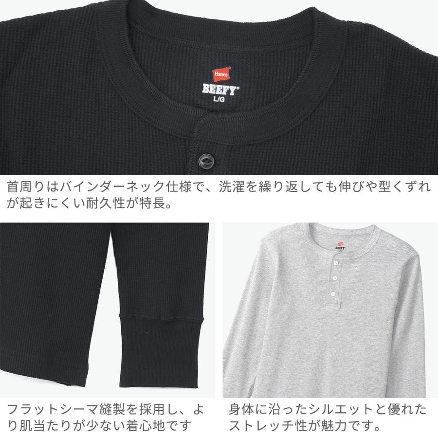 環境に配慮して生産されたサステナブルなアメリカ綿を使用し『BEEFY』のコンセプトを体現したタフなサーマルヘンリーネックロングスリーブ。肉厚なヘビーウェイトワッフル生地を採用し、高い耐久性と伸縮性を両立しています。ヘンリーネックの首元はバインダーネック仕様で、洗濯を重ねても伸びや型崩れしにくい仕上がり。脇や袖下にはフラットシーマ縫製を施し、肌当たりの良さにも配慮。身体に沿うシルエットと快適なフィット感が魅力の一枚です。